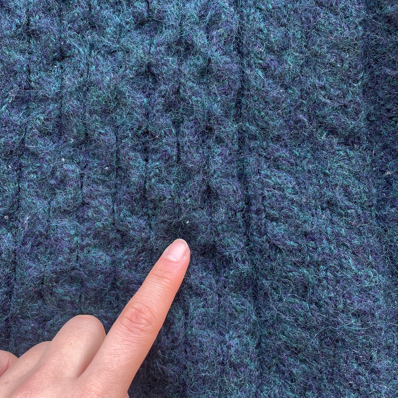 写真では分かりにくいですが、グリーンとネイビーの毛糸で編まれています