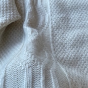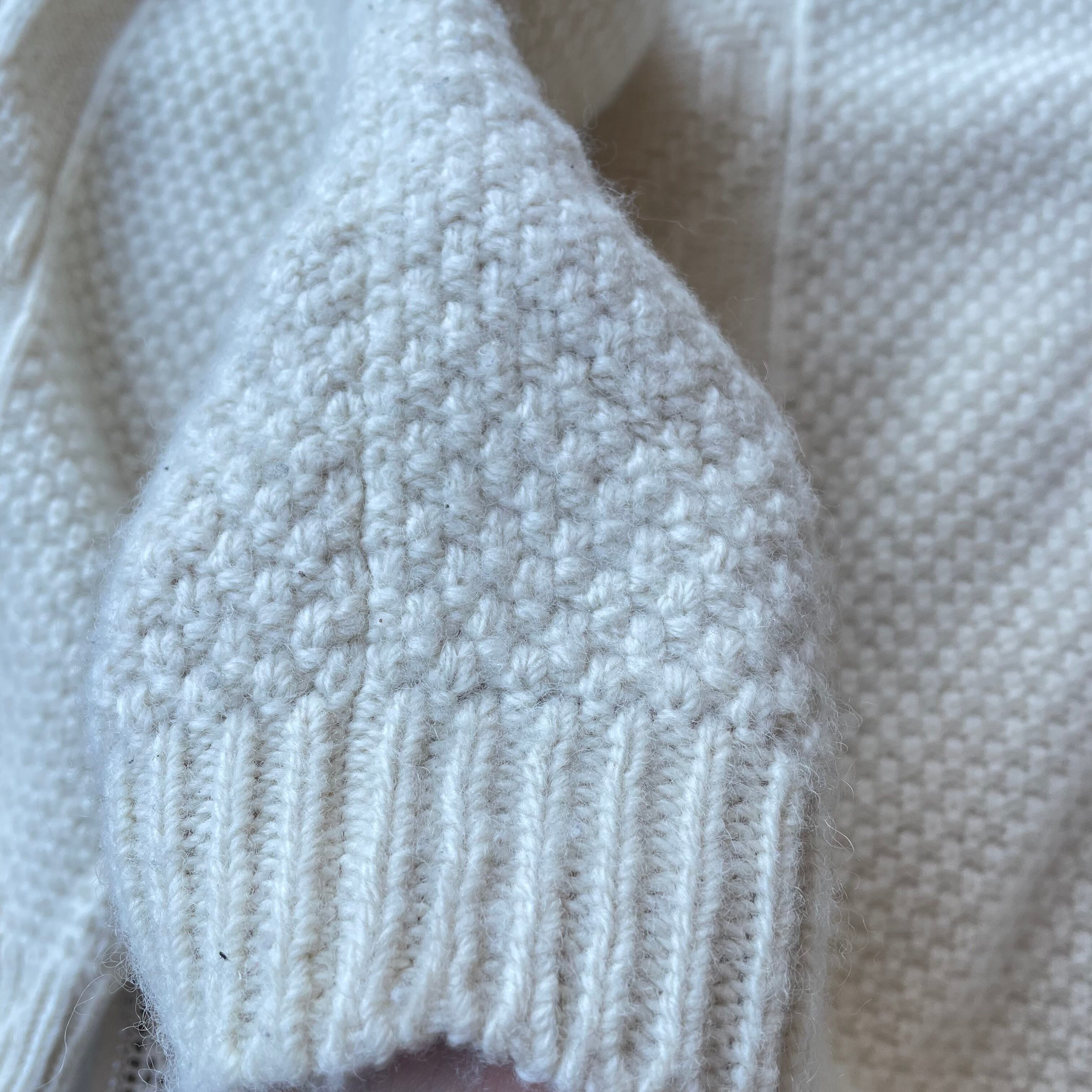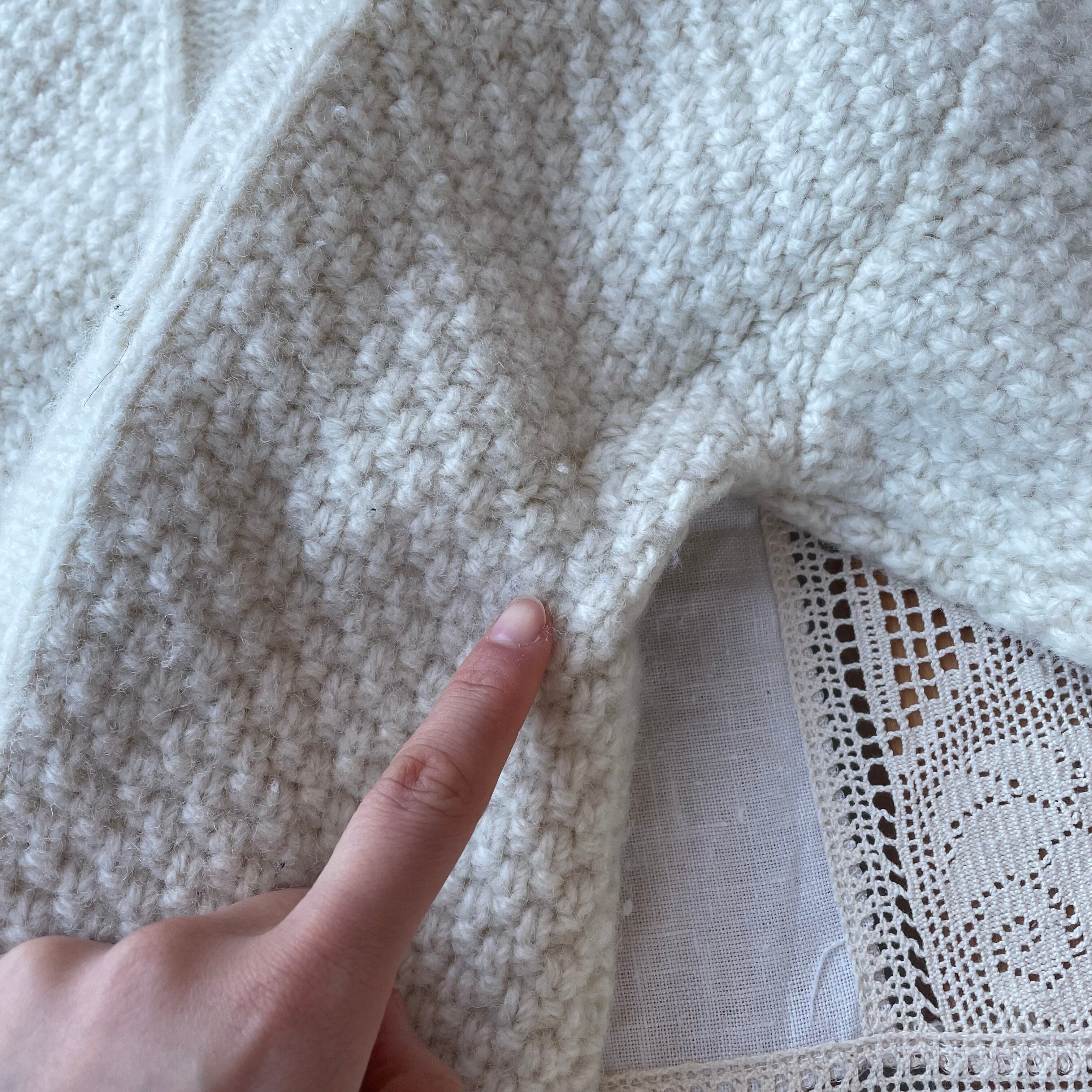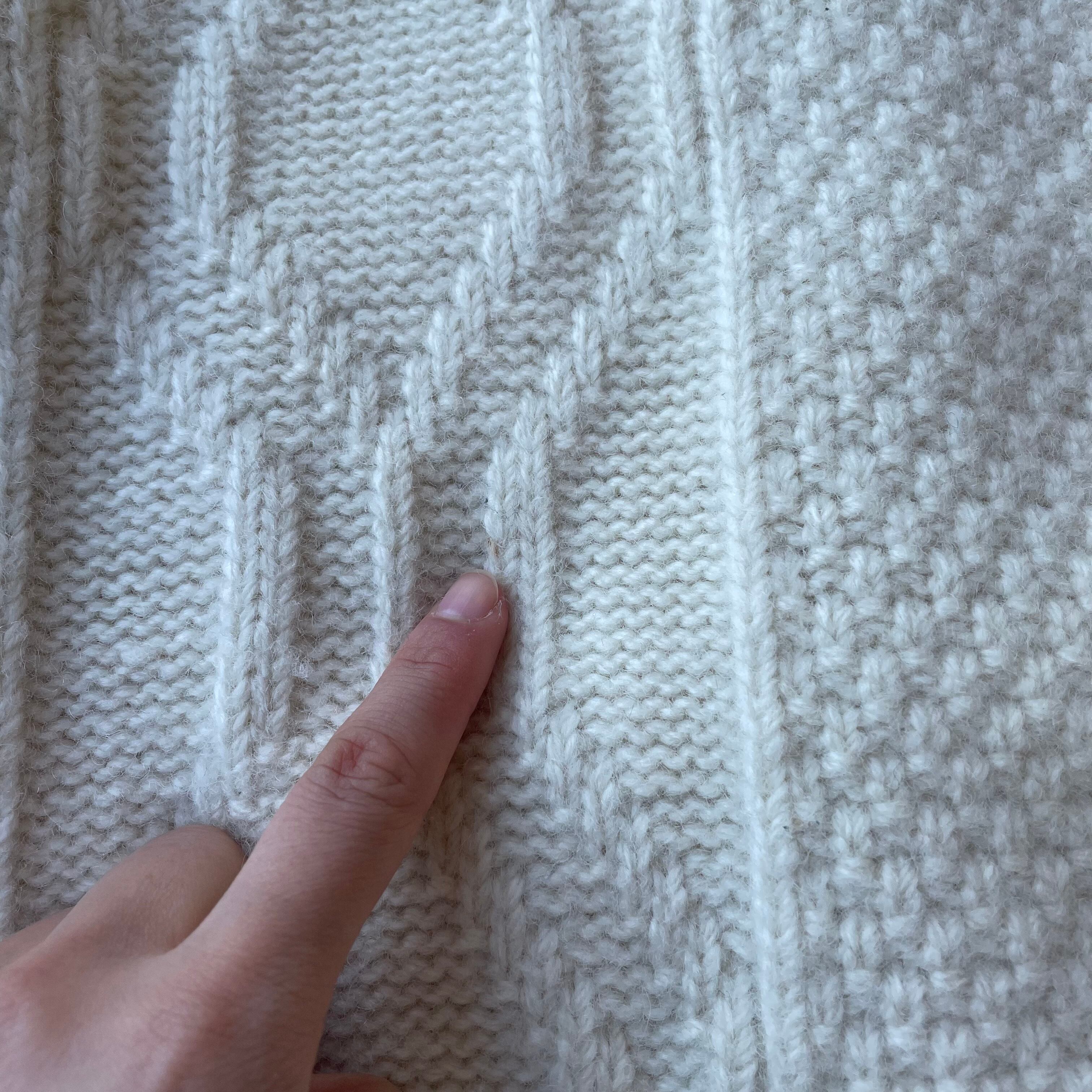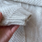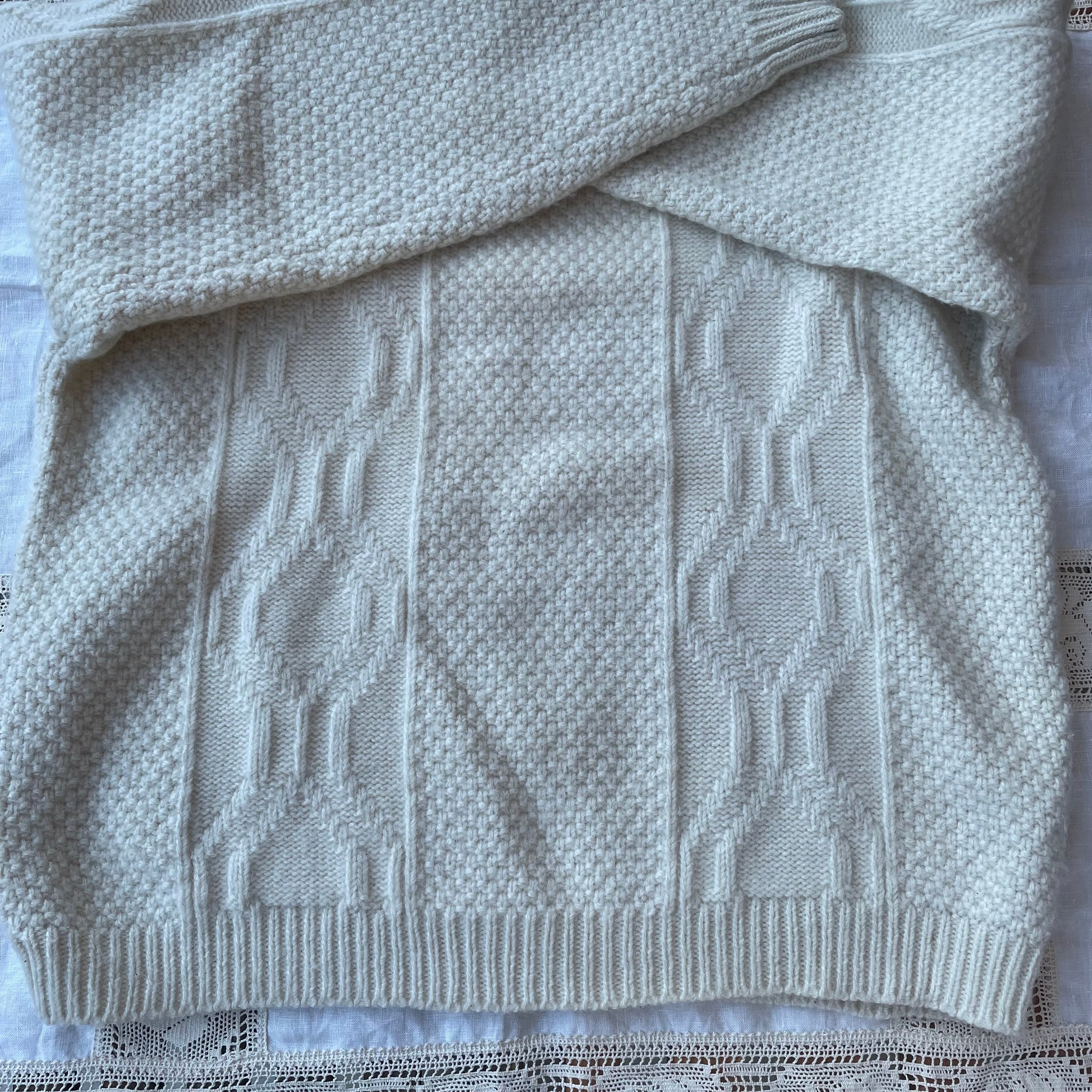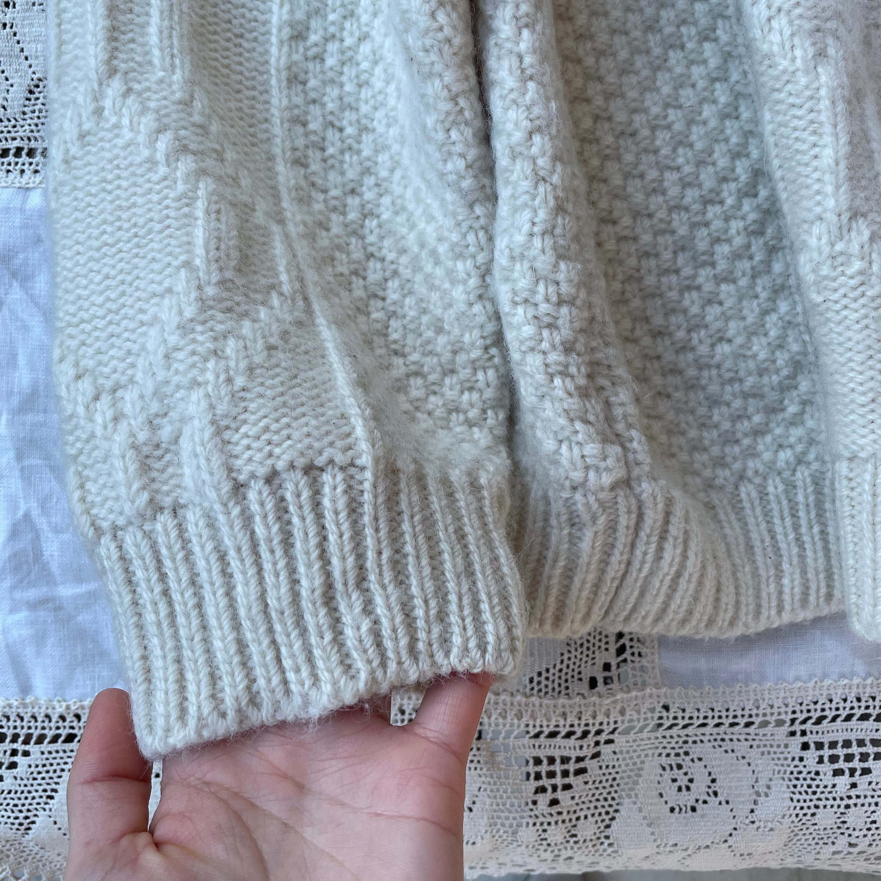 トリニティステッチ編み模様のアランニットです。表記サイズがLでゆったりしているので、シャツなどと重ねても可愛いです!