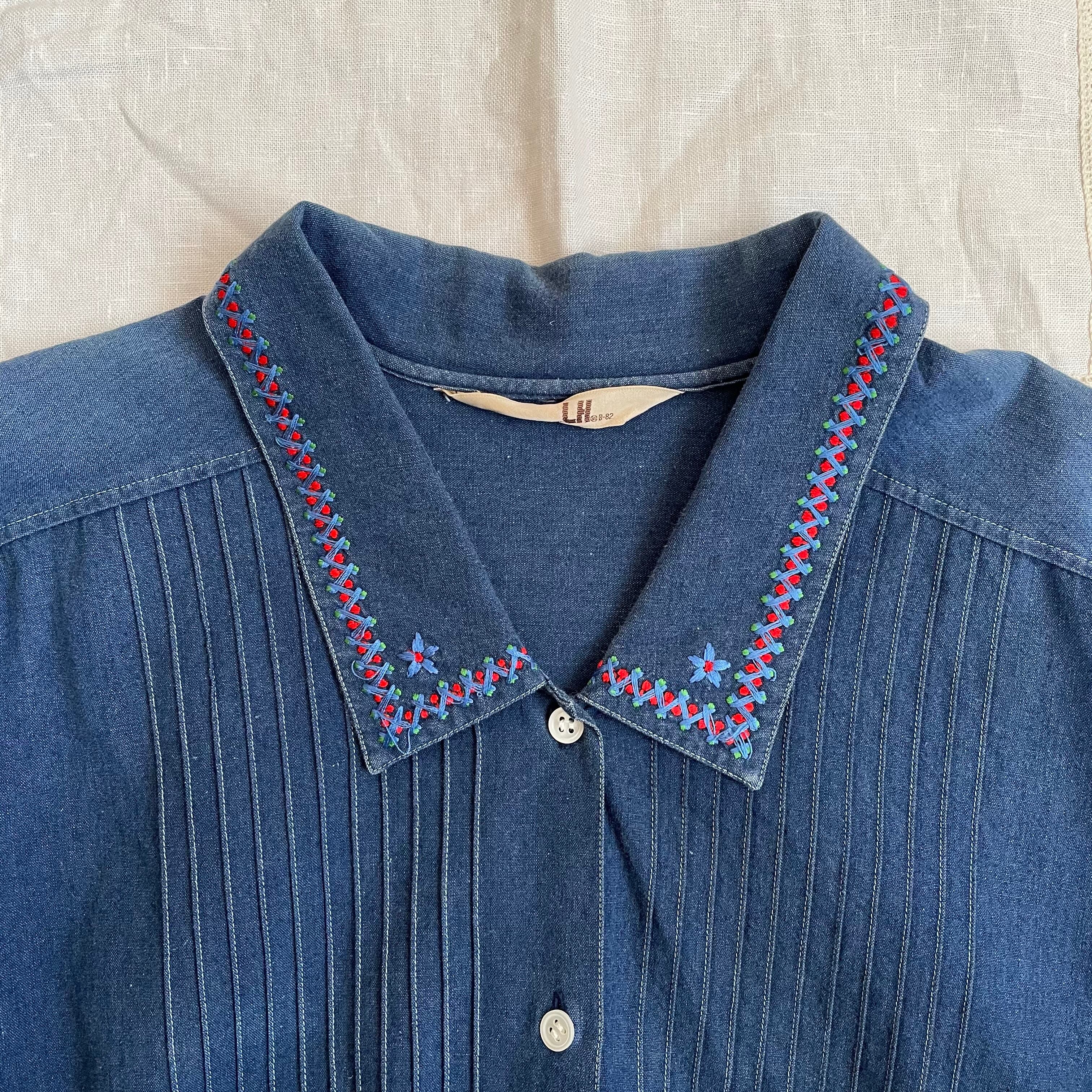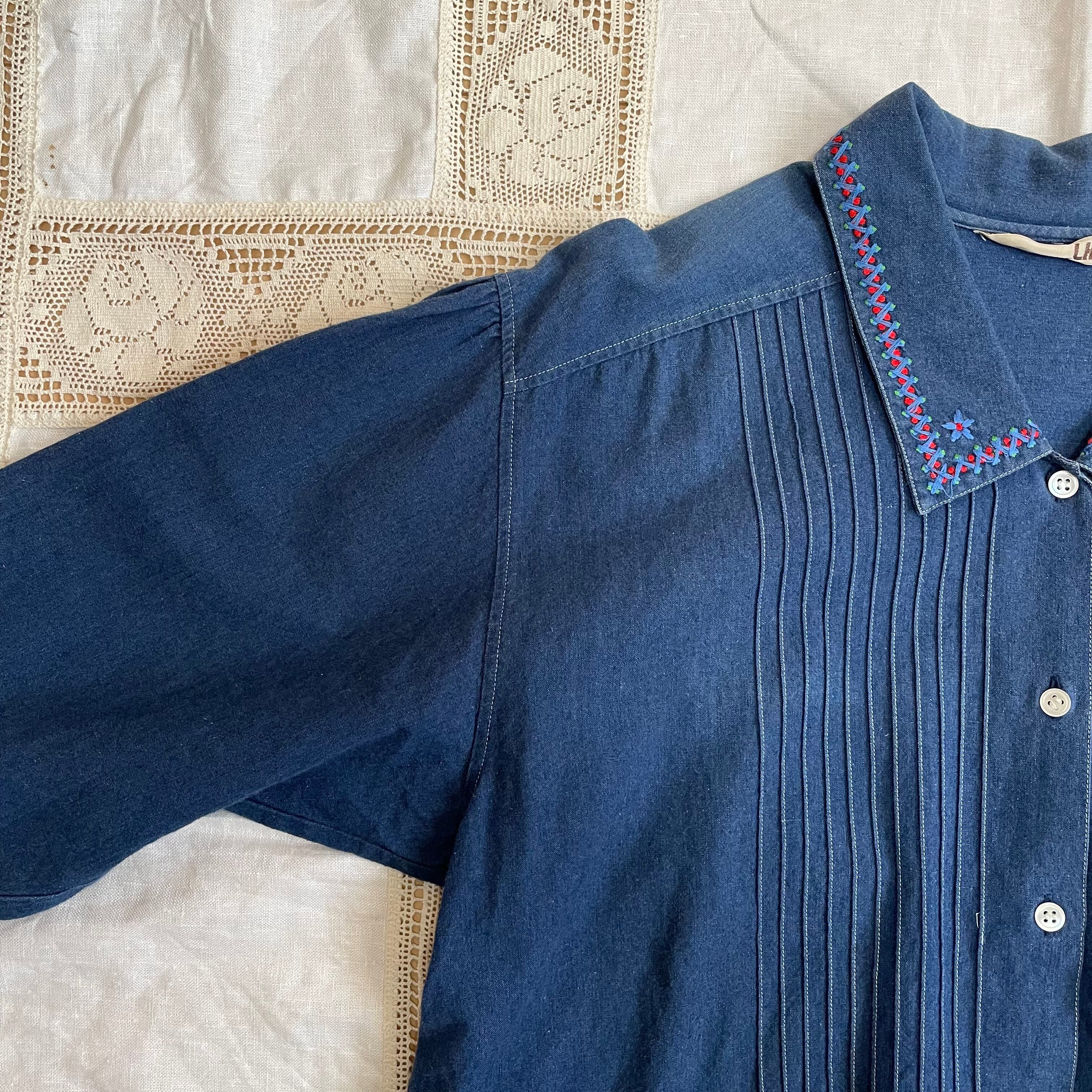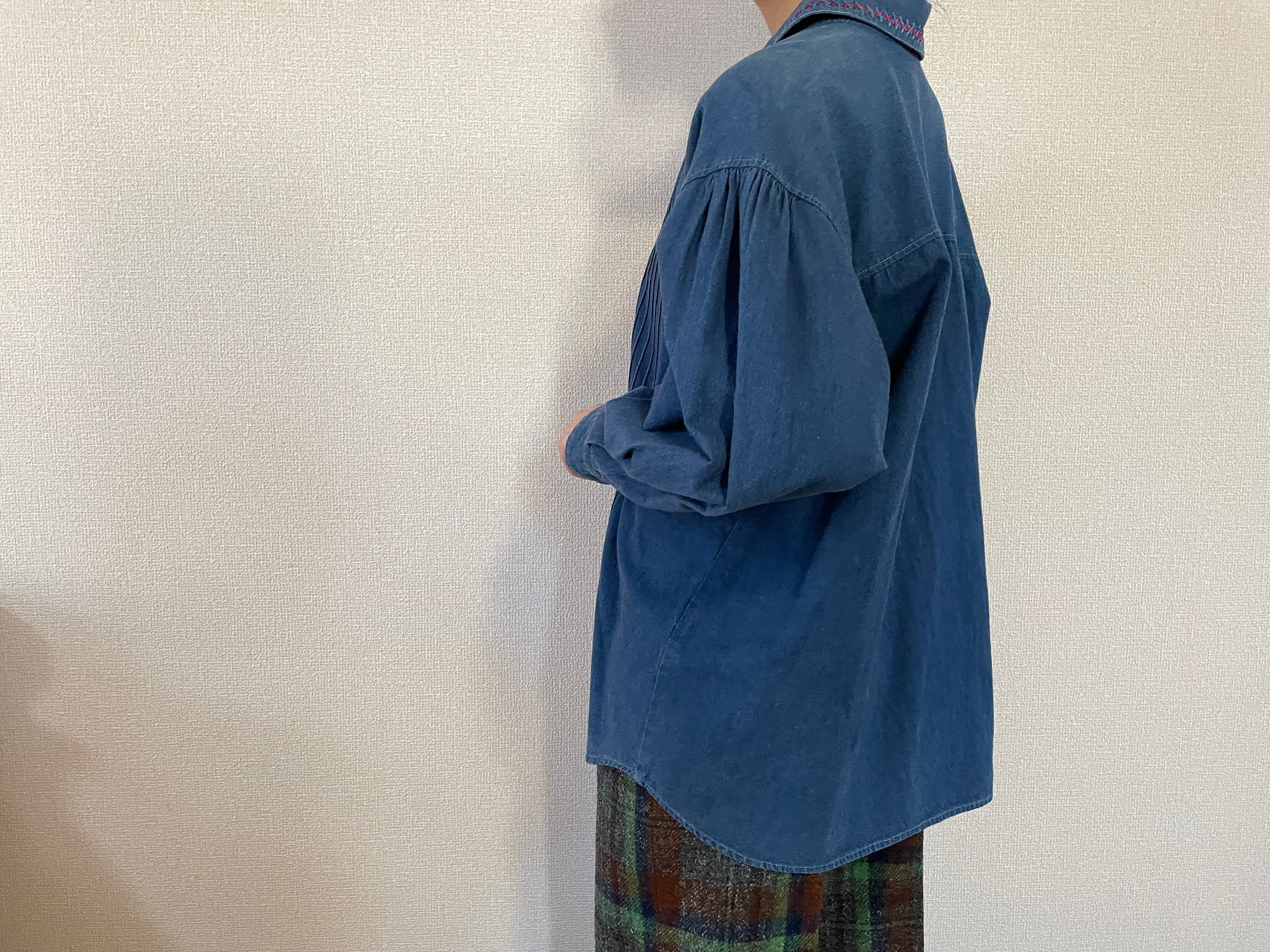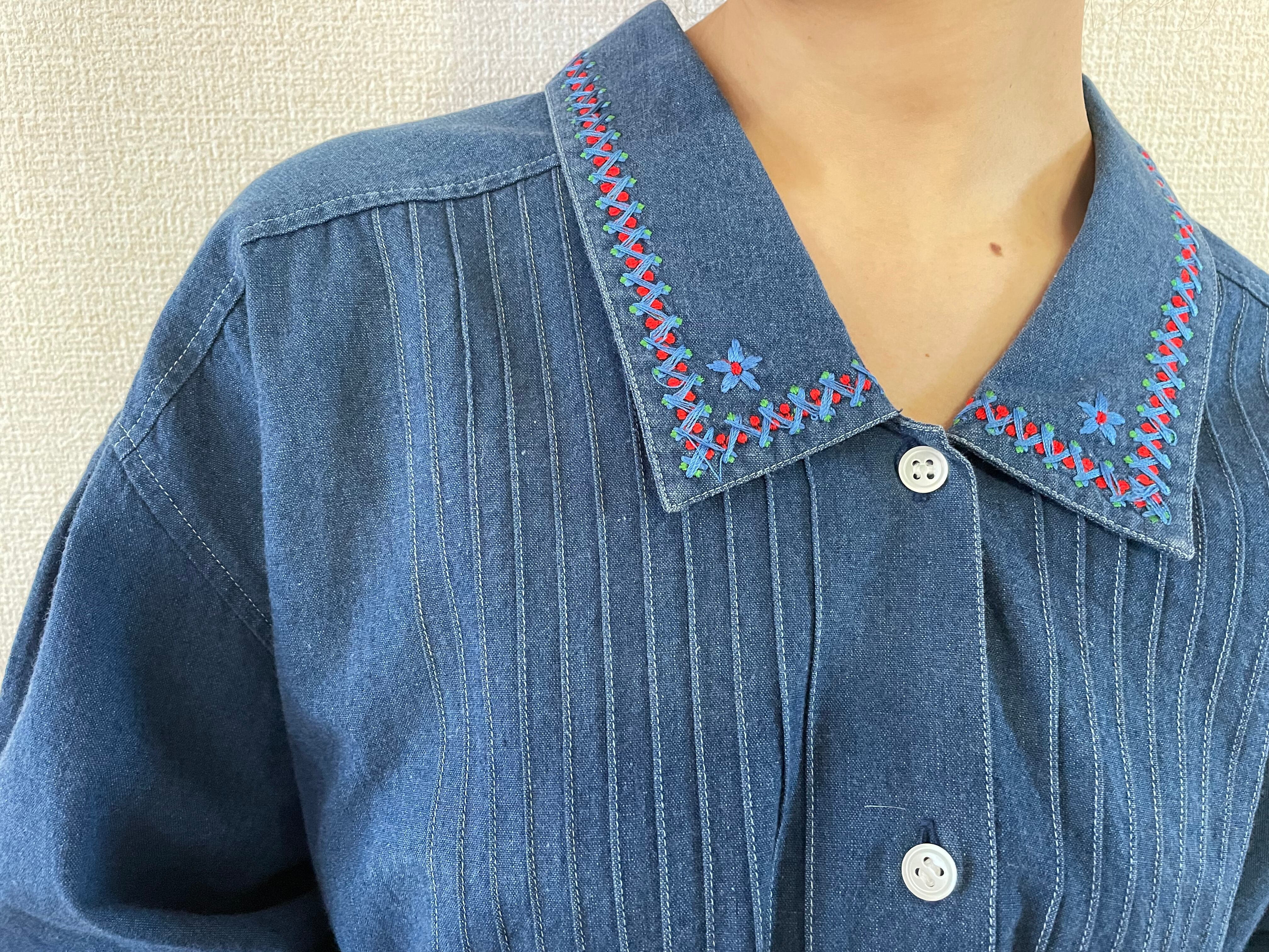 pleated denim shirt デニムシャツ 古着 レトロ 東京ブラウス 刺繍 ブルー GM175