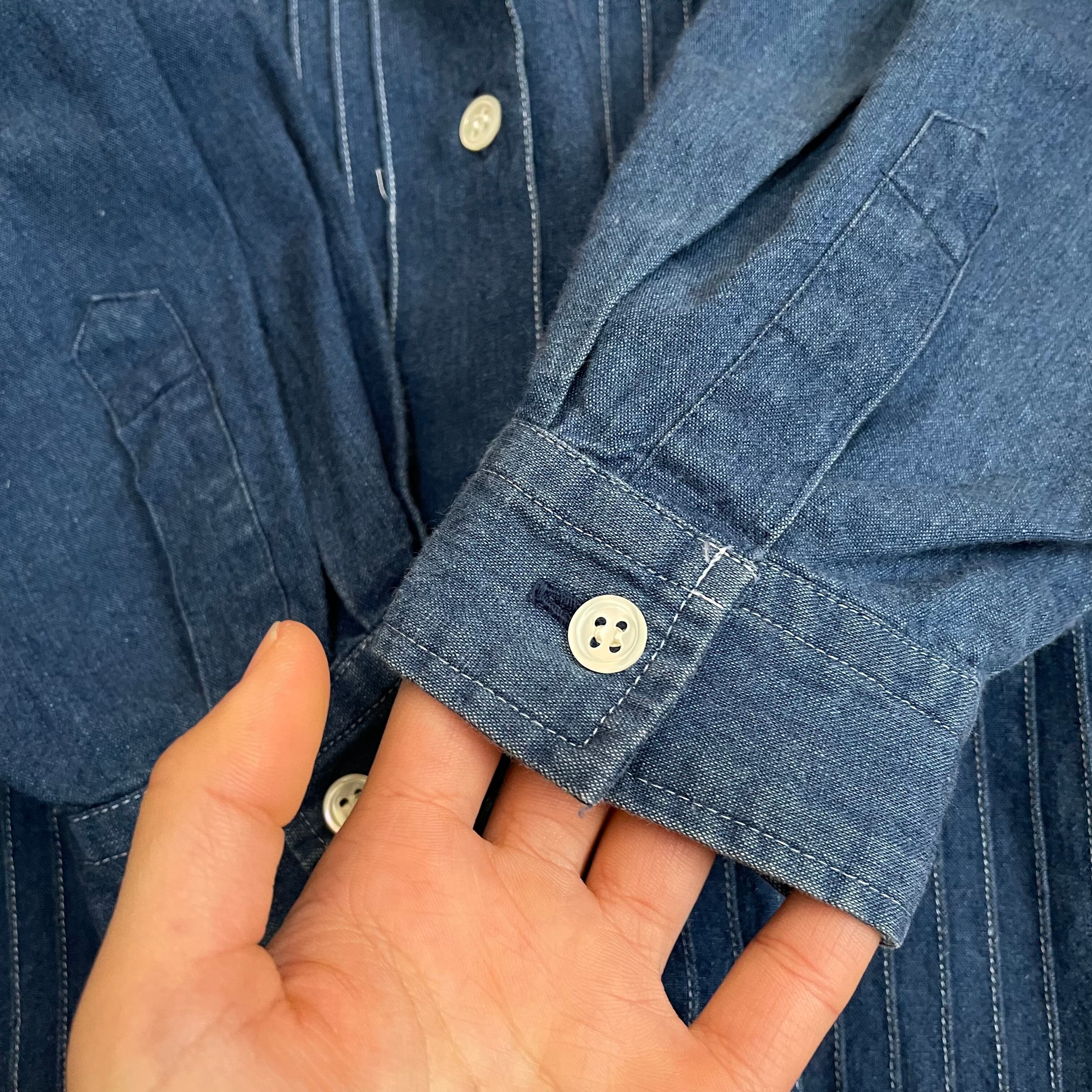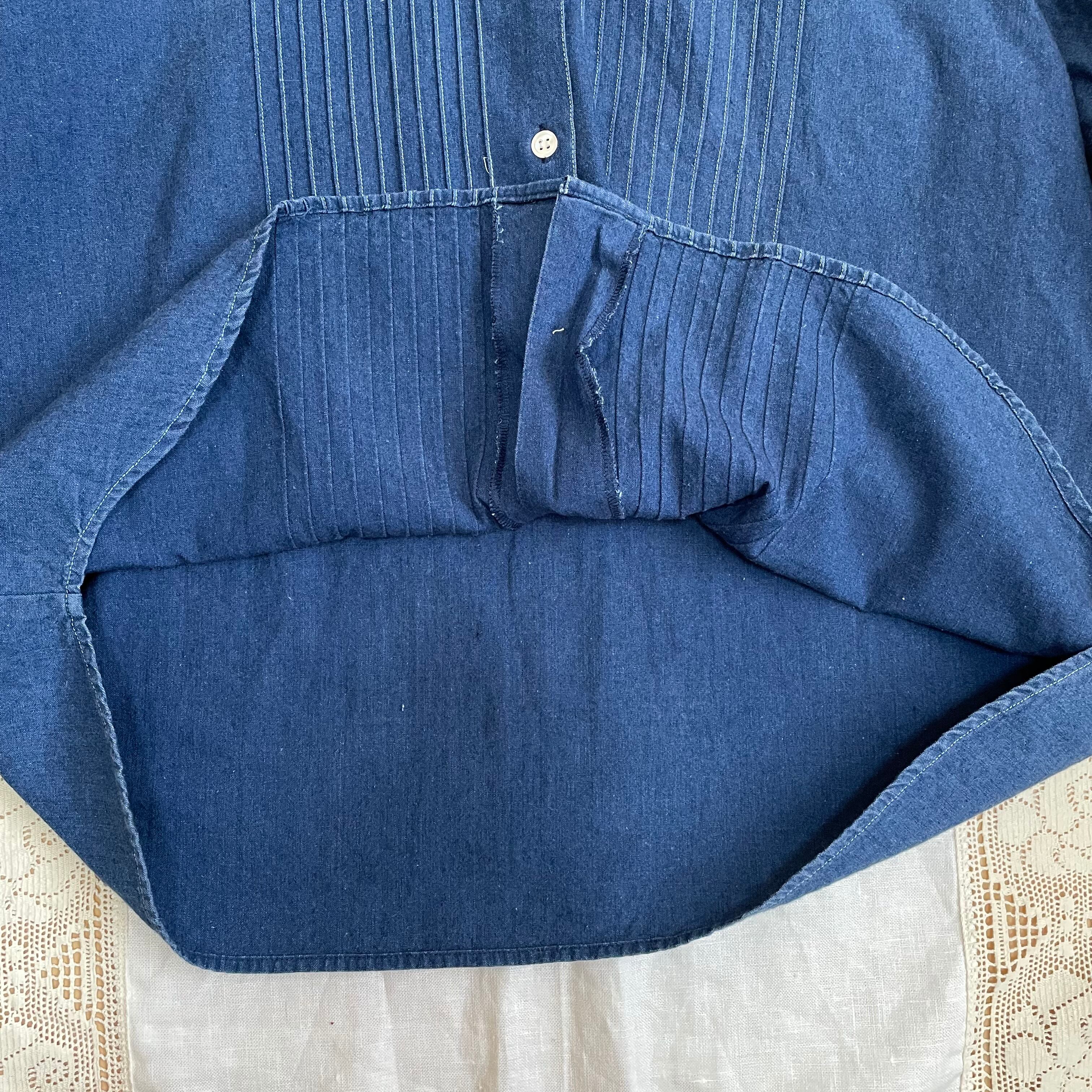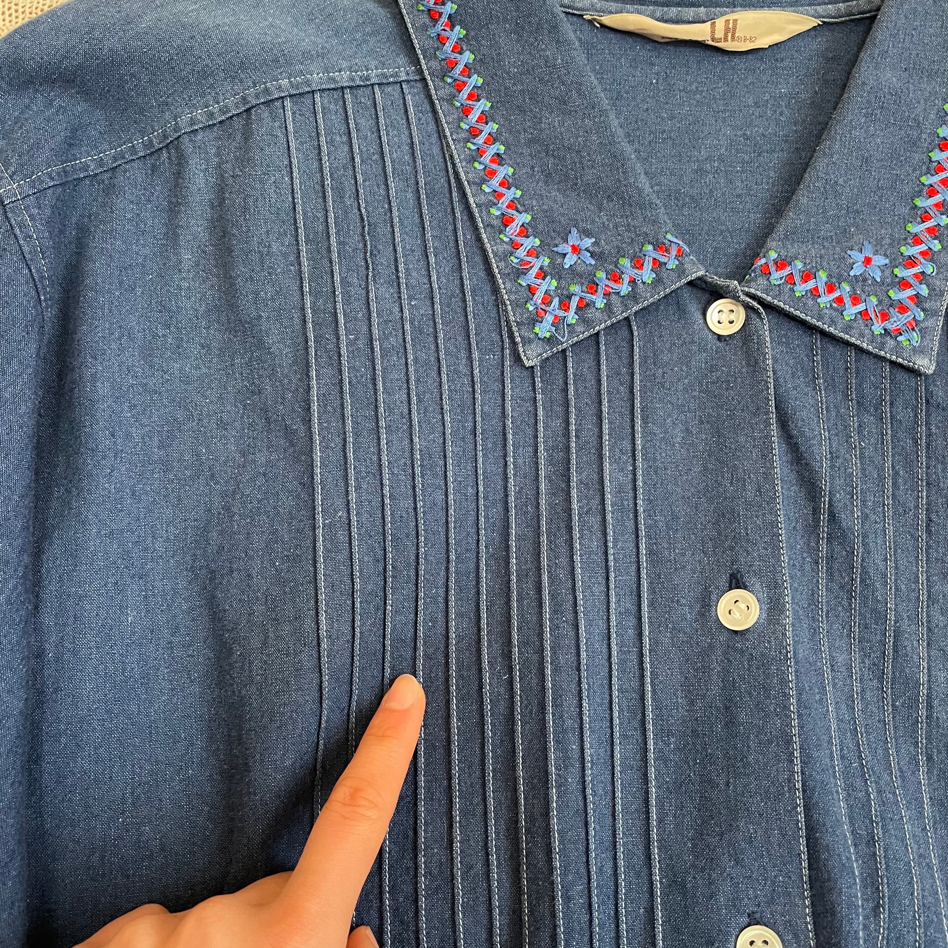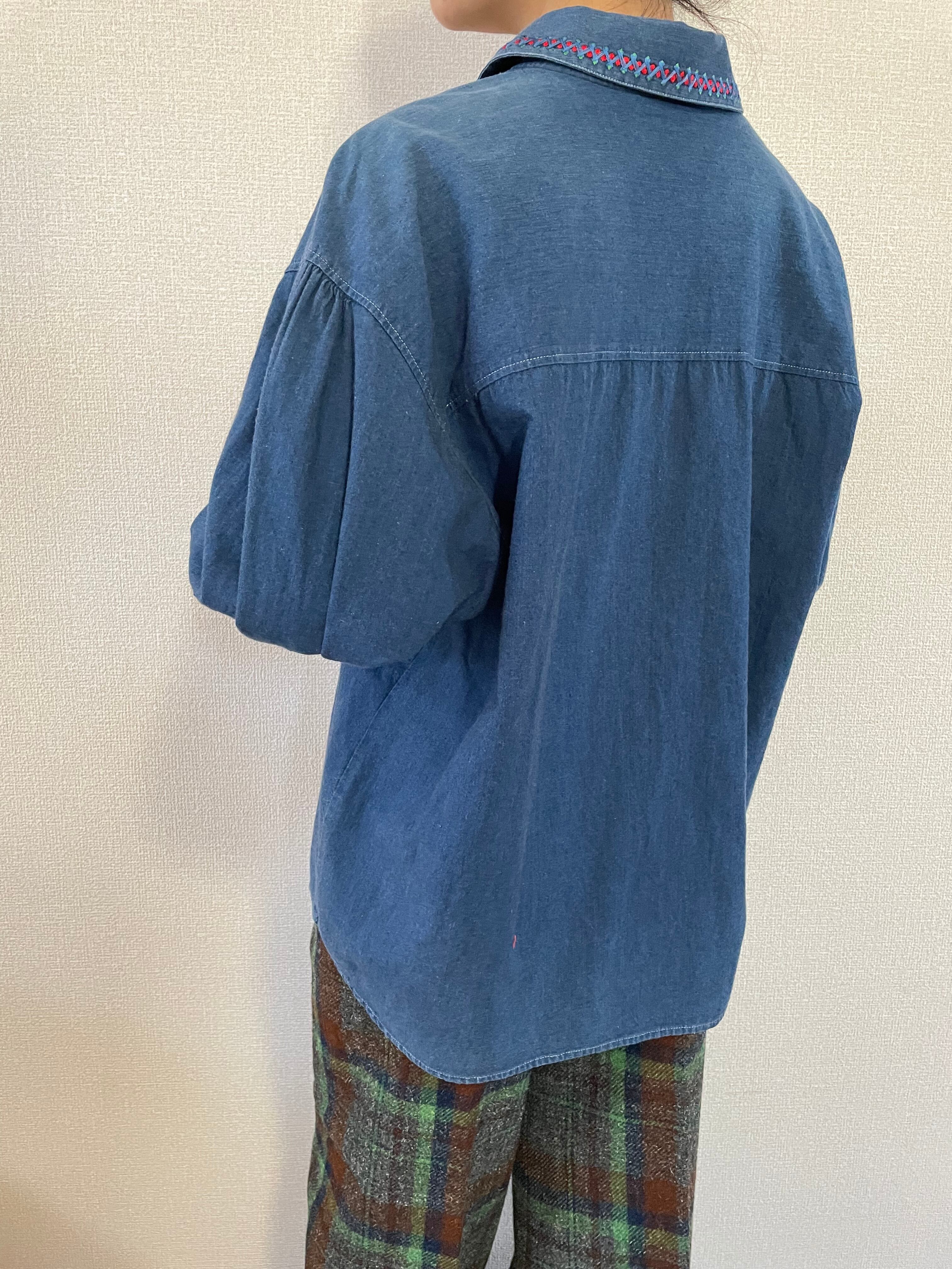 pleated denim shirt デニムシャツ 古着 レトロ 東京ブラウス 刺繍 ブルー GM175