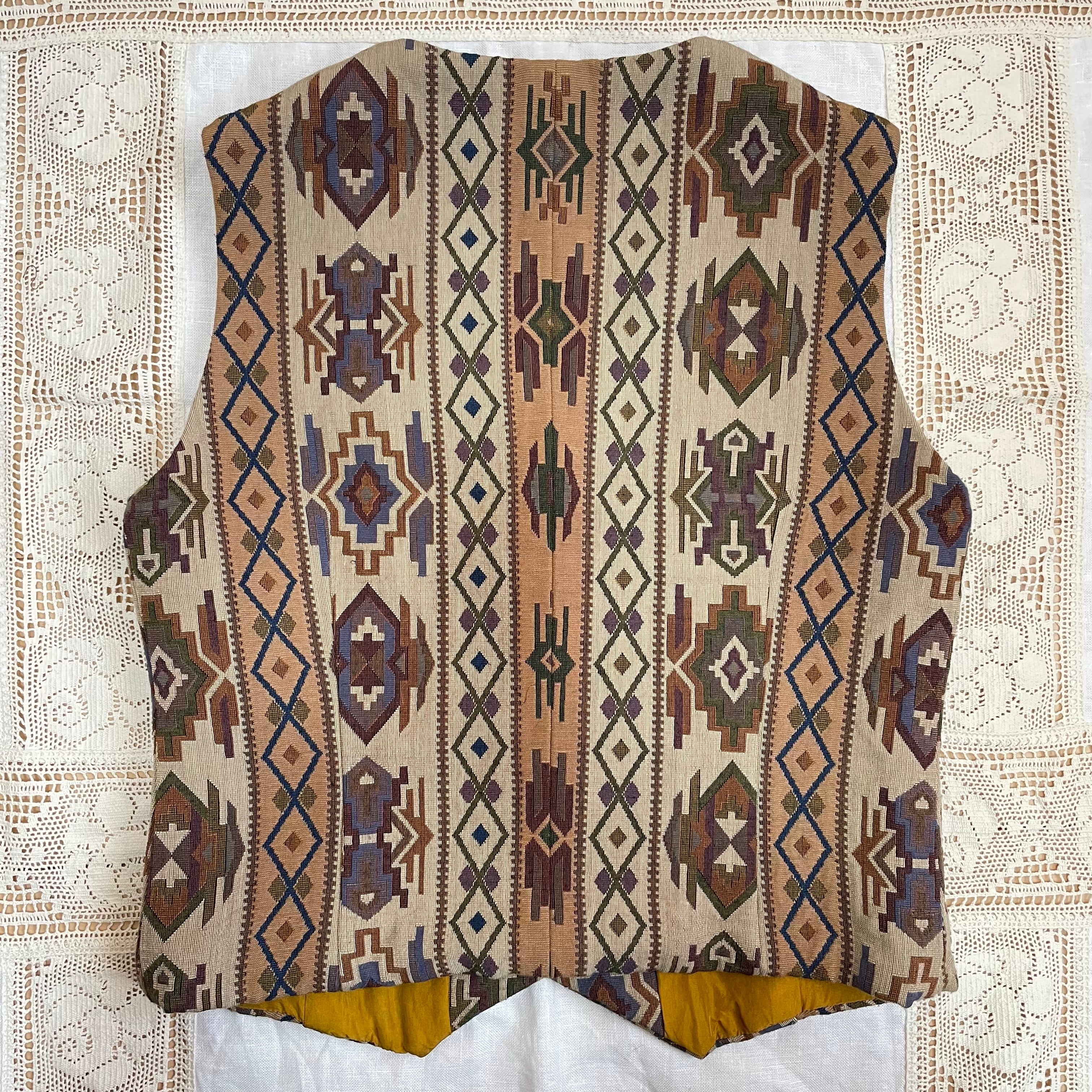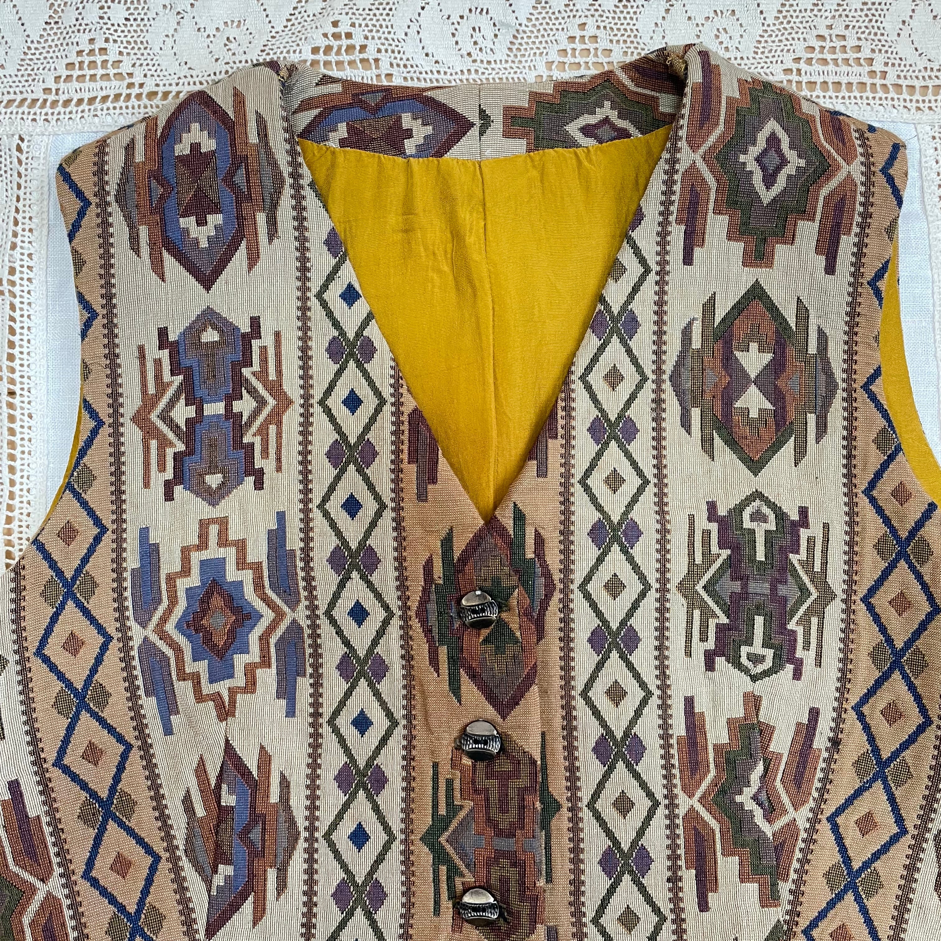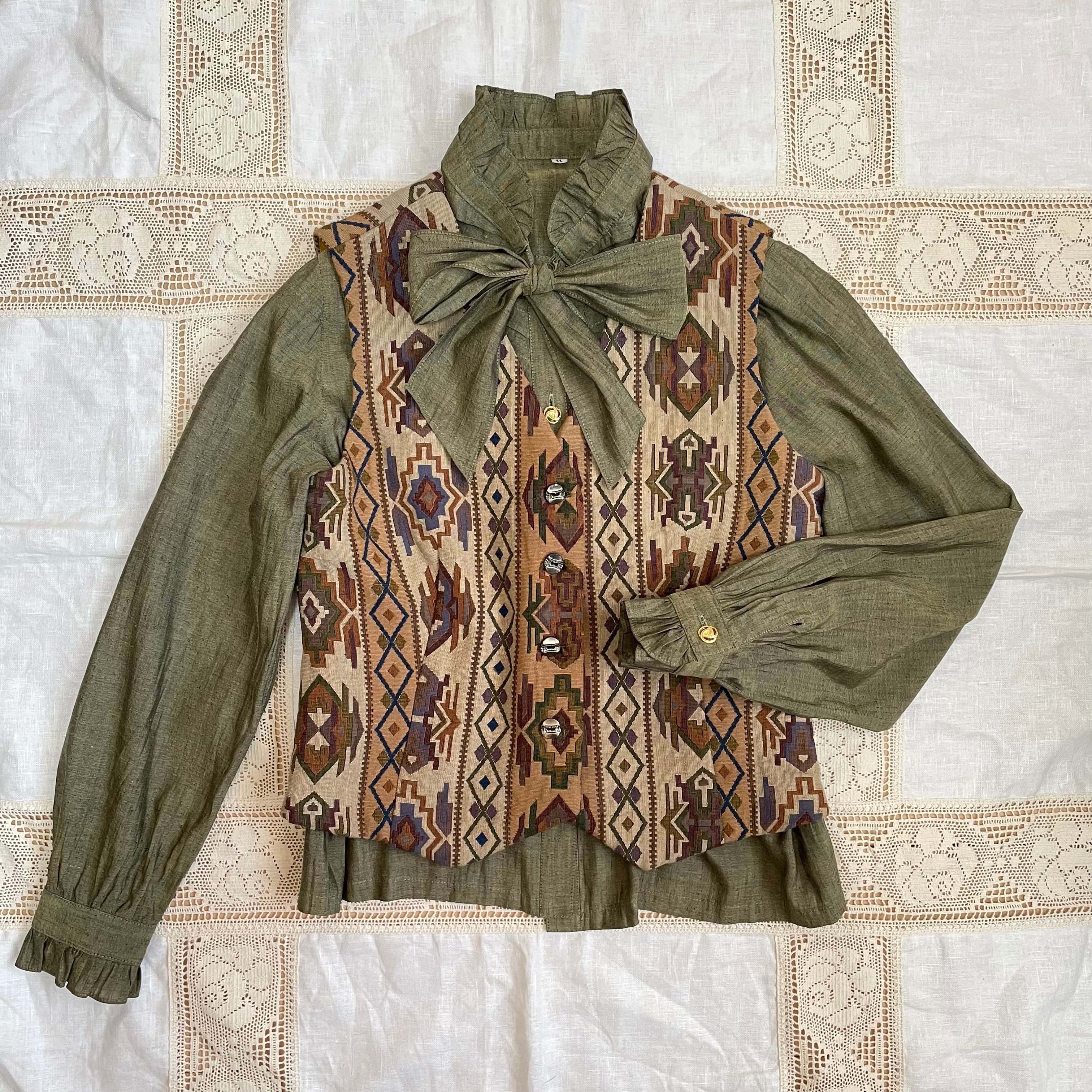 ベスト 古着 レトロ ネイティブ柄 ベージュ グリーン OF87