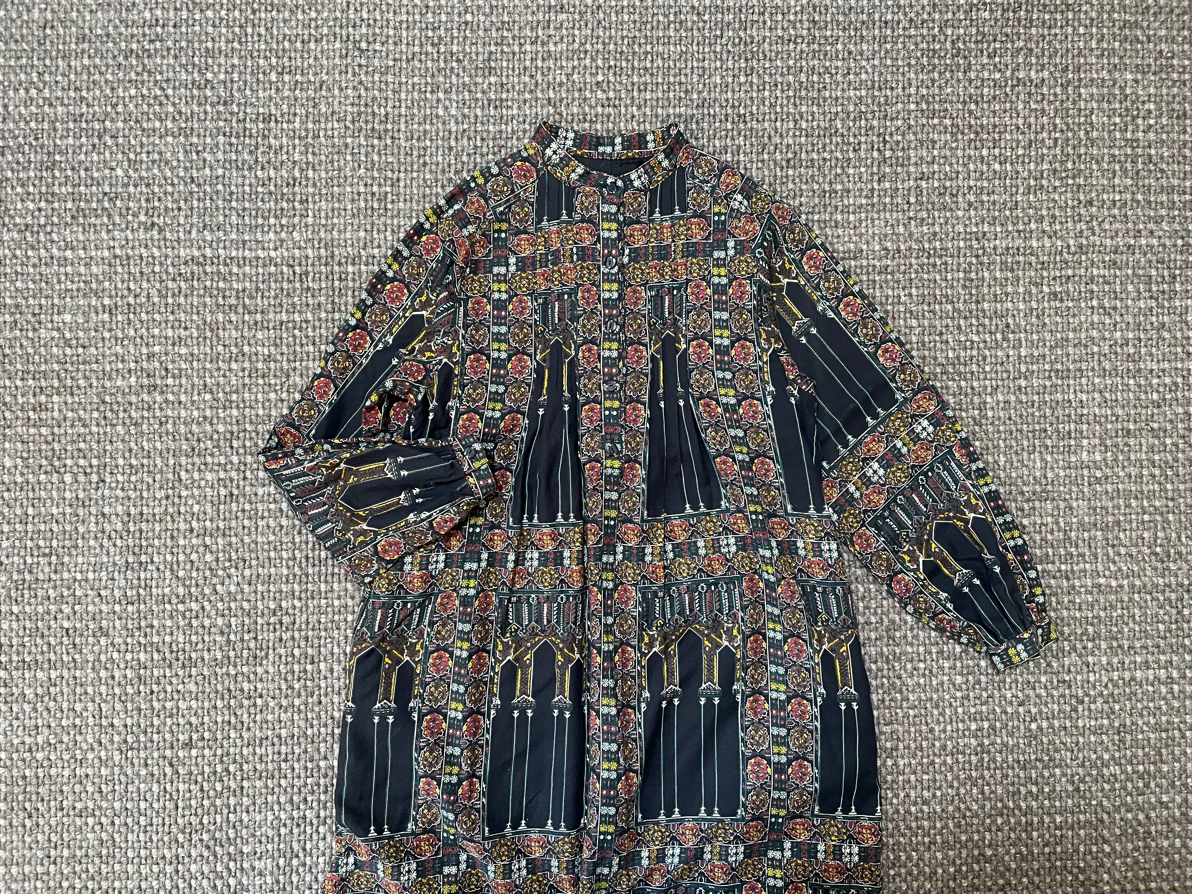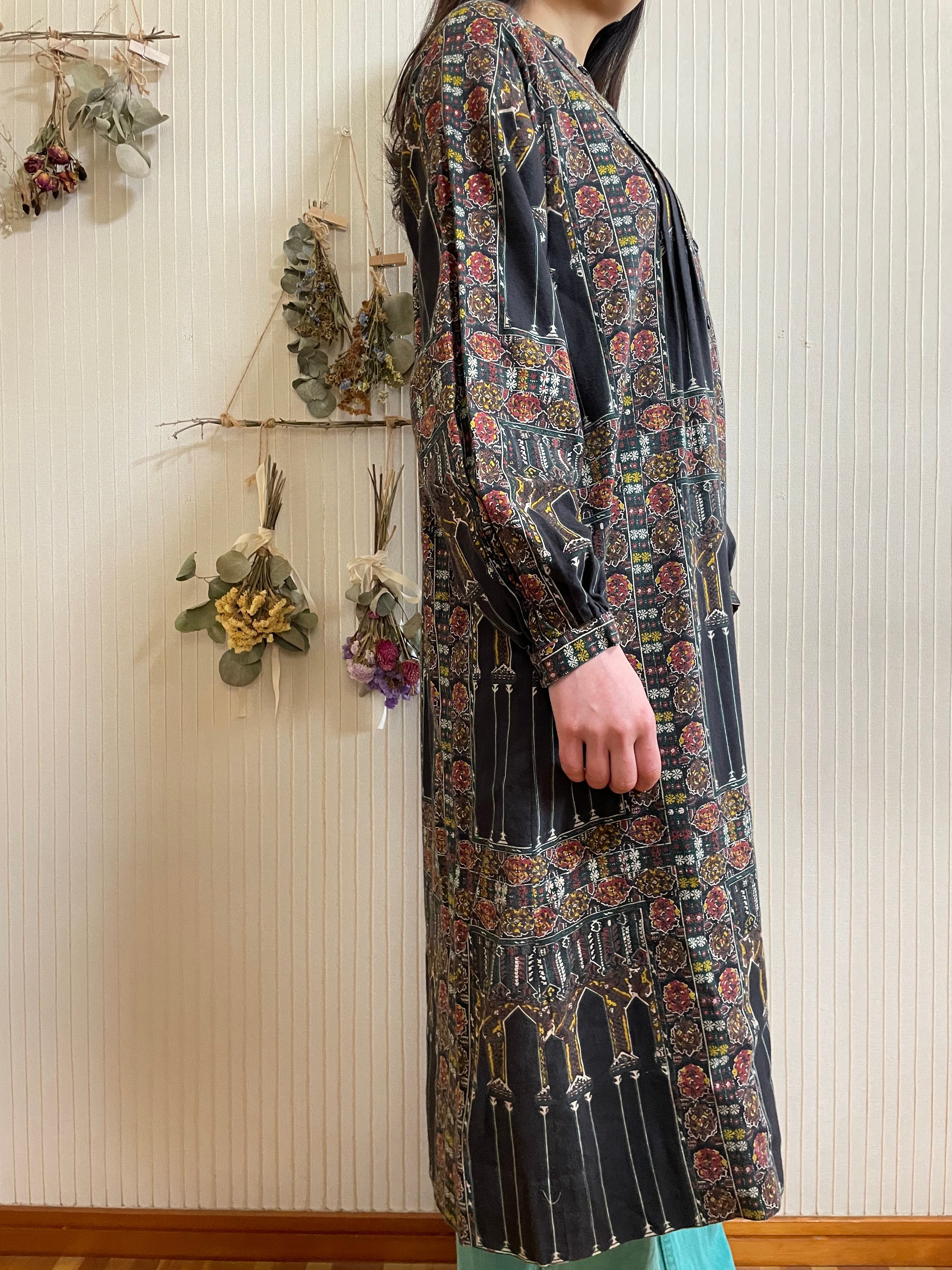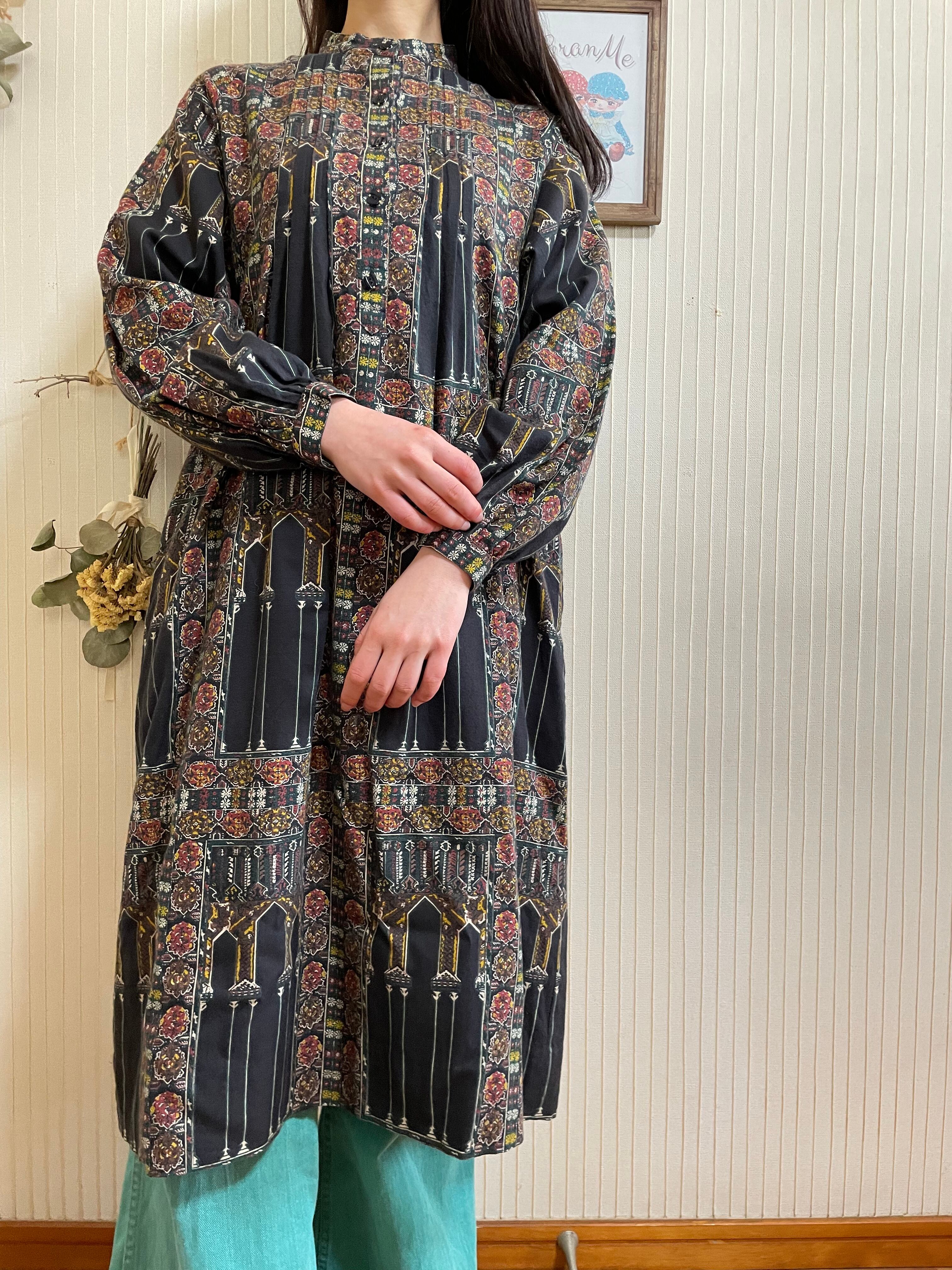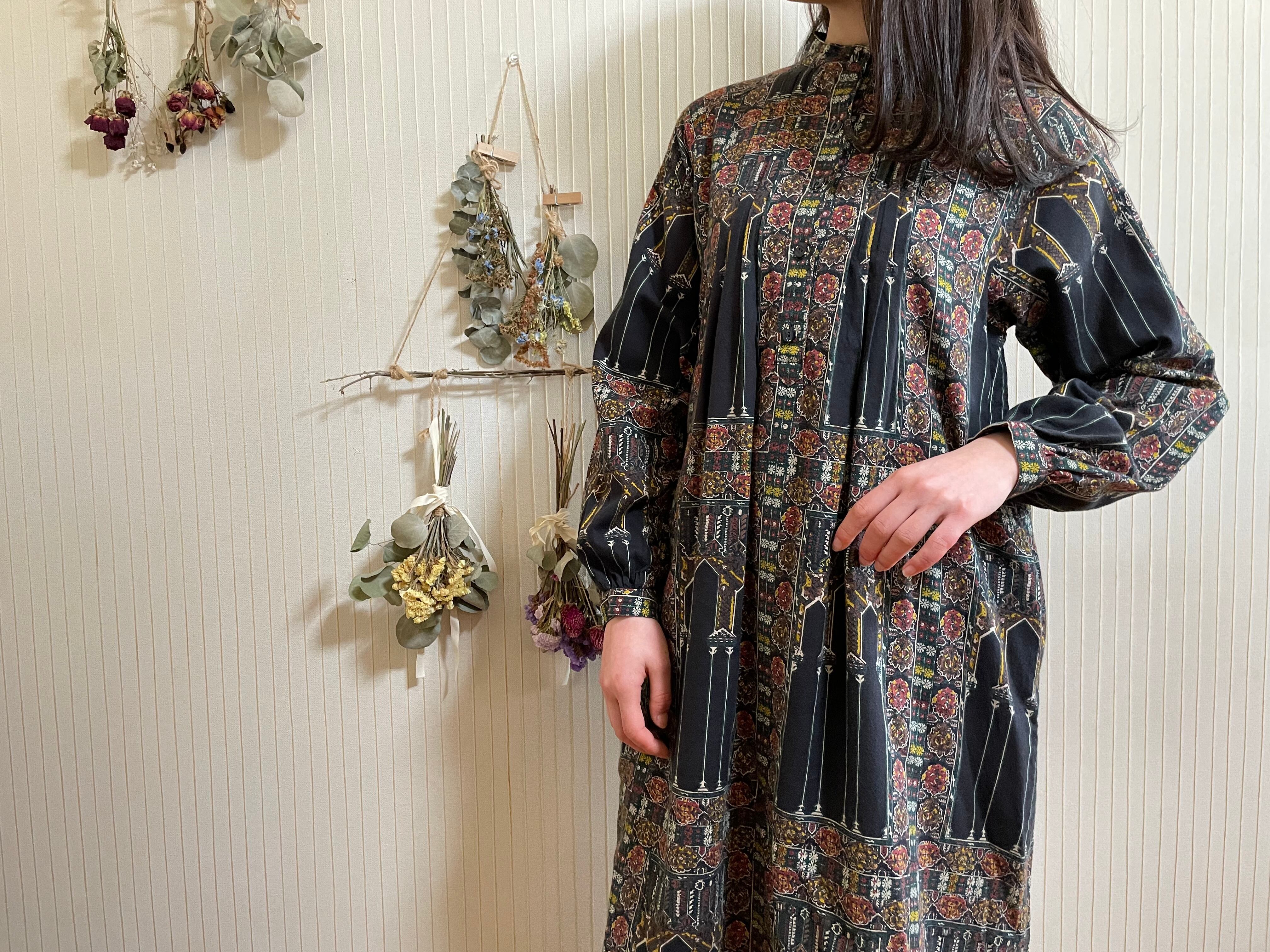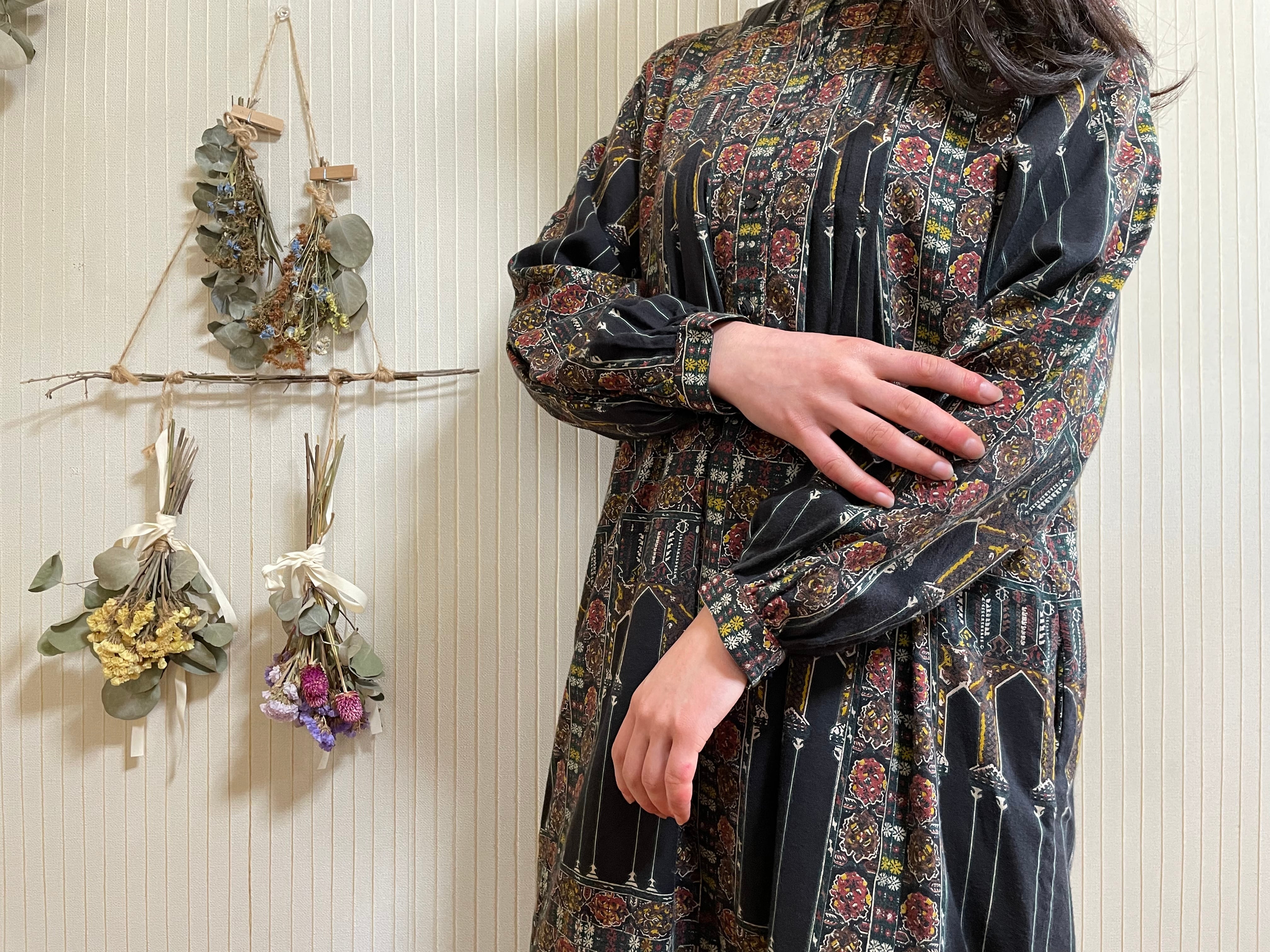 ワンピース 古着 USED レトロ 総柄 花柄 ブラック グリーン サックワンピース GM179
