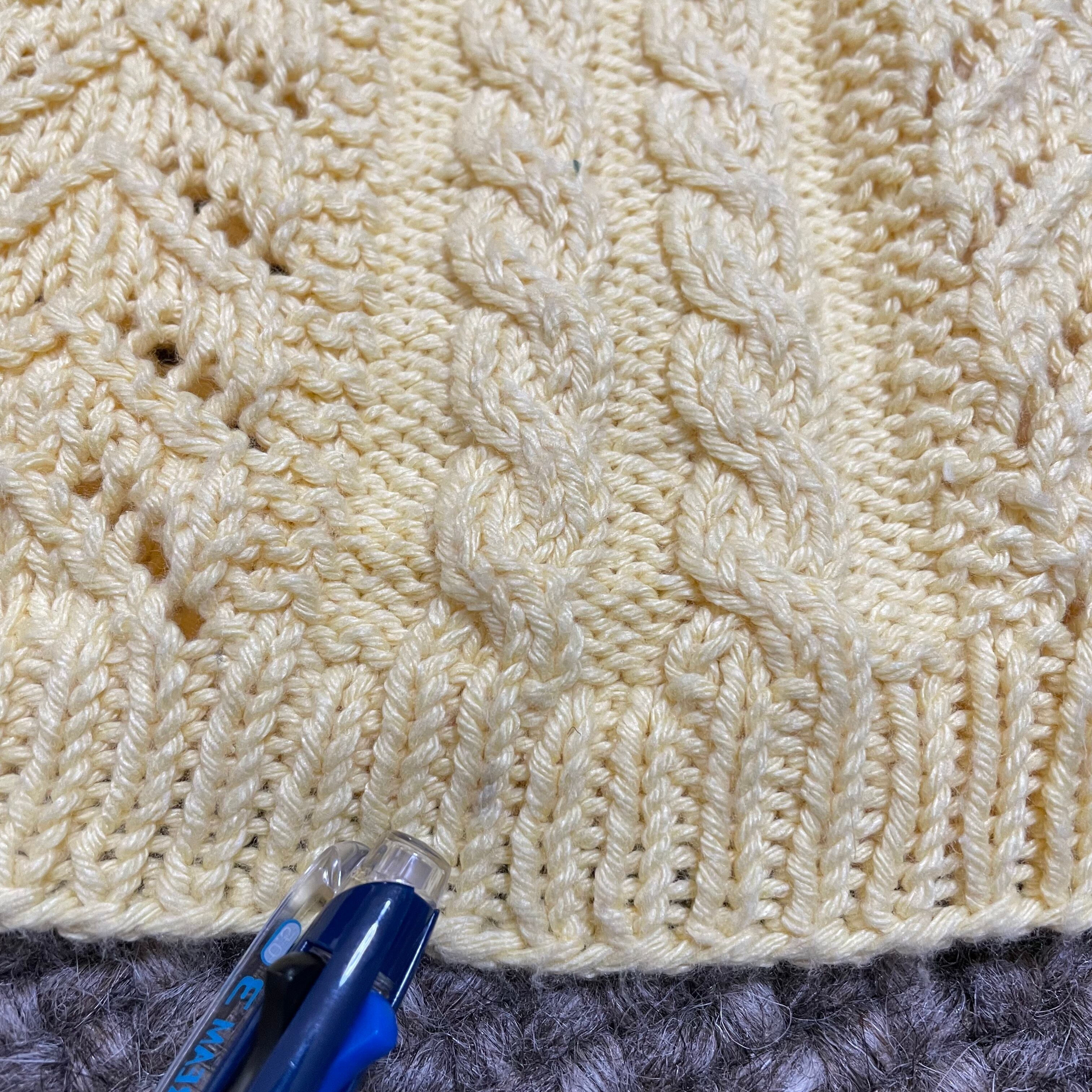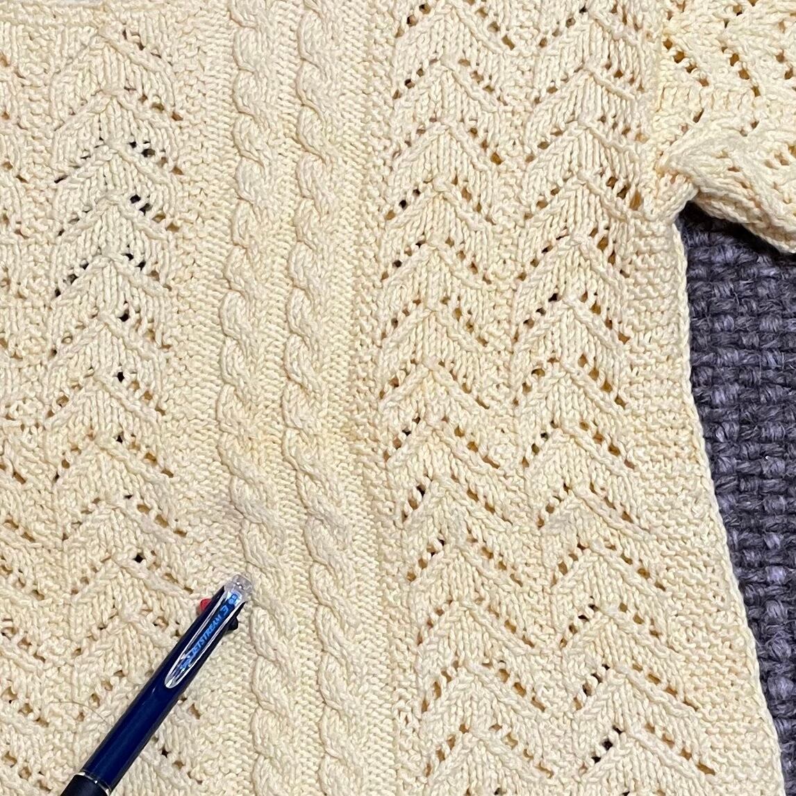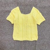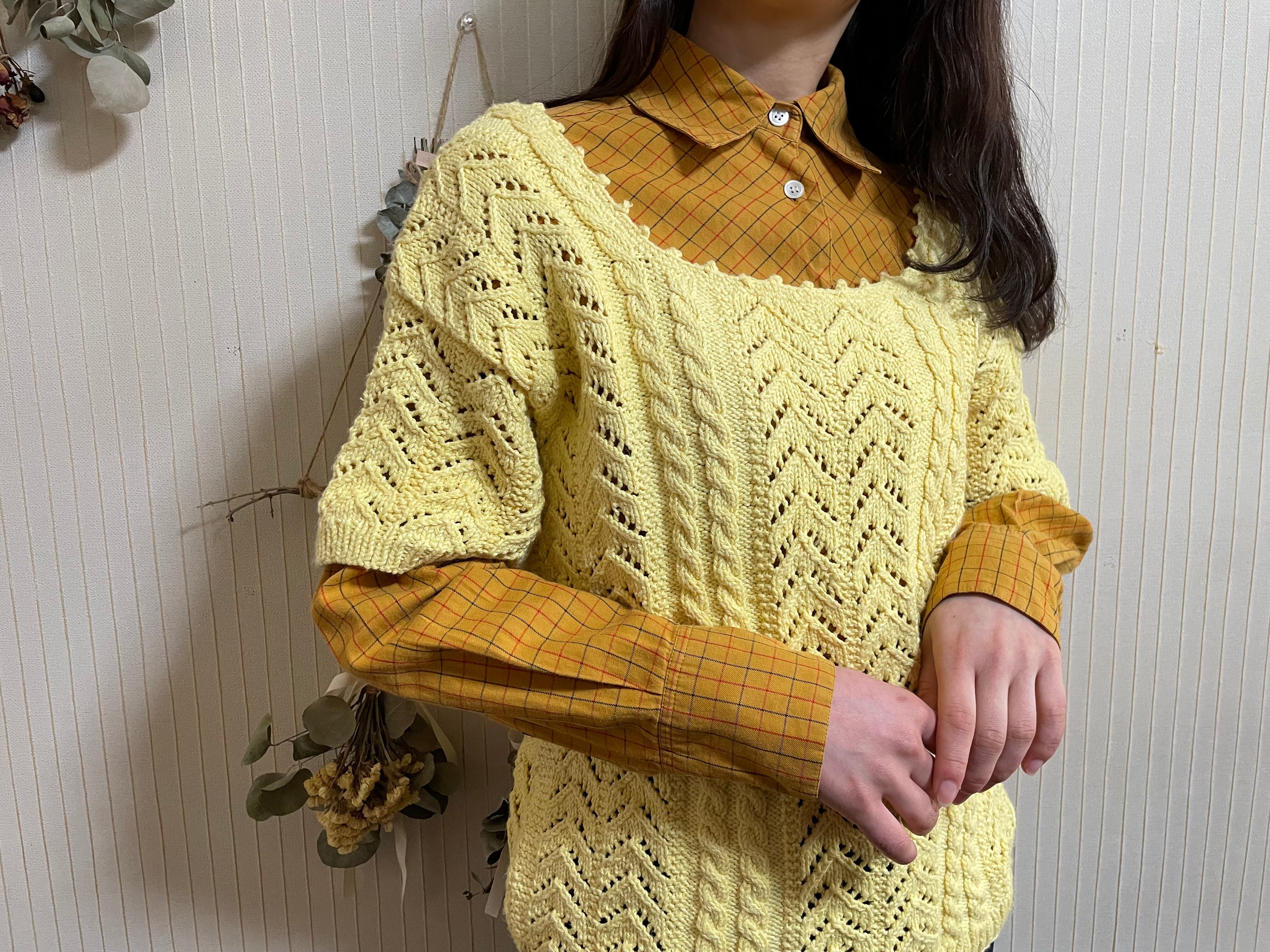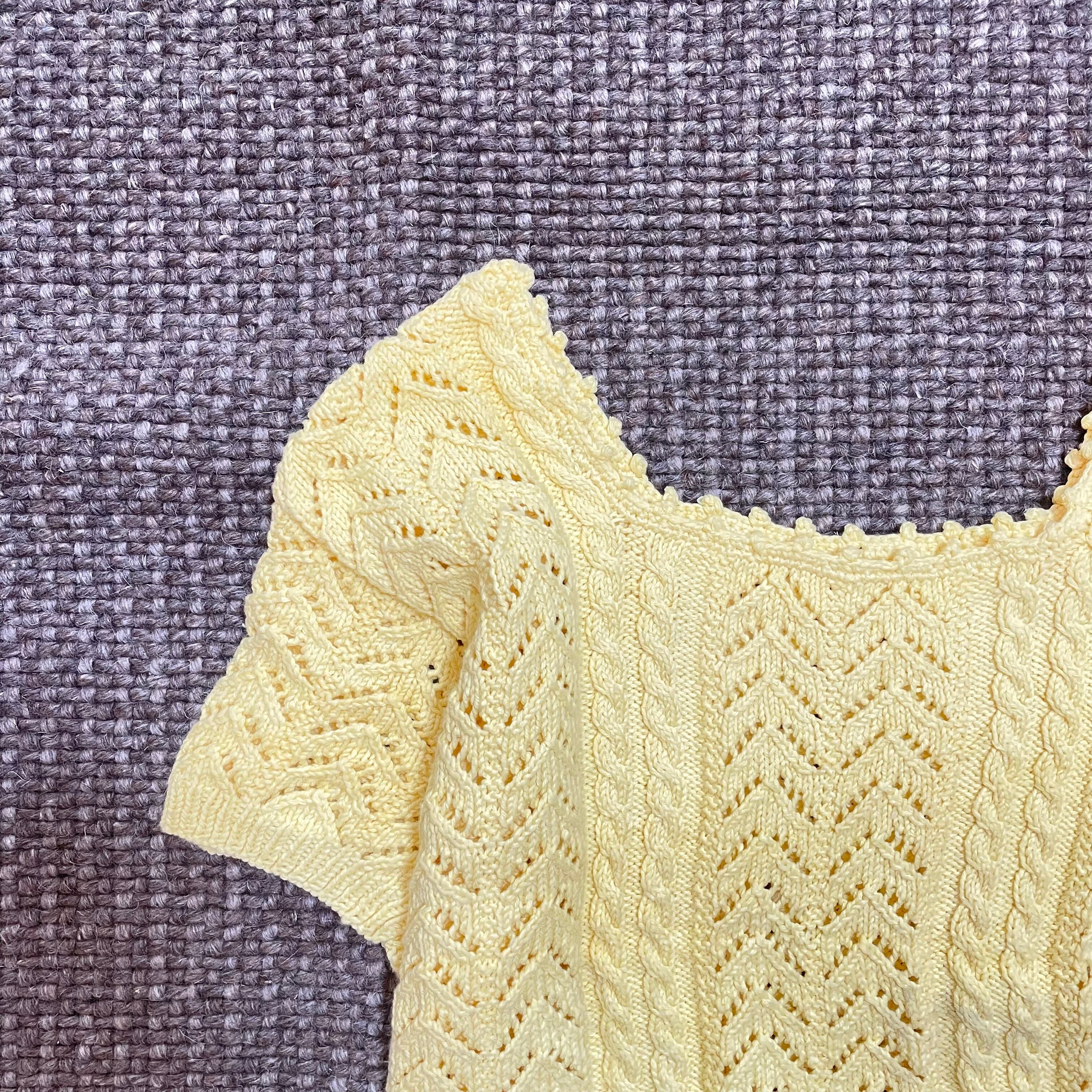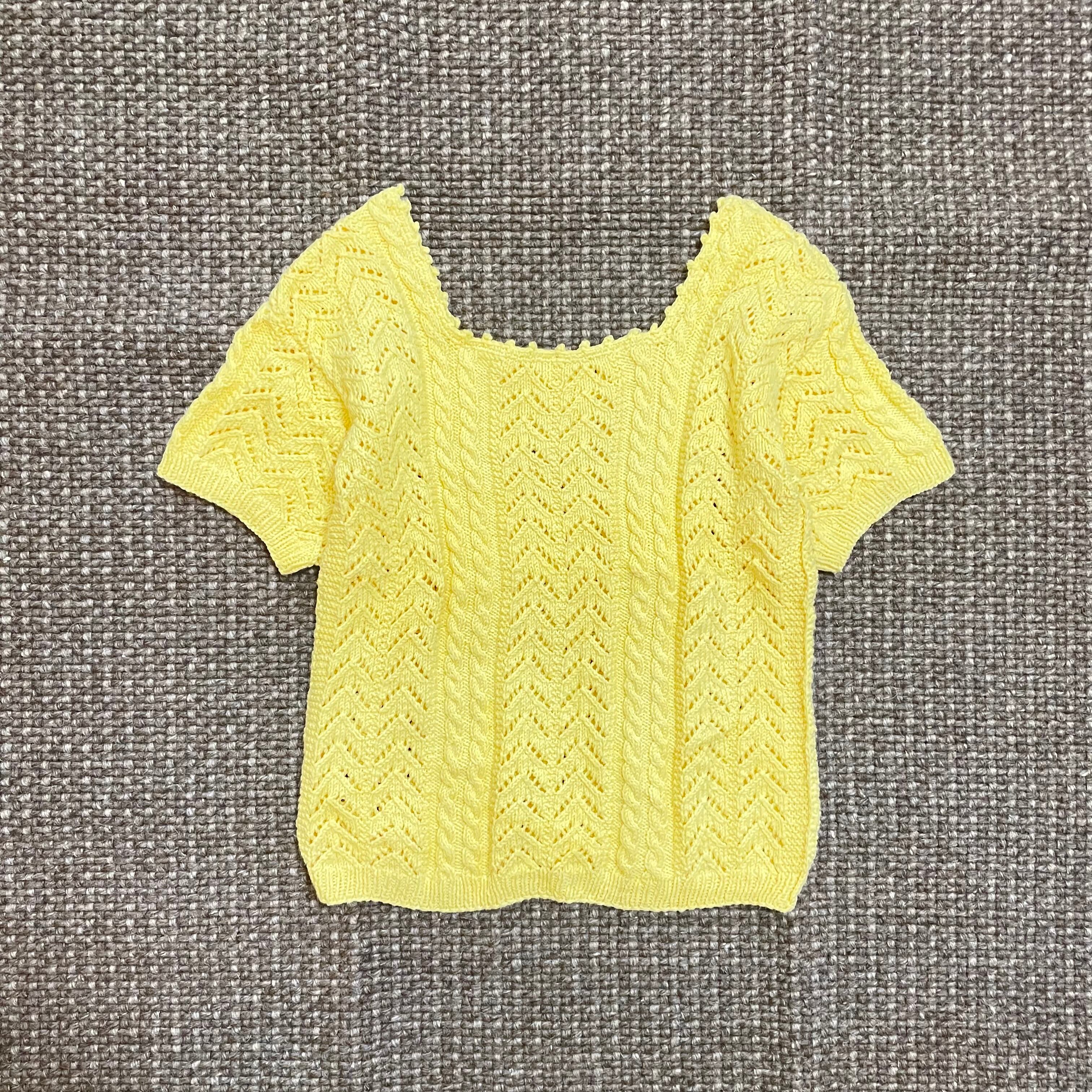 ニットセーター 古着 USED ケーブル編み スクエアネック イエロー 半袖 KP25