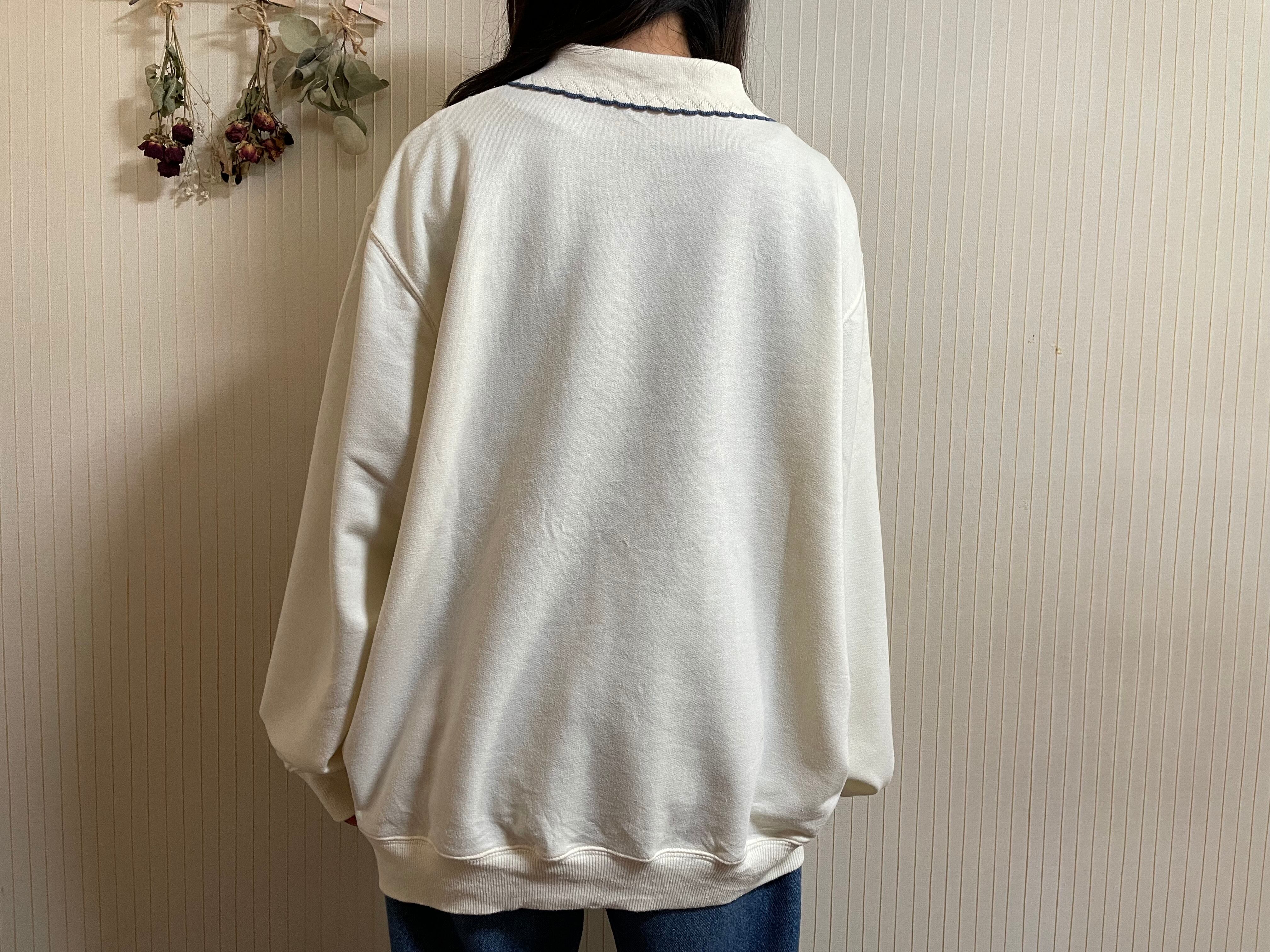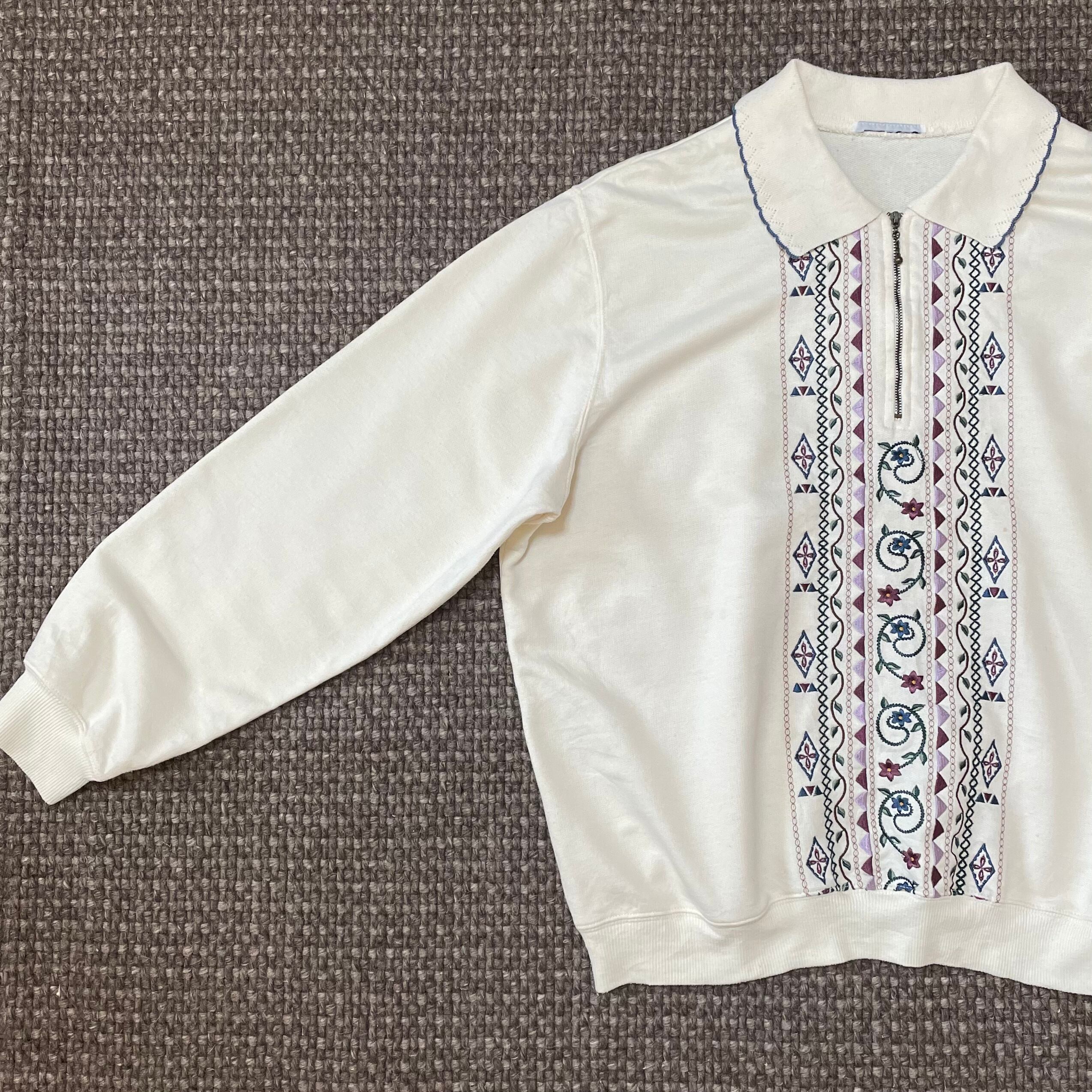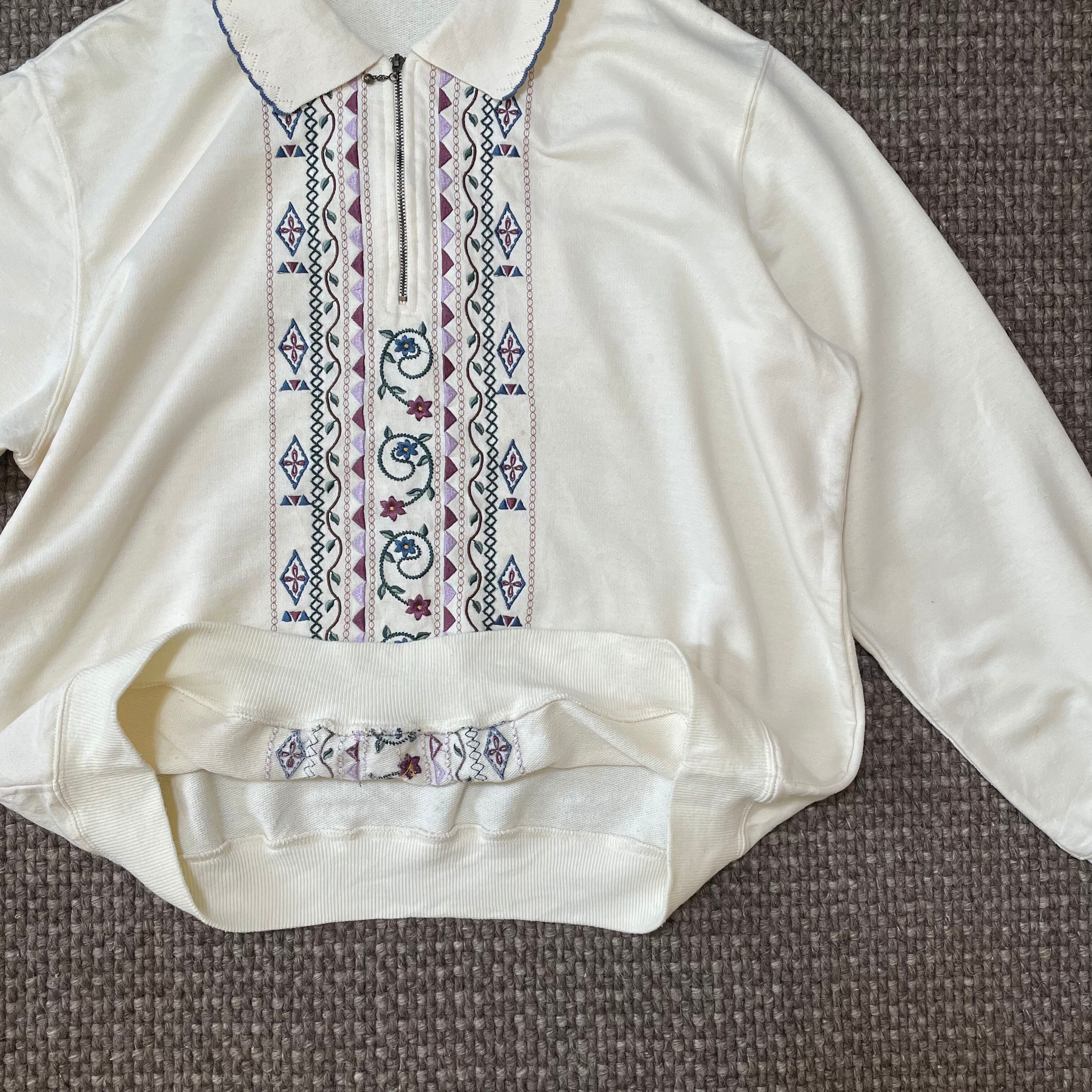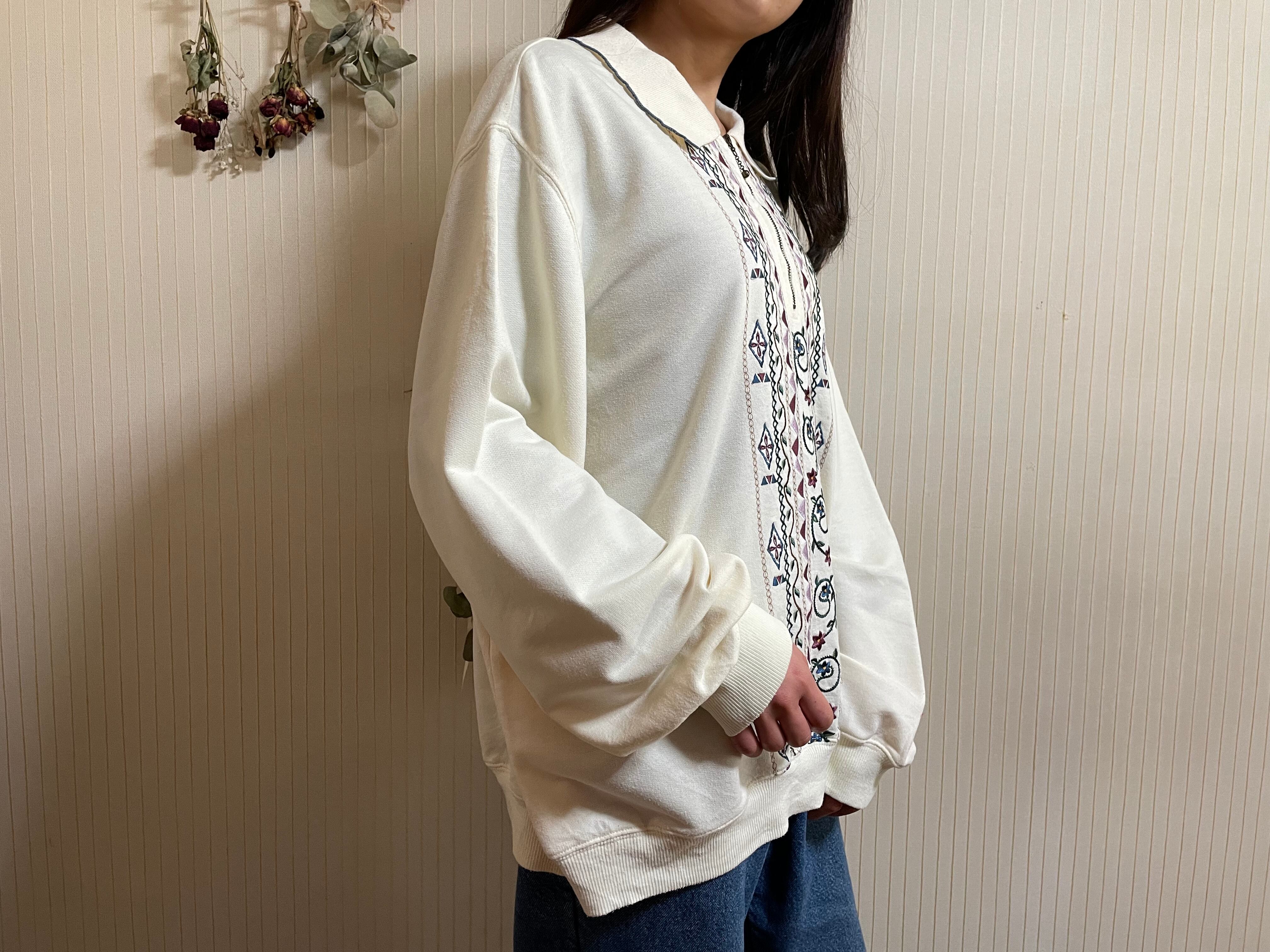 トレーナー 古着 USED 襟付きスウェット ホワイト 刺繍 花柄 KP35