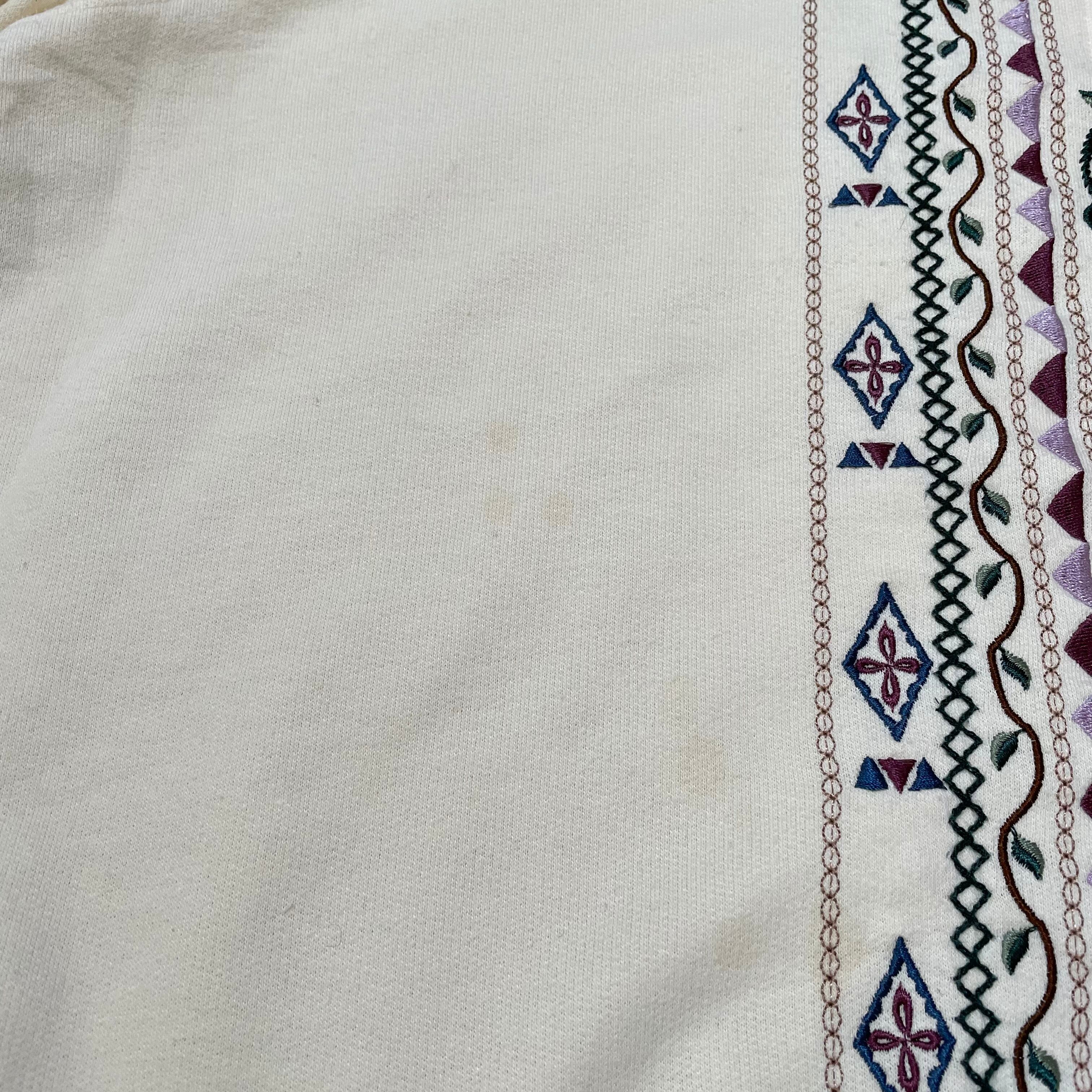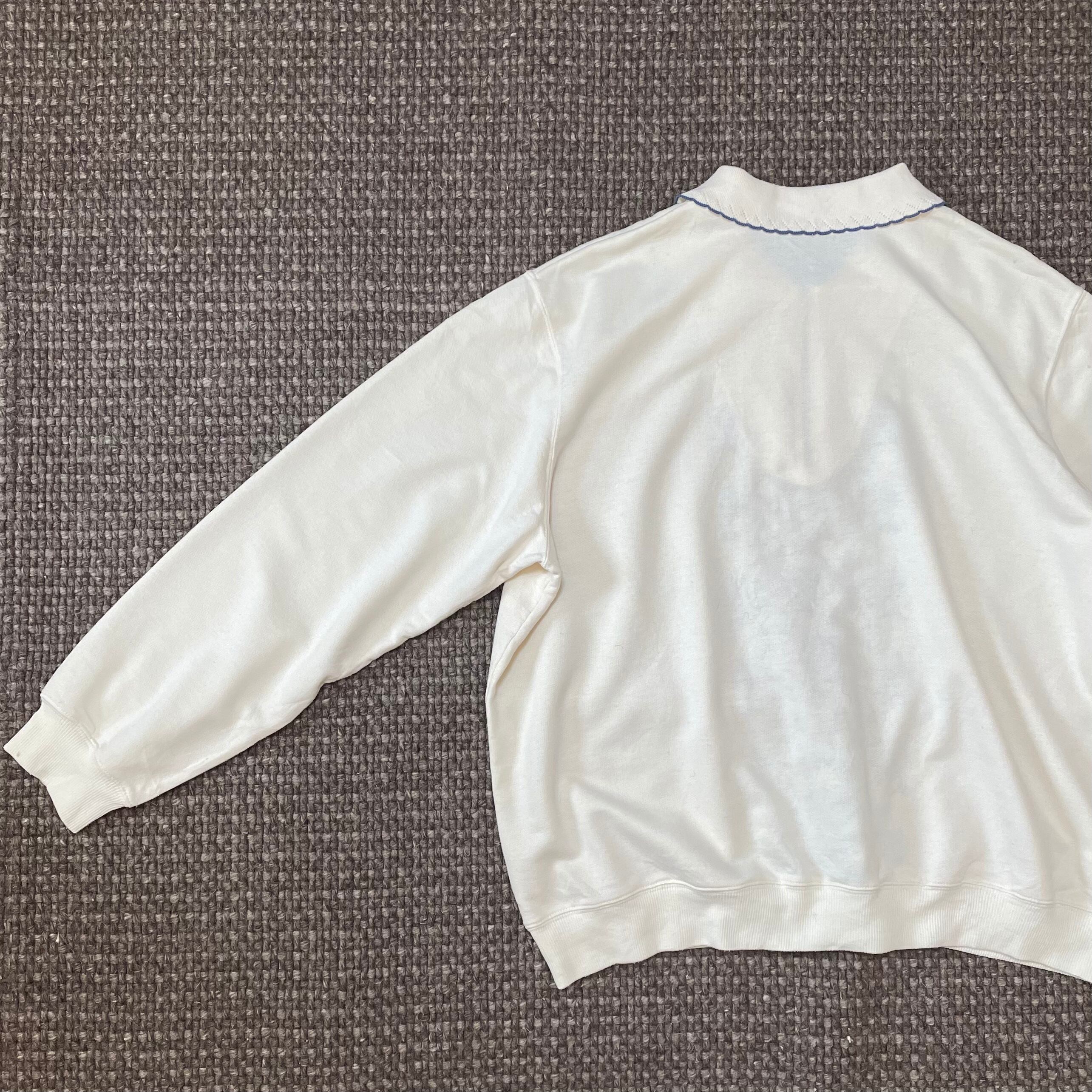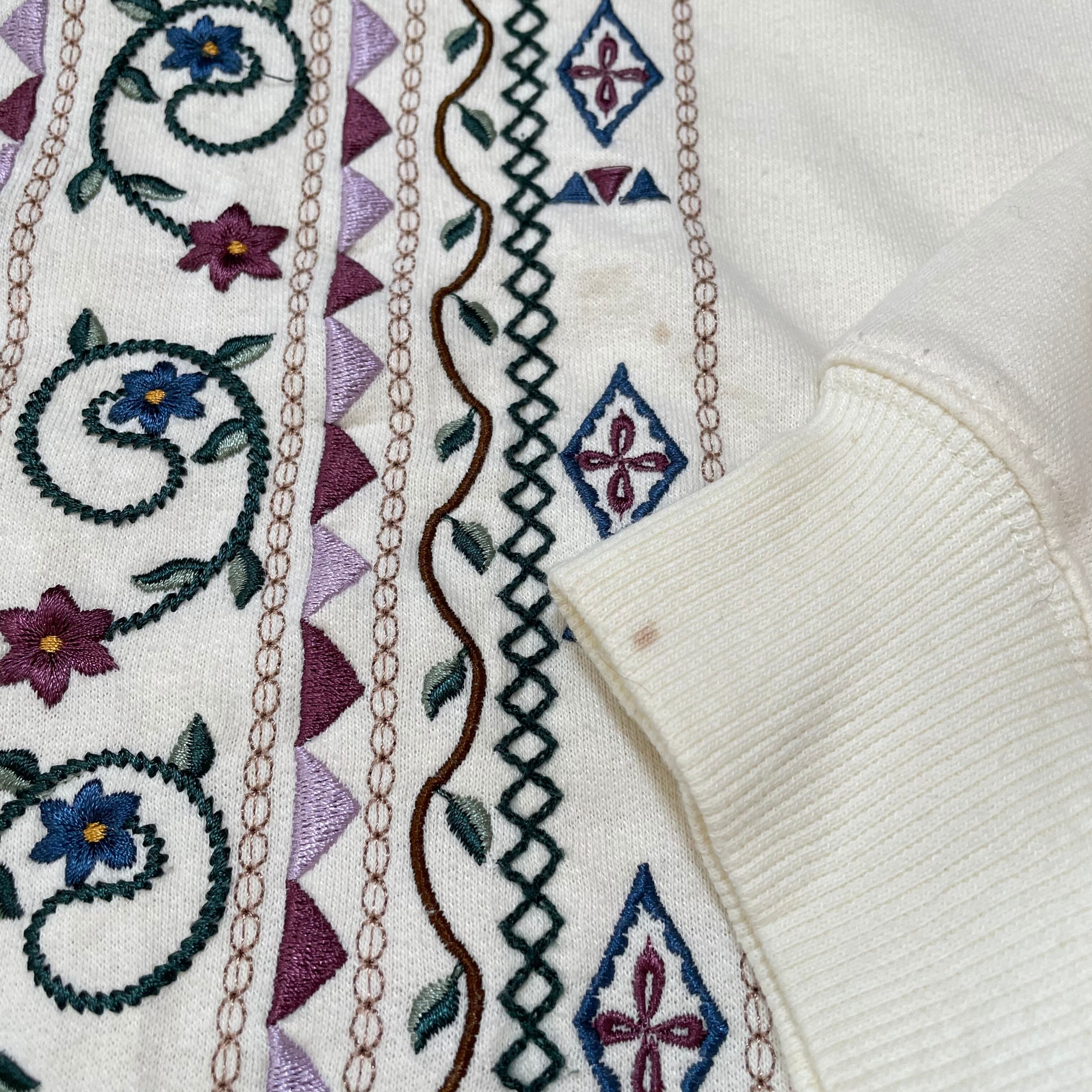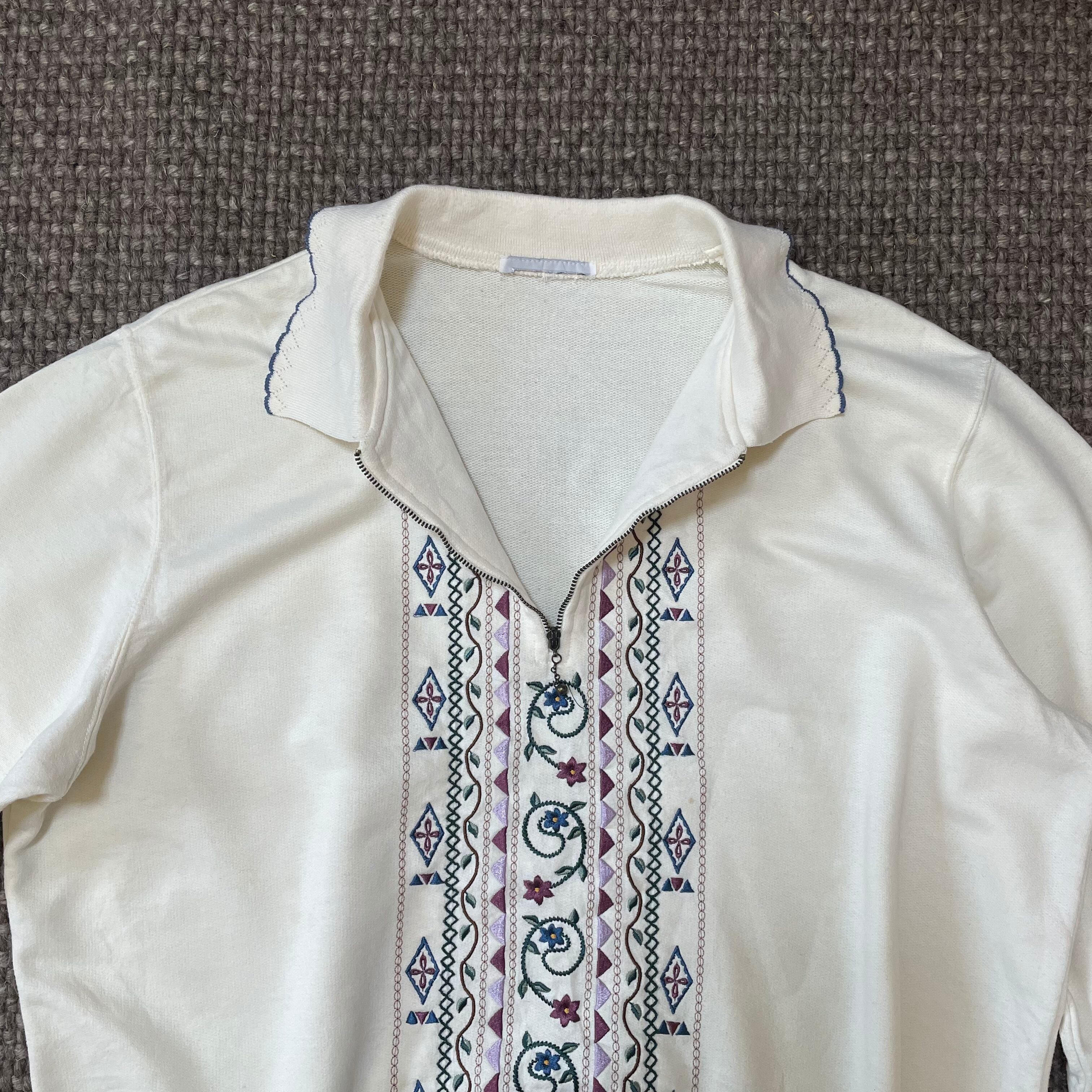 トレーナー 古着 USED 襟付きスウェット ホワイト 刺繍 花柄 KP35