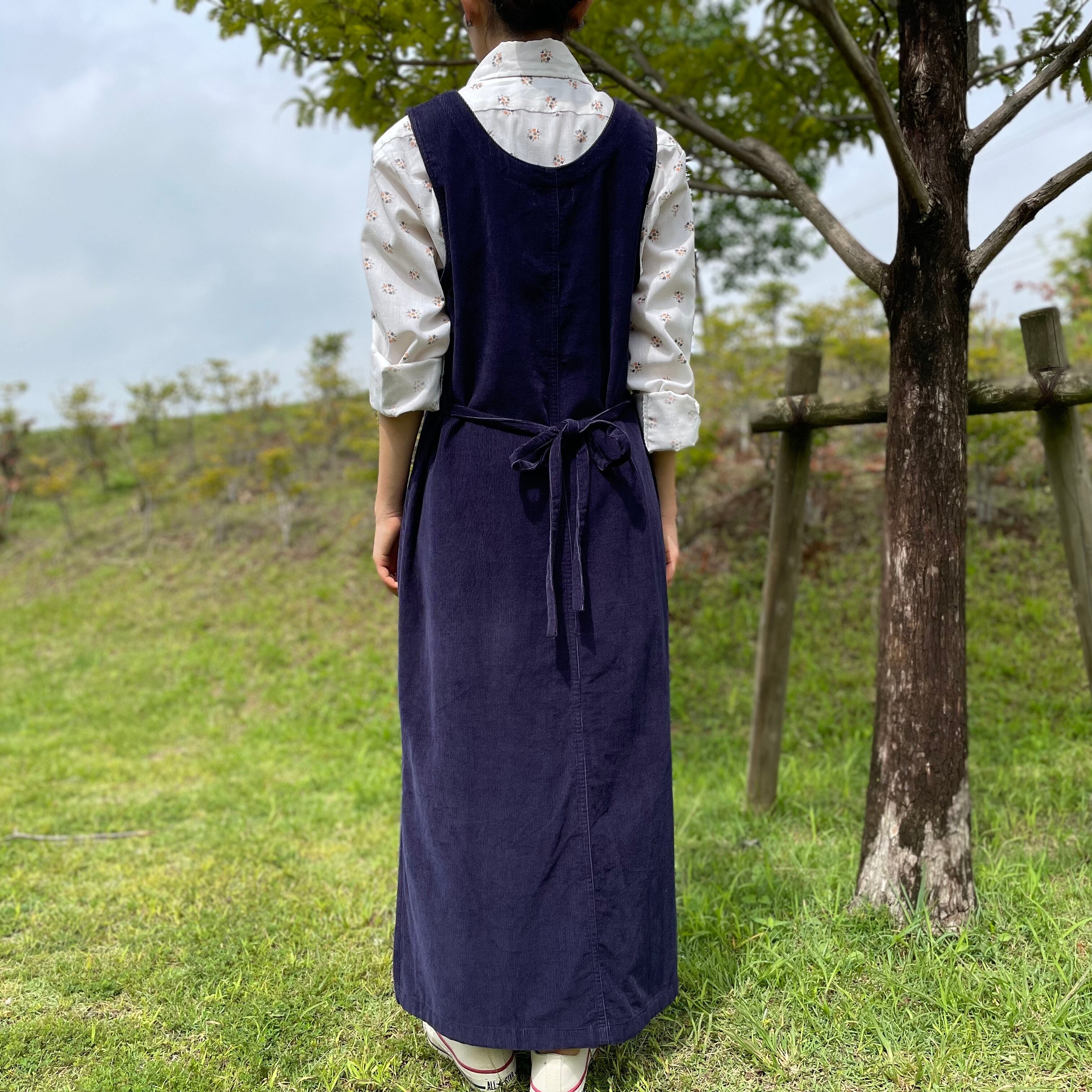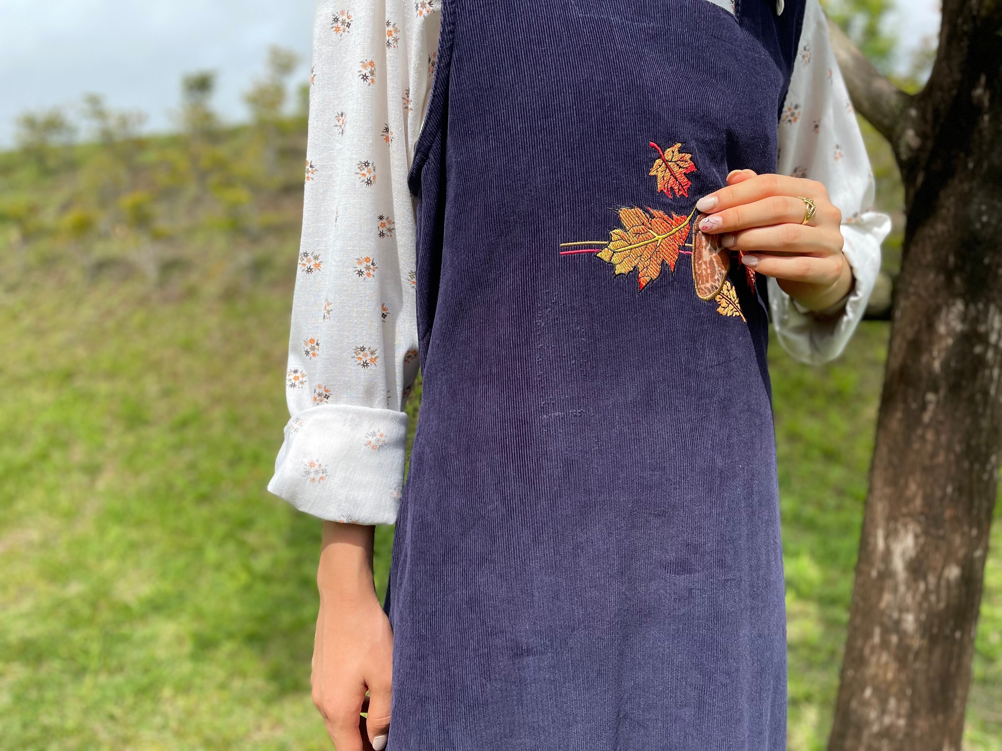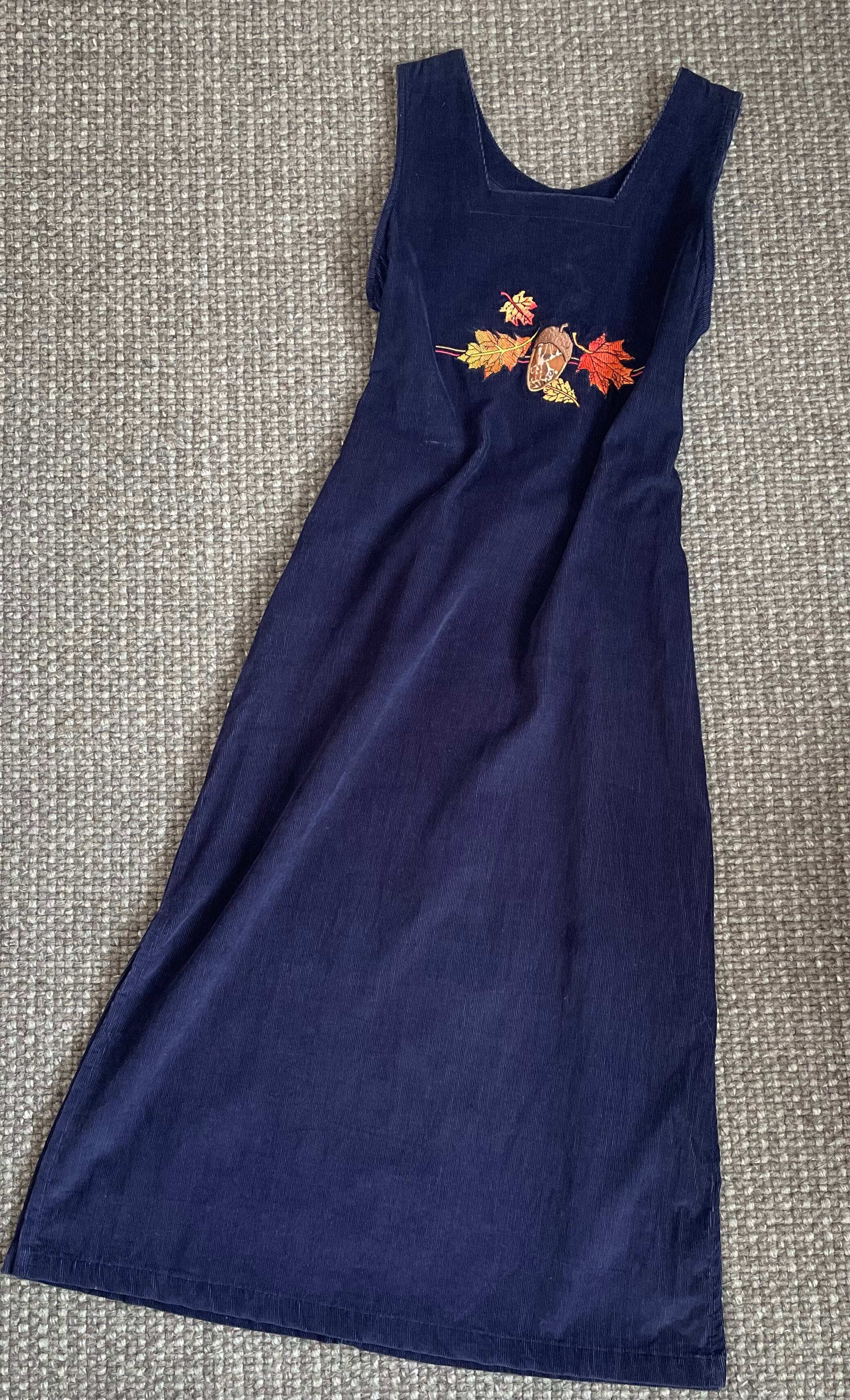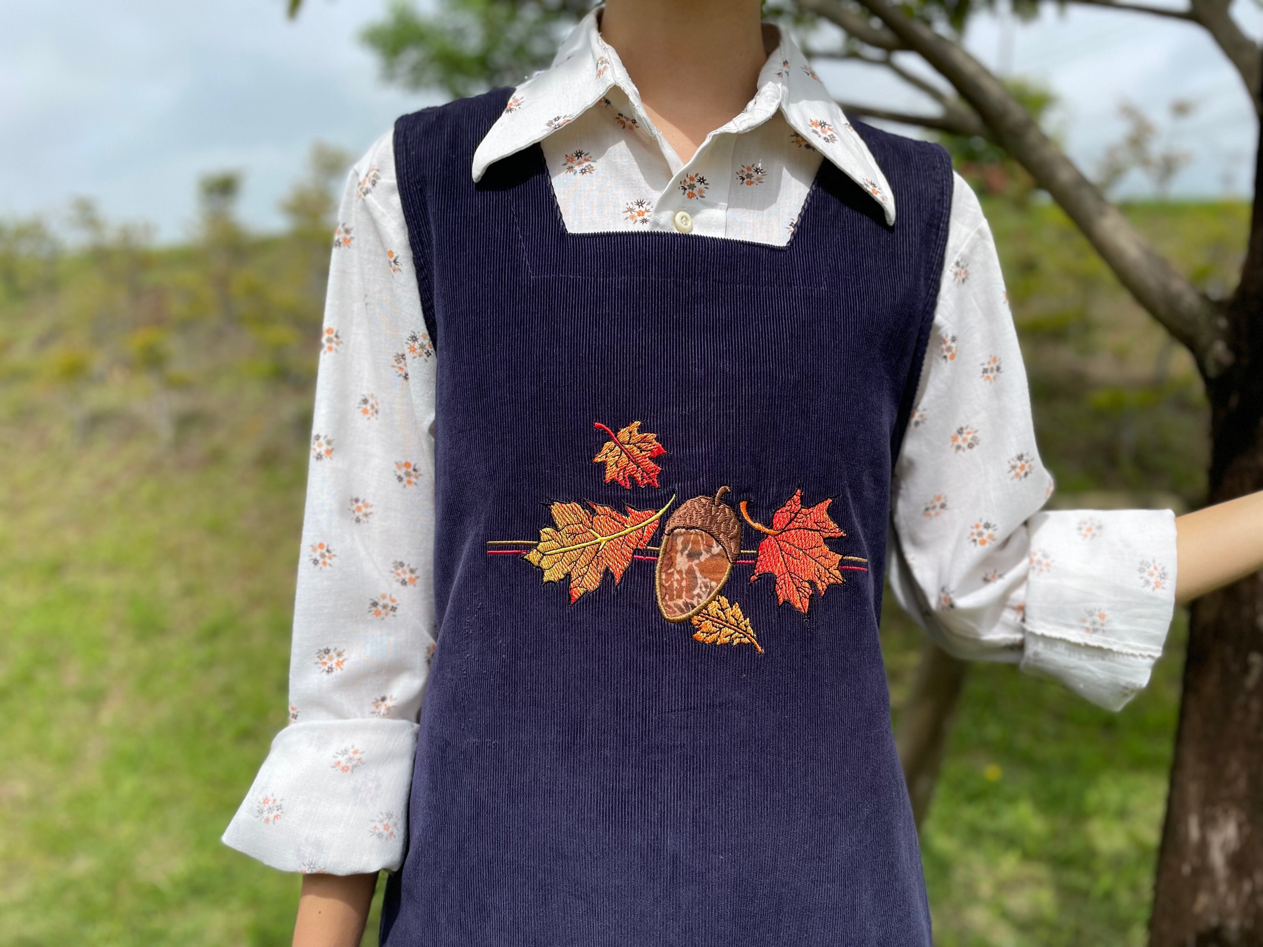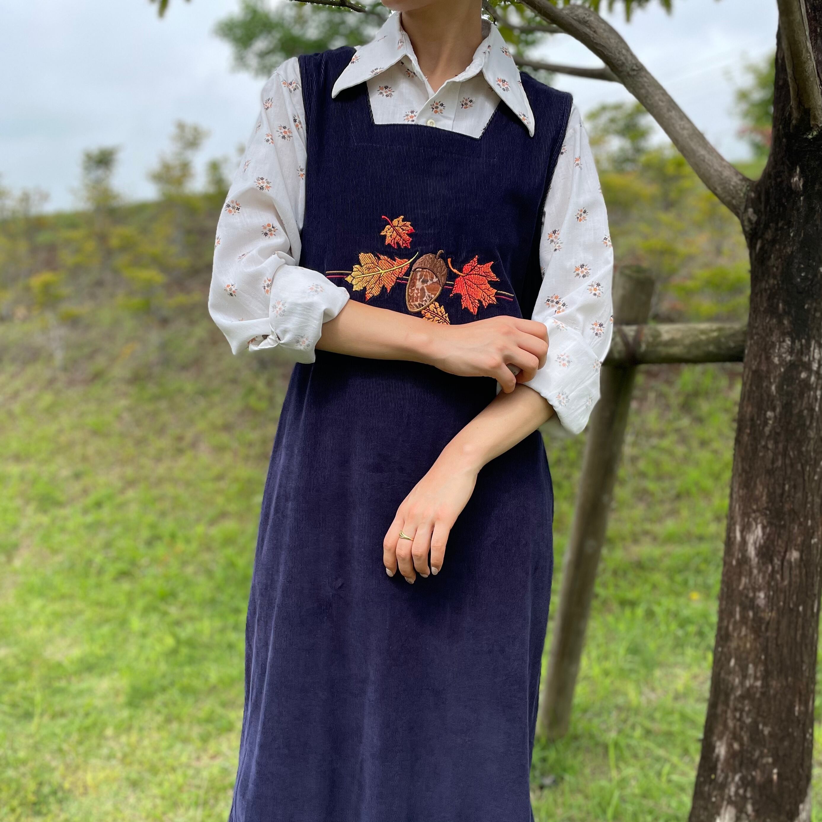leaf design corduroy dress ワンピース 古着 ヴィンテージ ネイビー 刺繍 J72