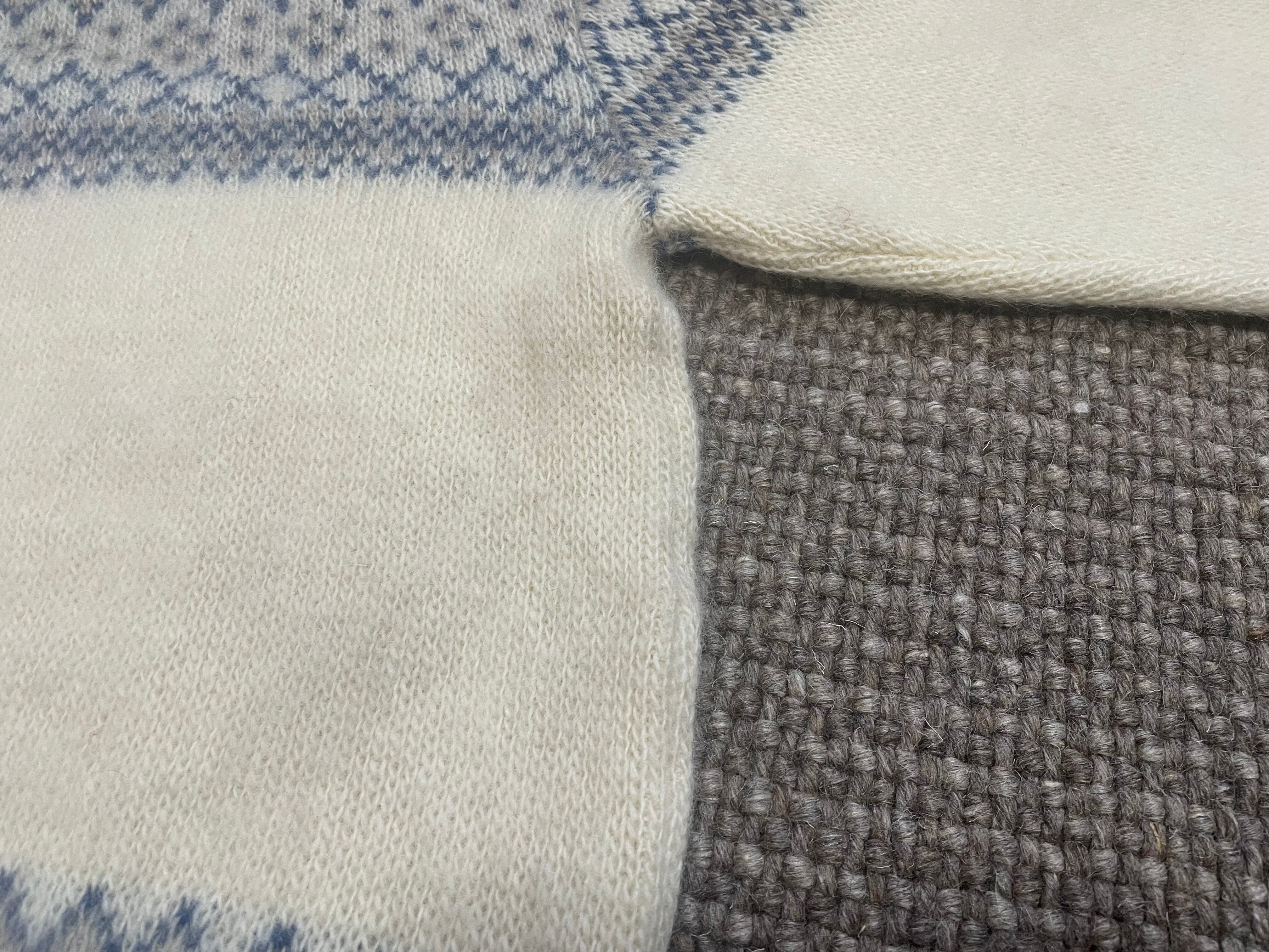 ふわっとした毛の長い毛糸で細かく編まれています。