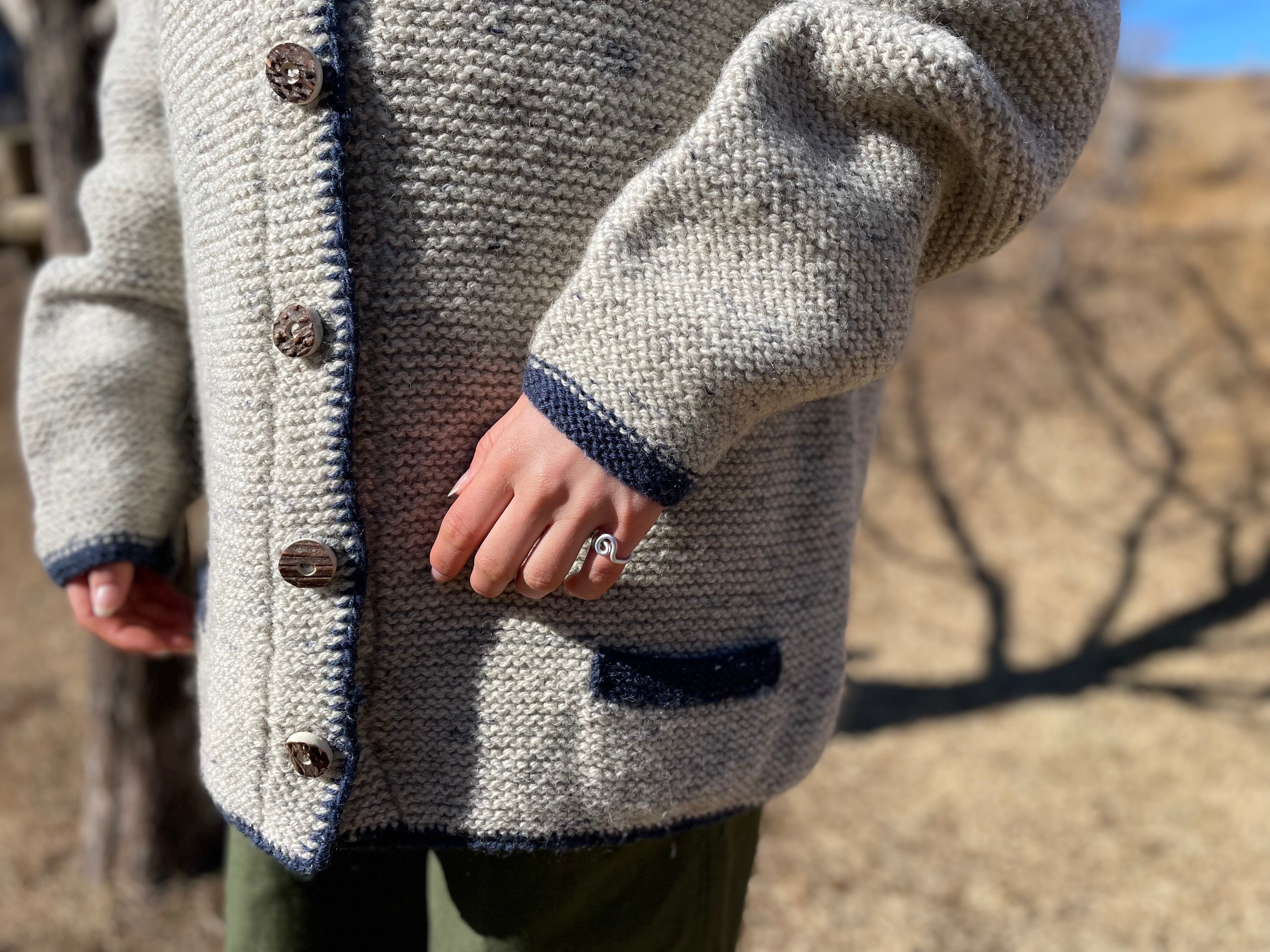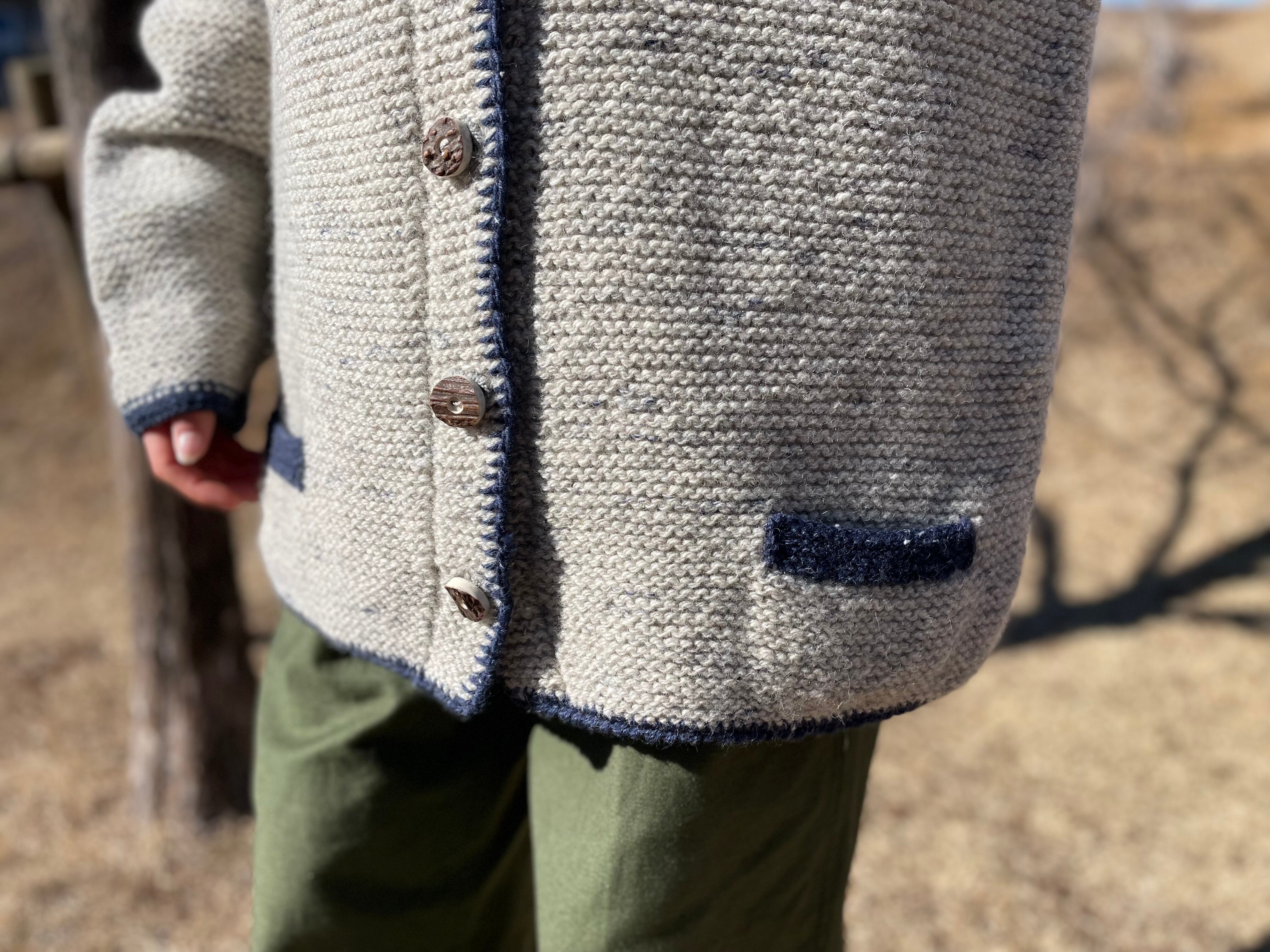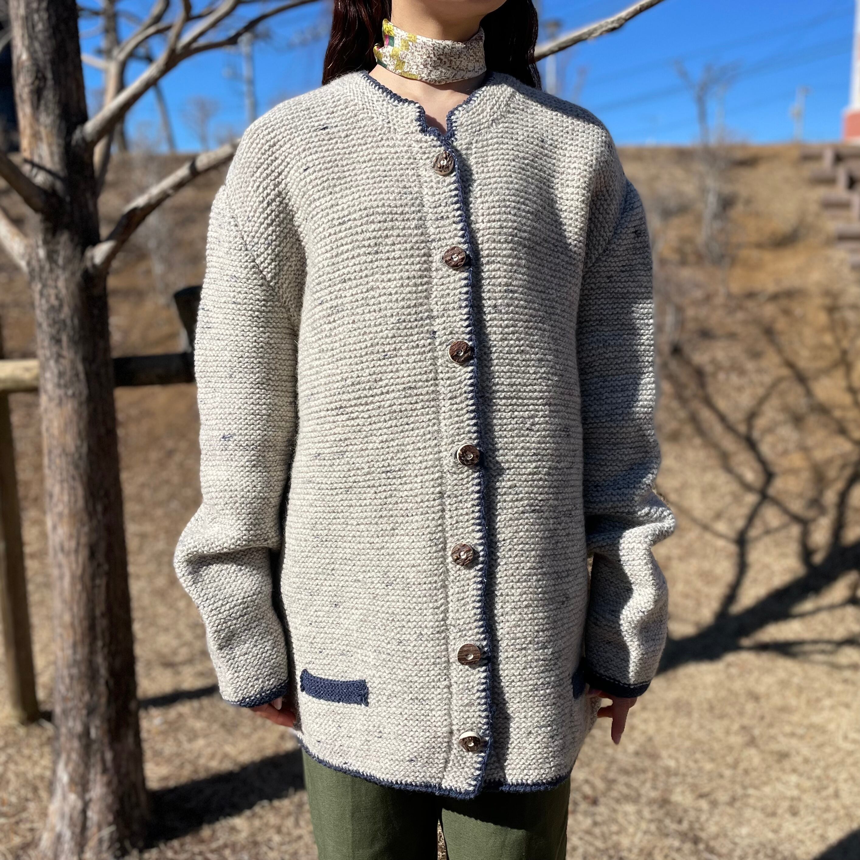 木をモチーフにしたボタンが特徴のチロリアンニットジャケット