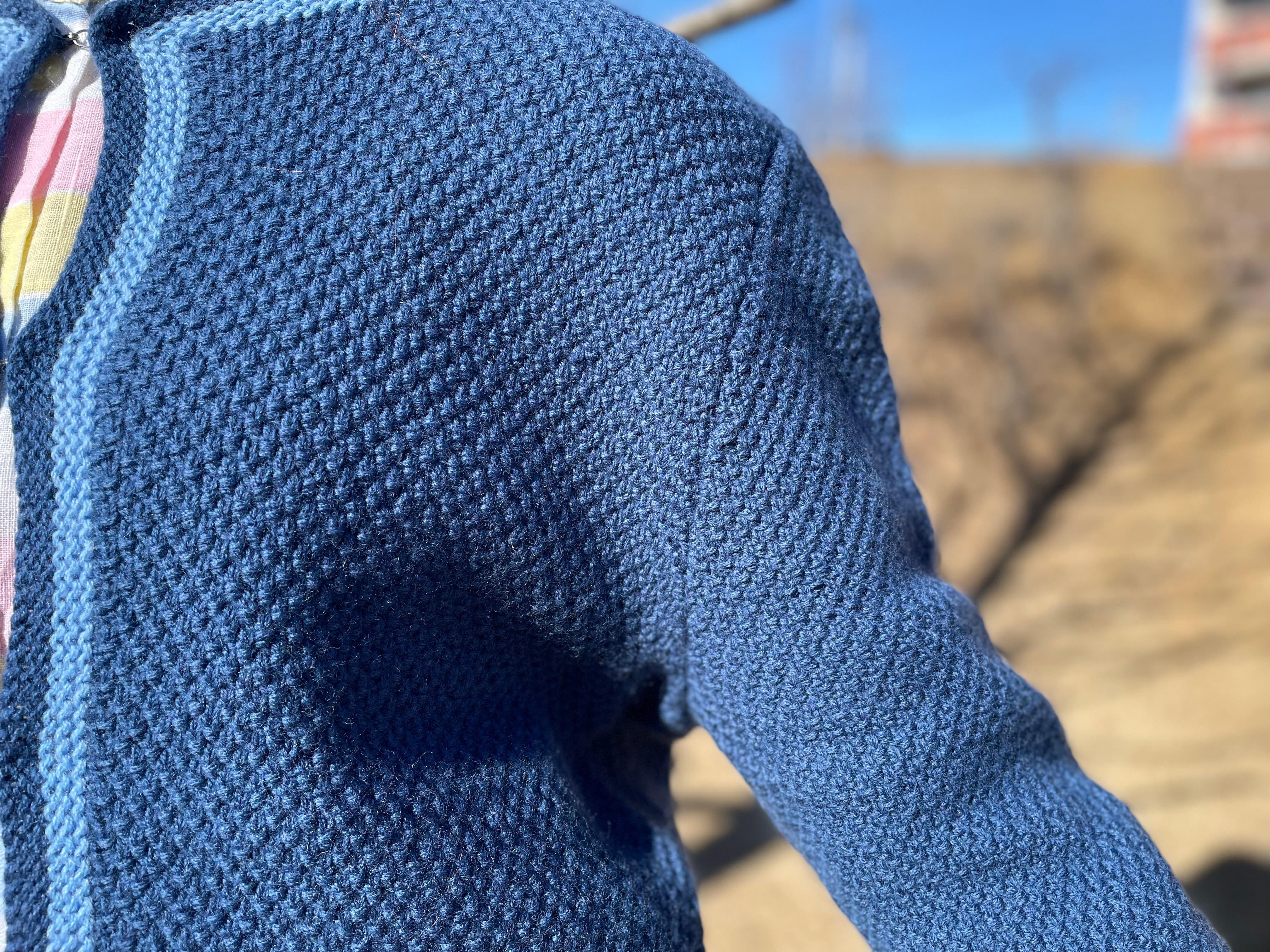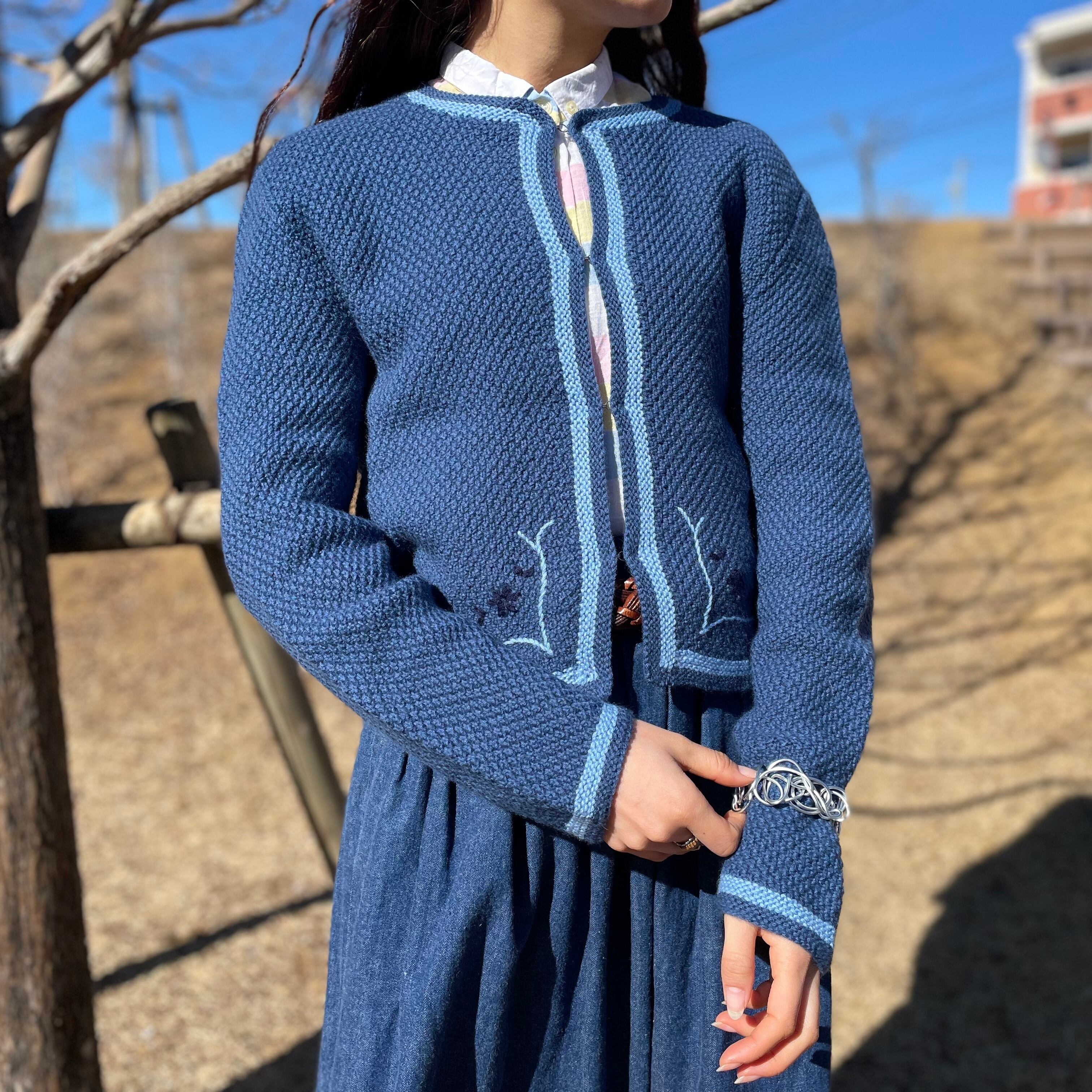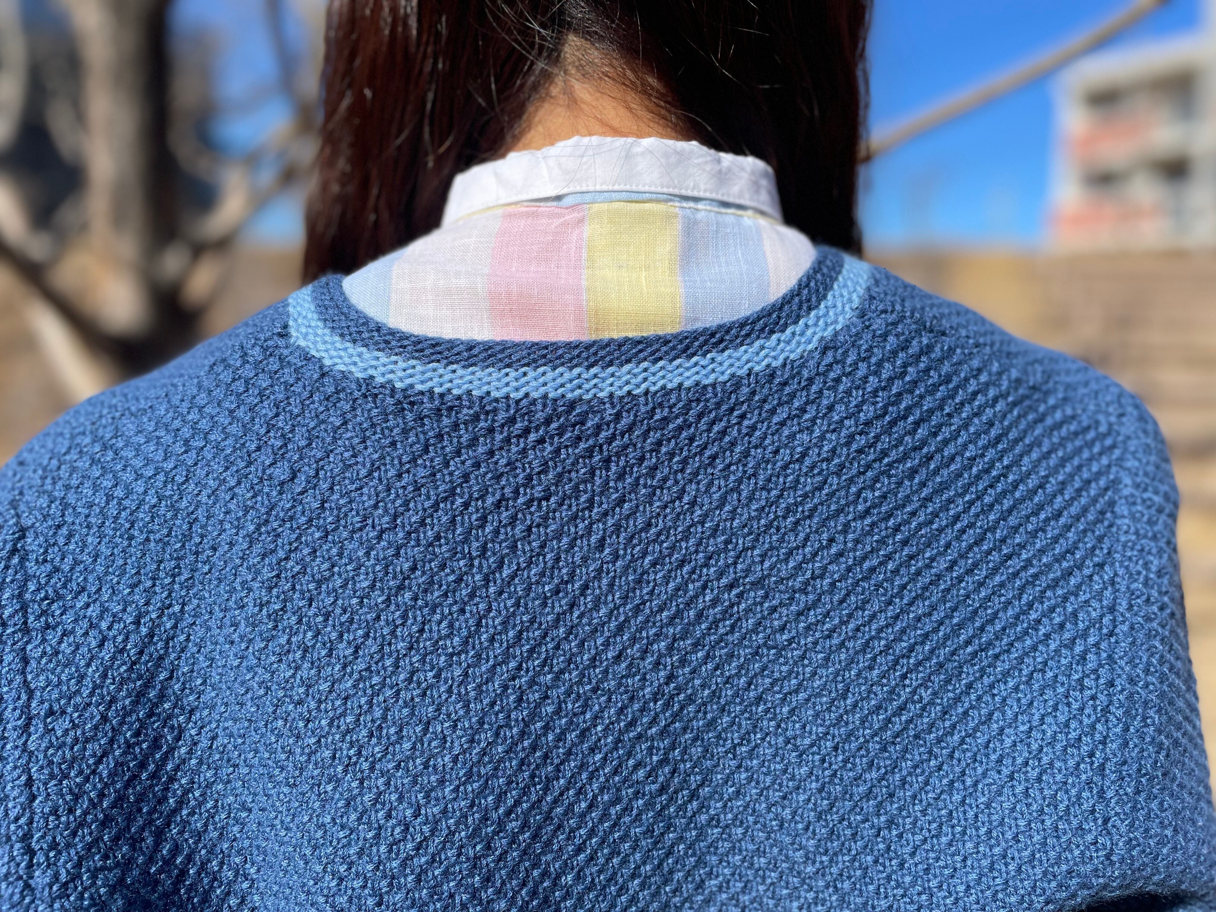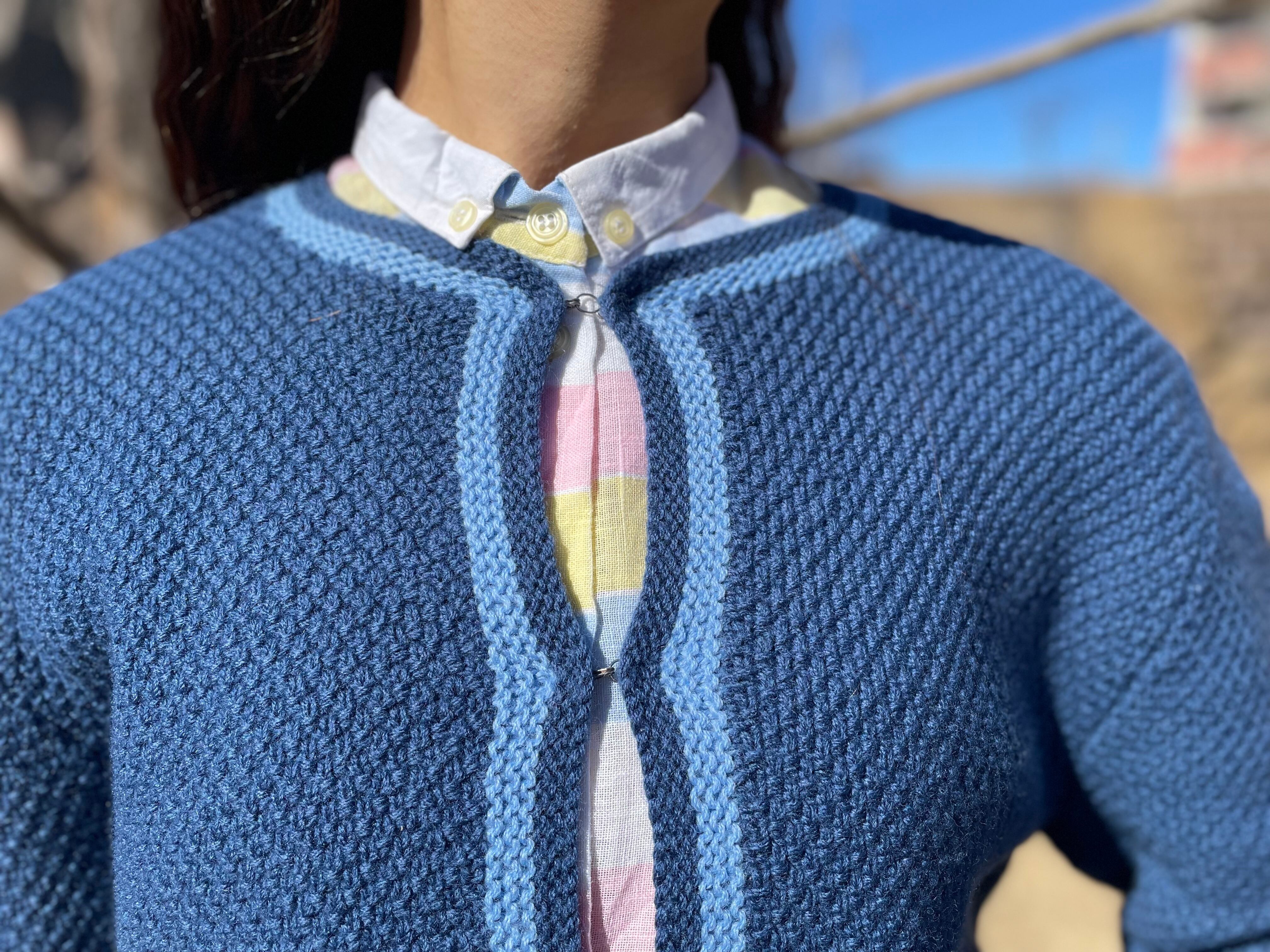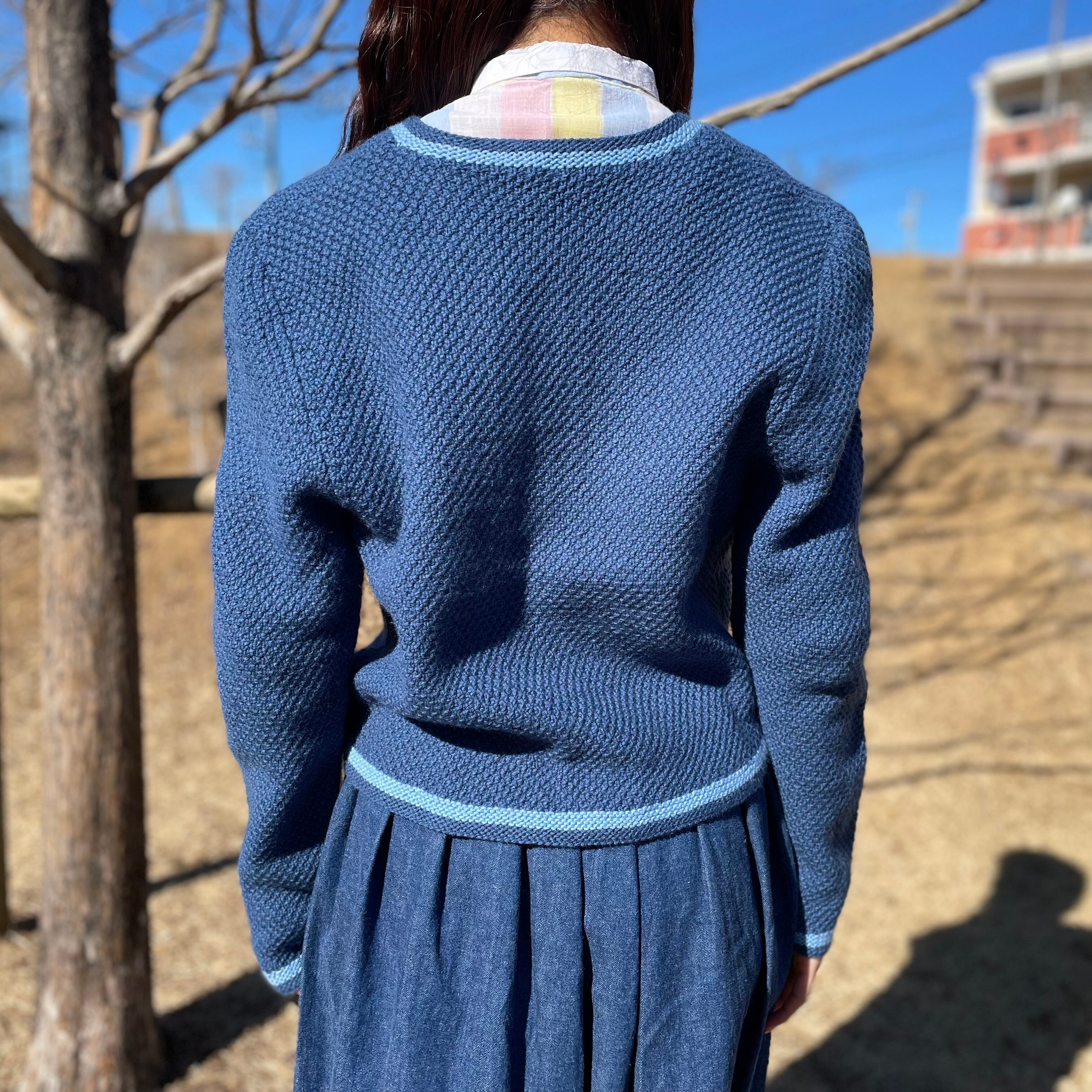 濃いブルーにサックスブルーのラインがアクセントになっているニットカーディガン