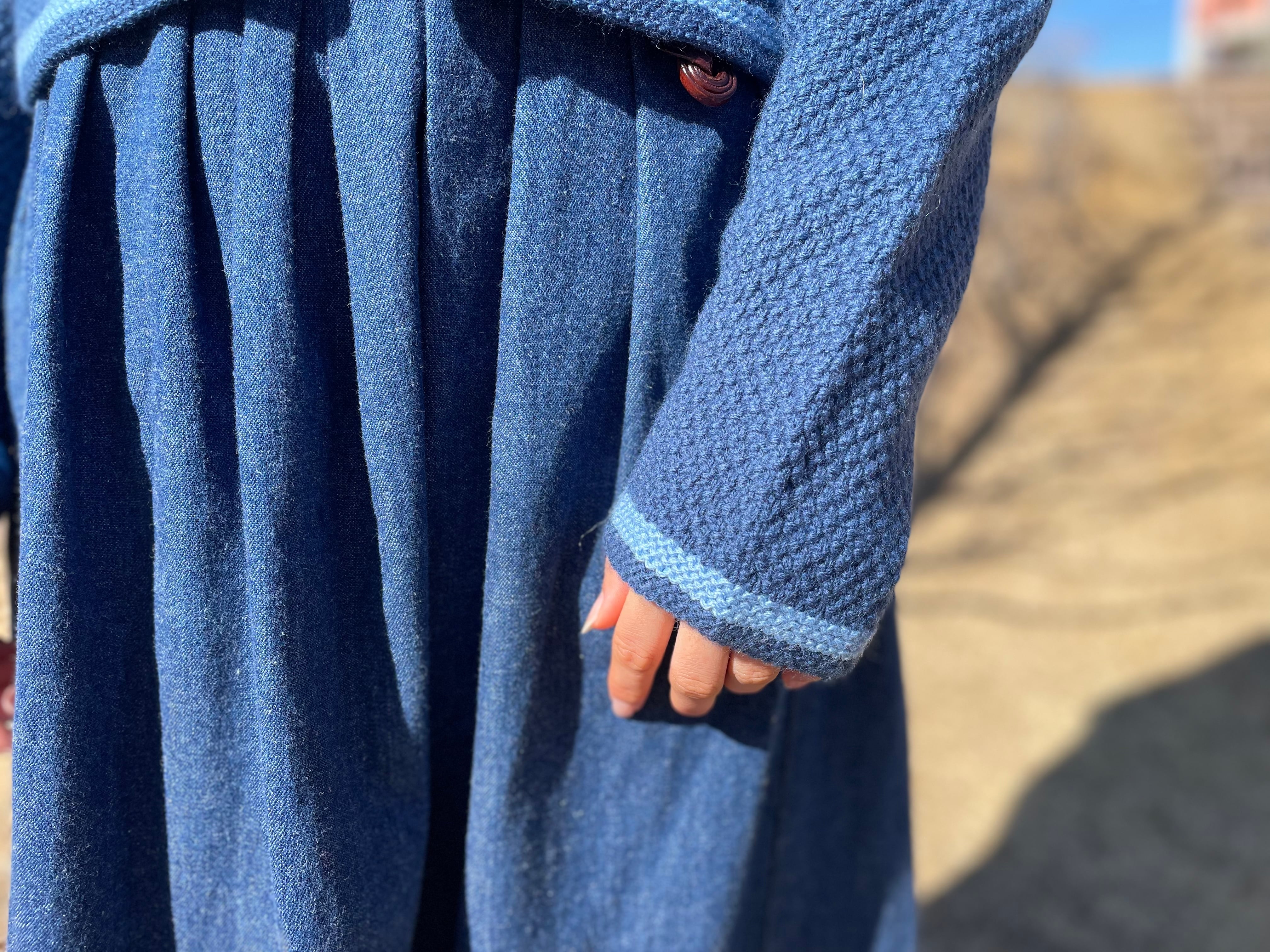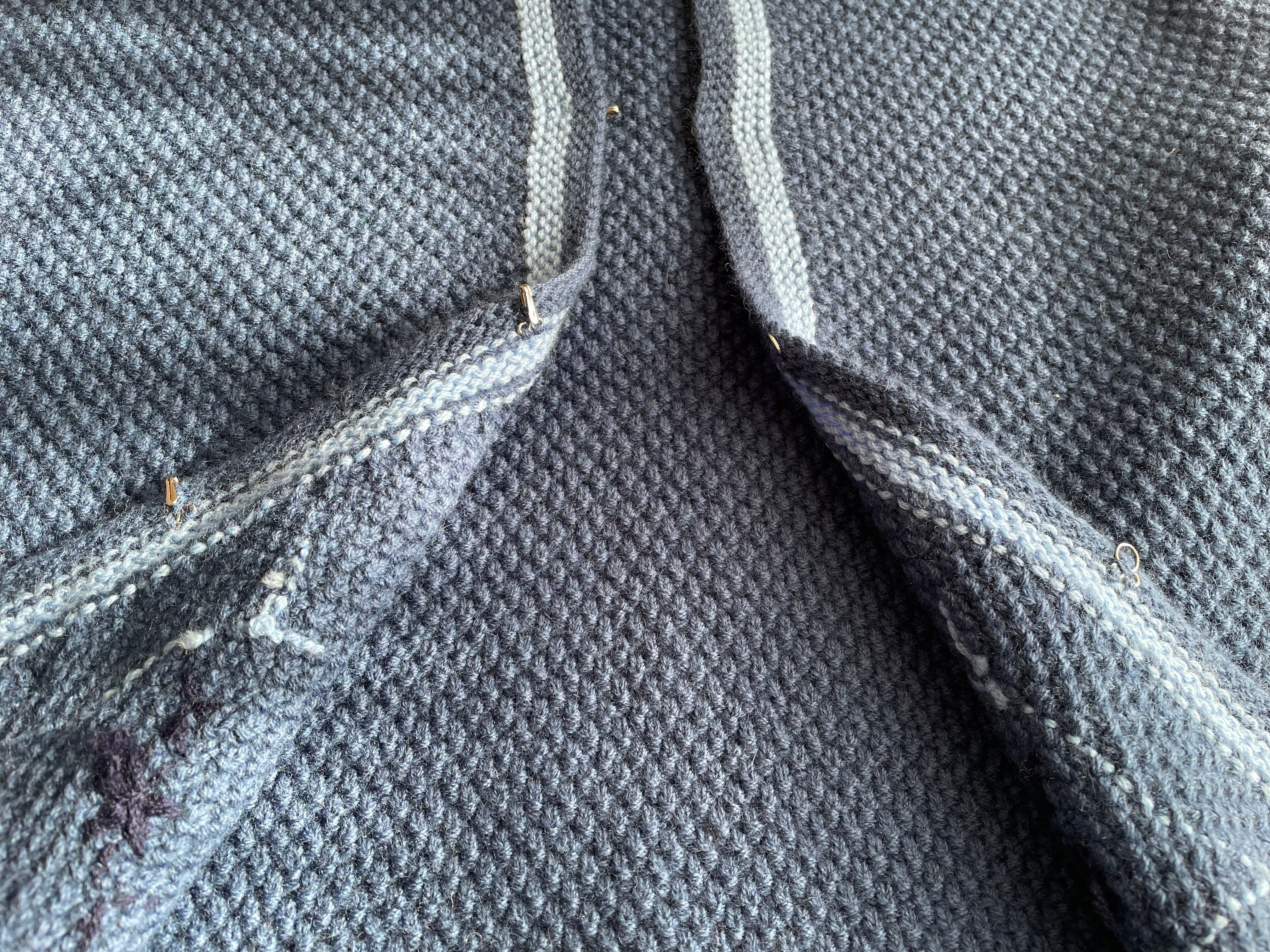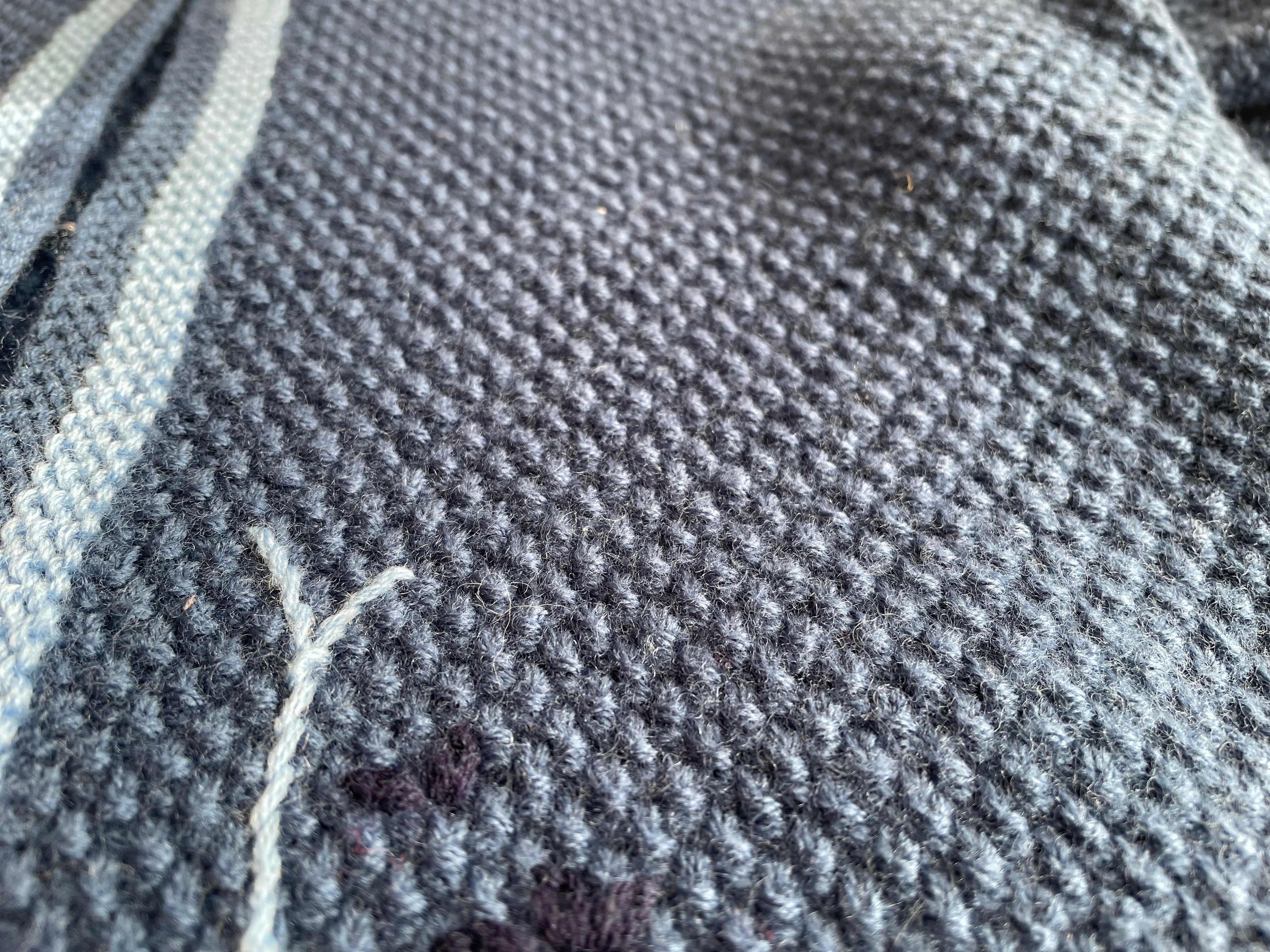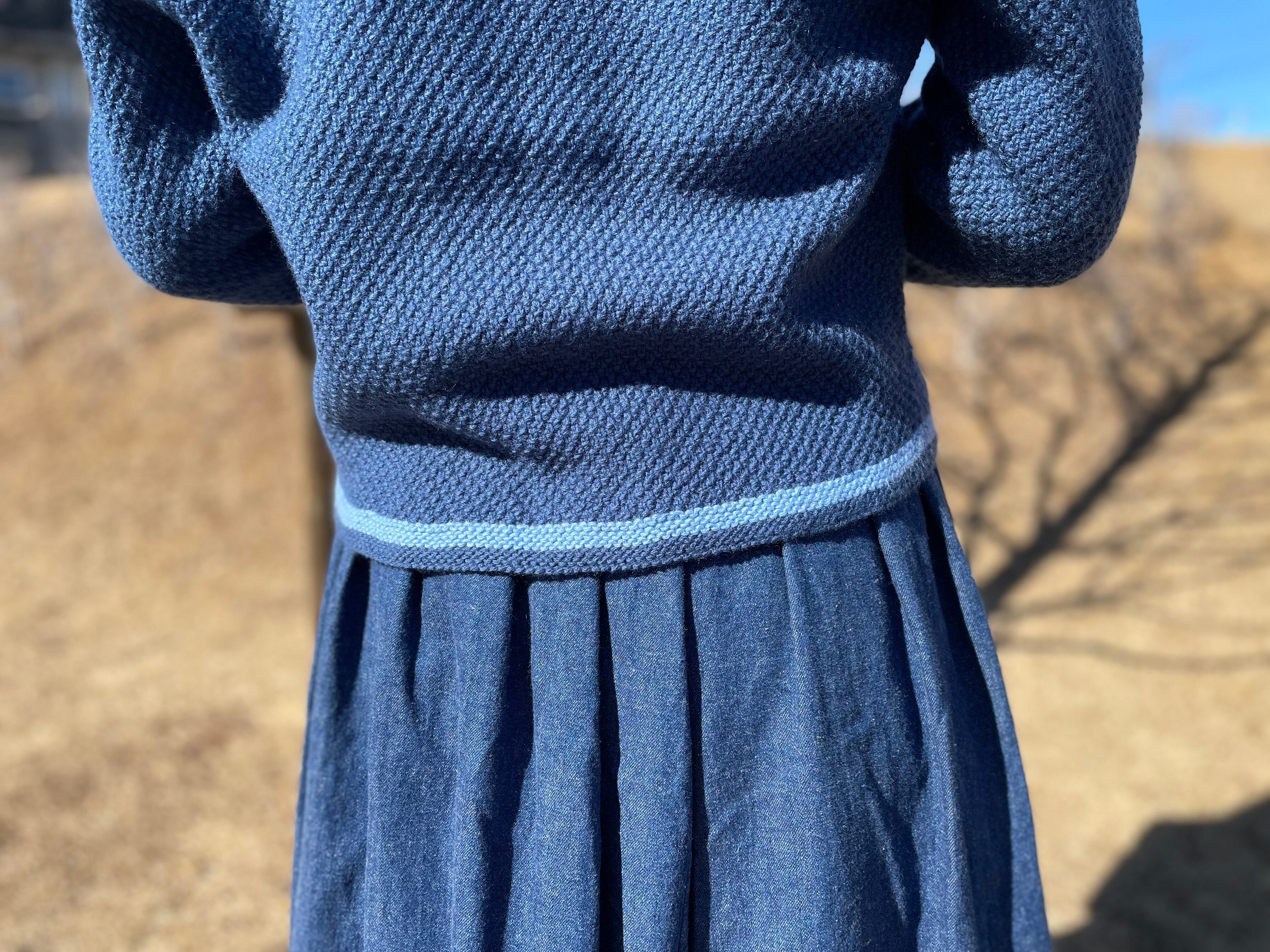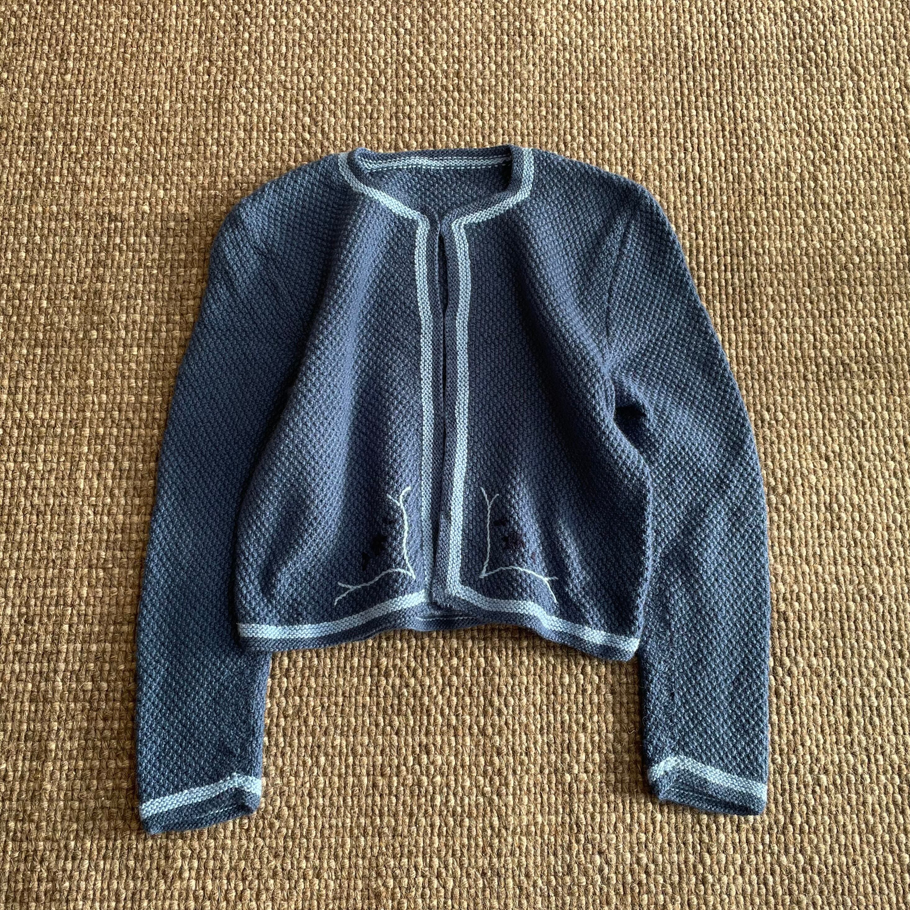 濃いブルーにサックスブルーのラインがアクセントになっているニットカーディガン