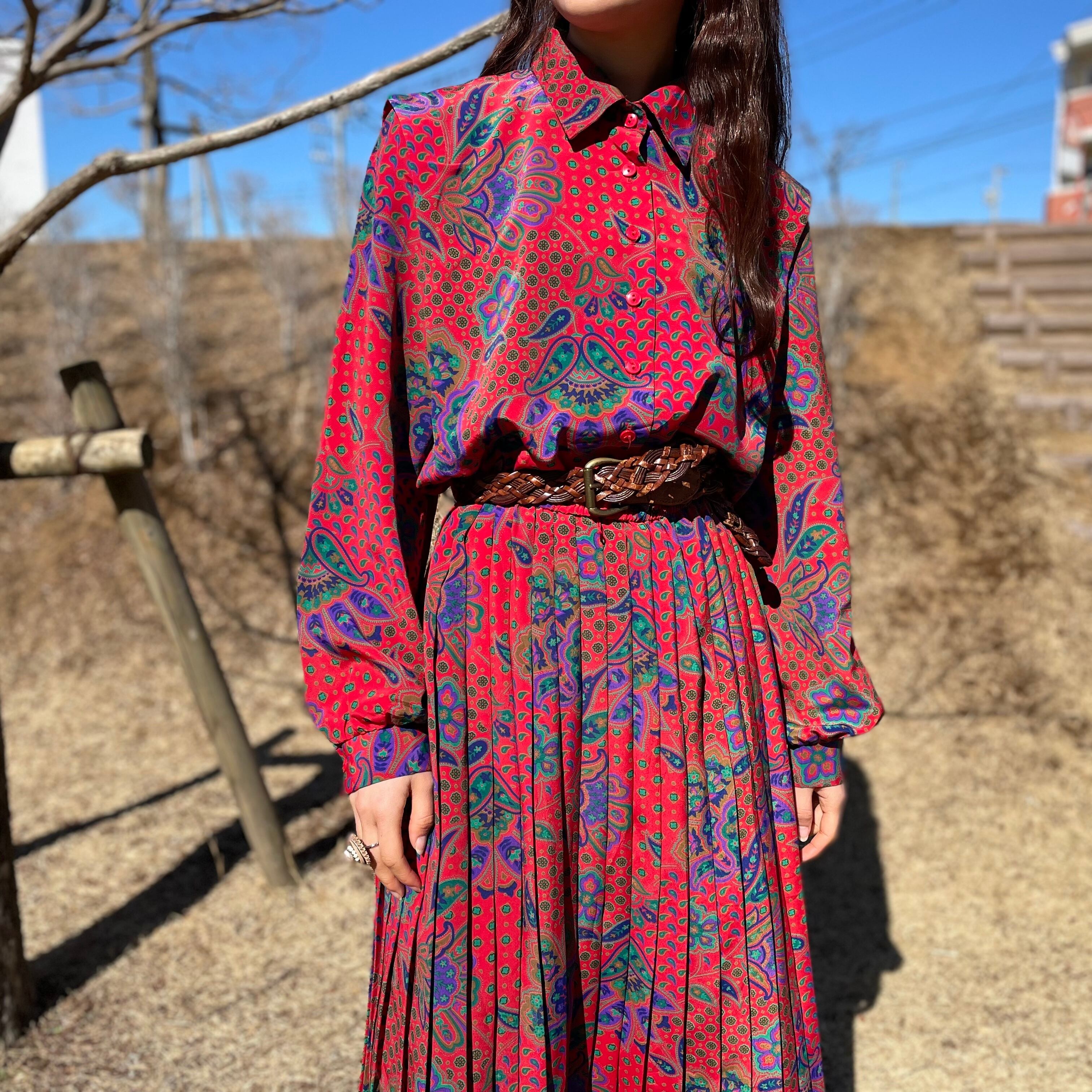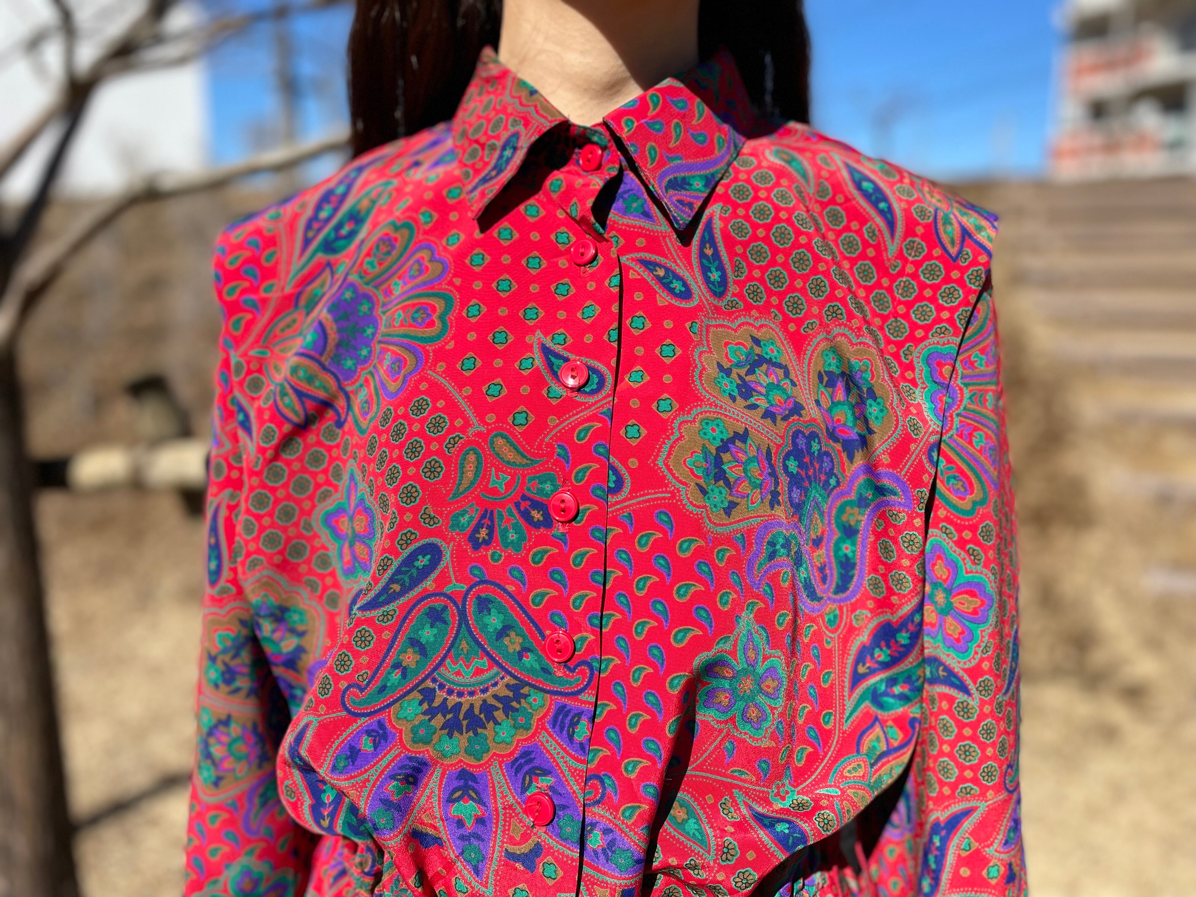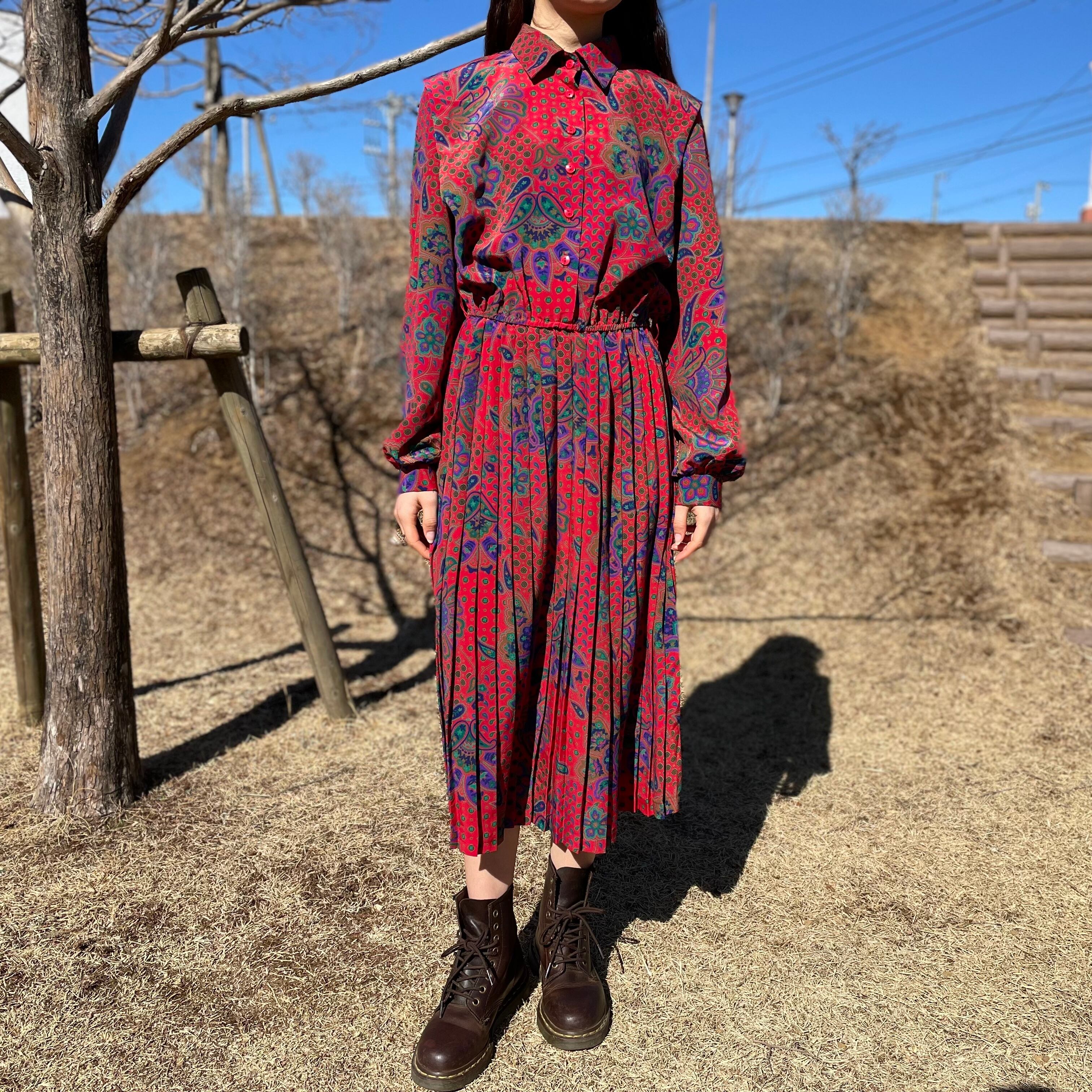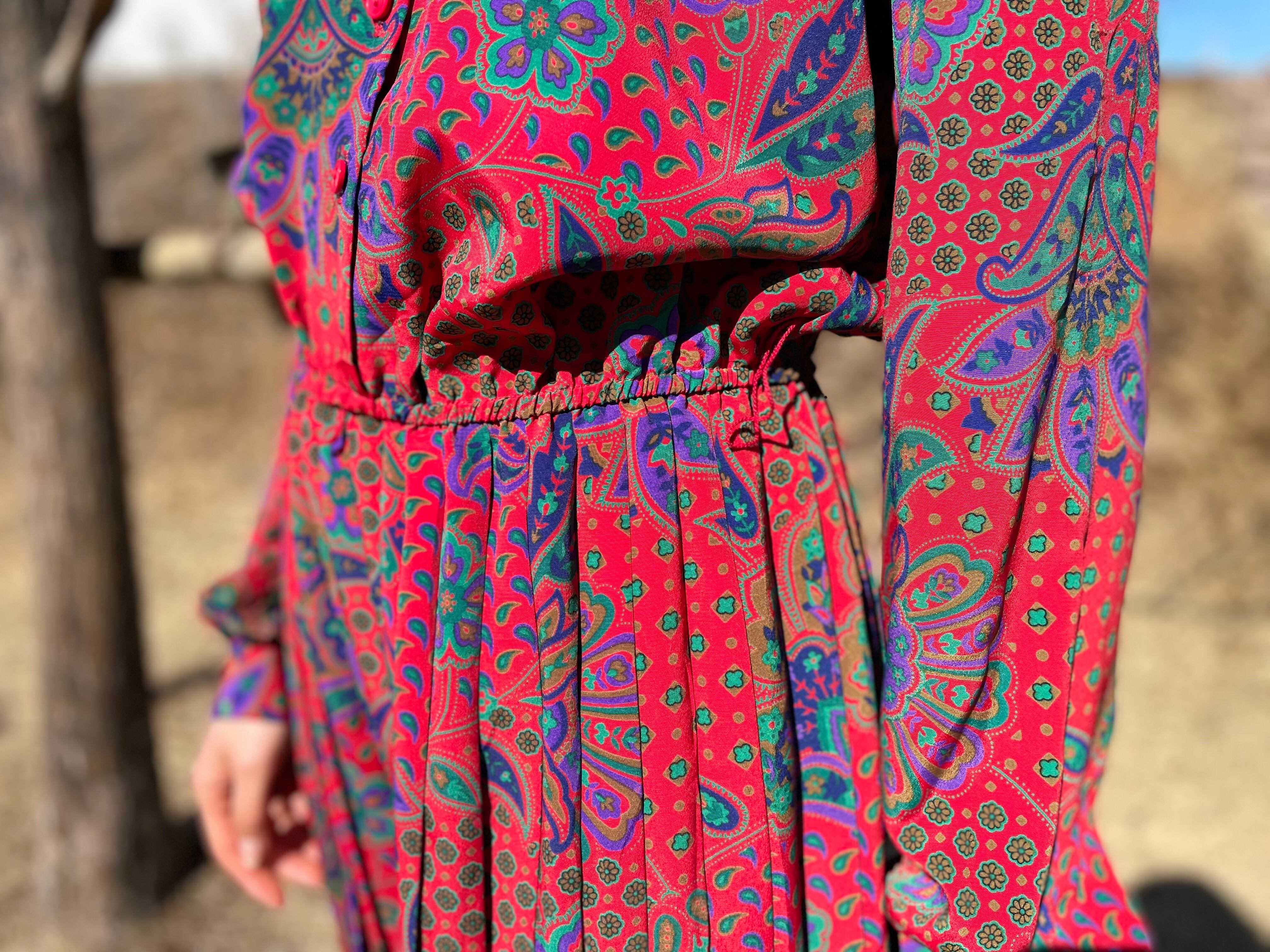ビビッドなレッドカラーに、レトロなペイズリー柄が目を惹くワンピース