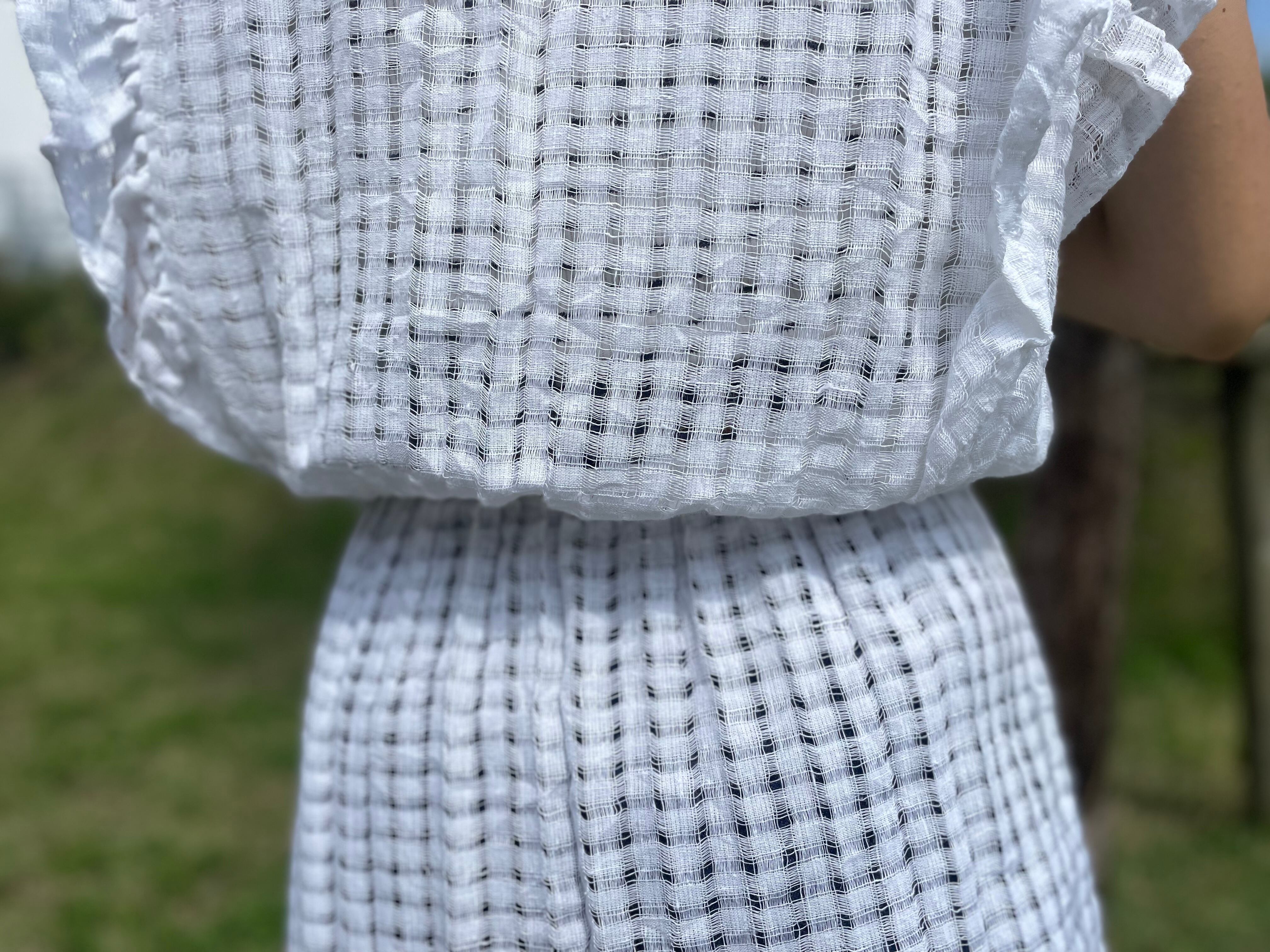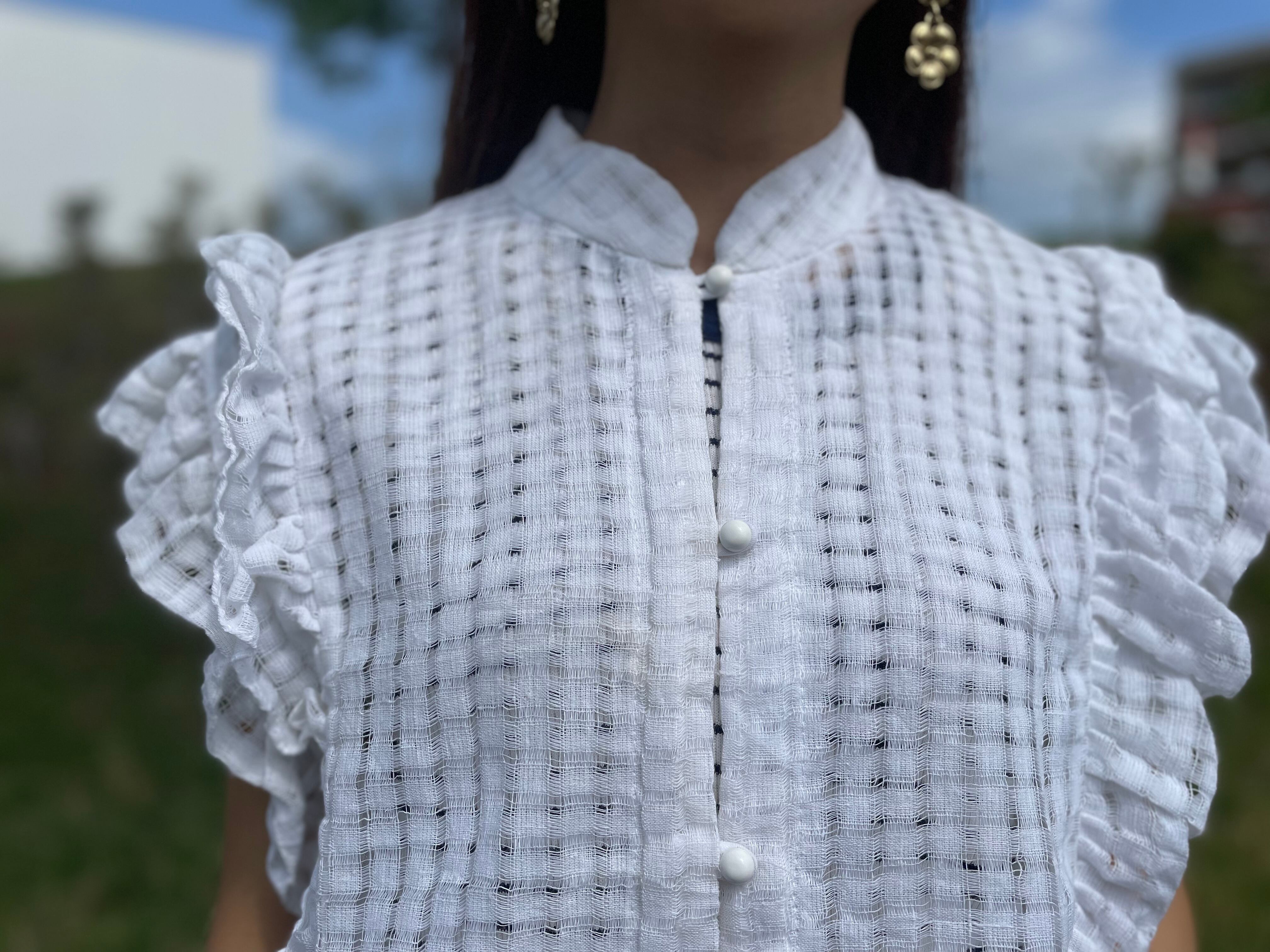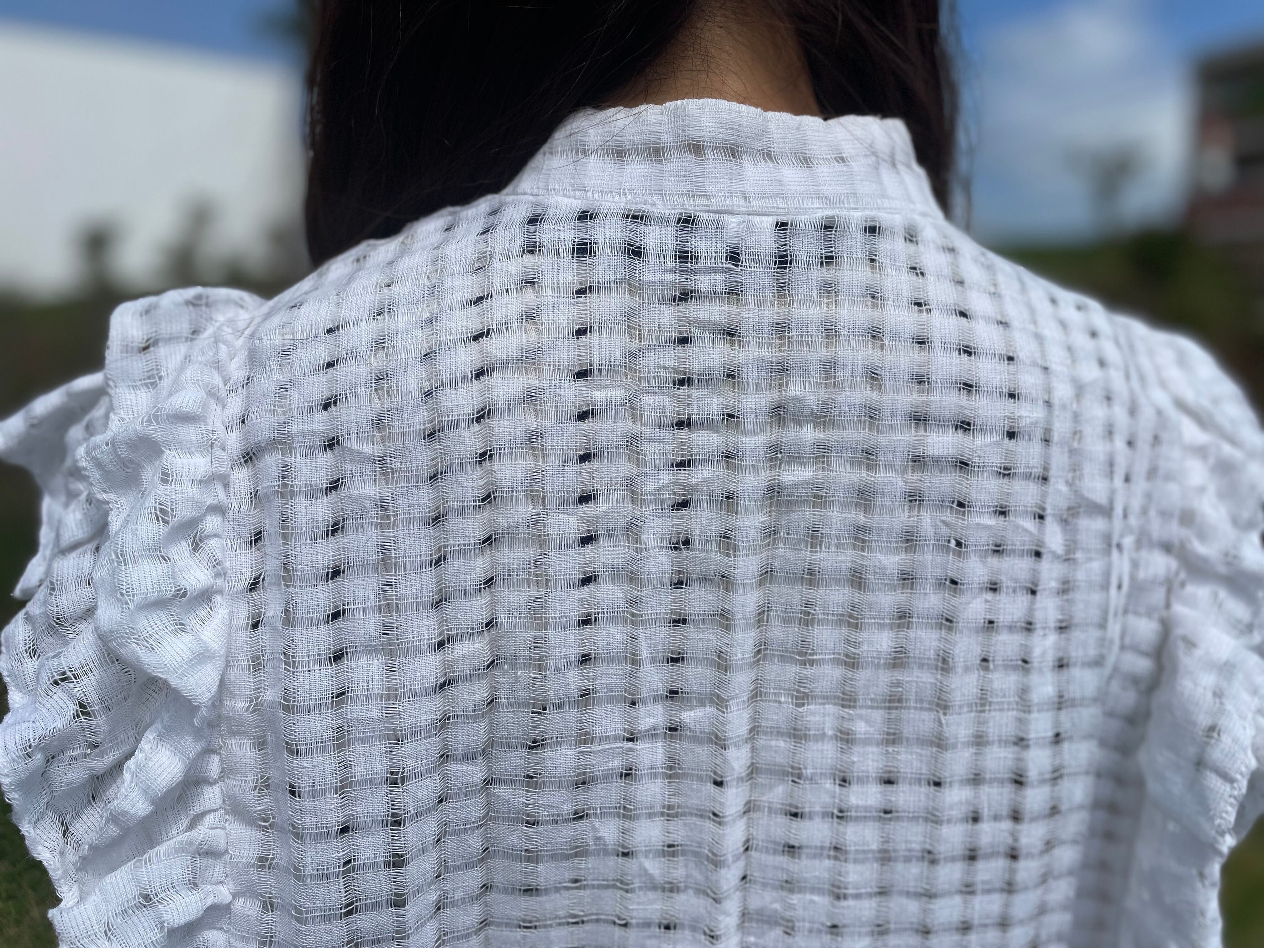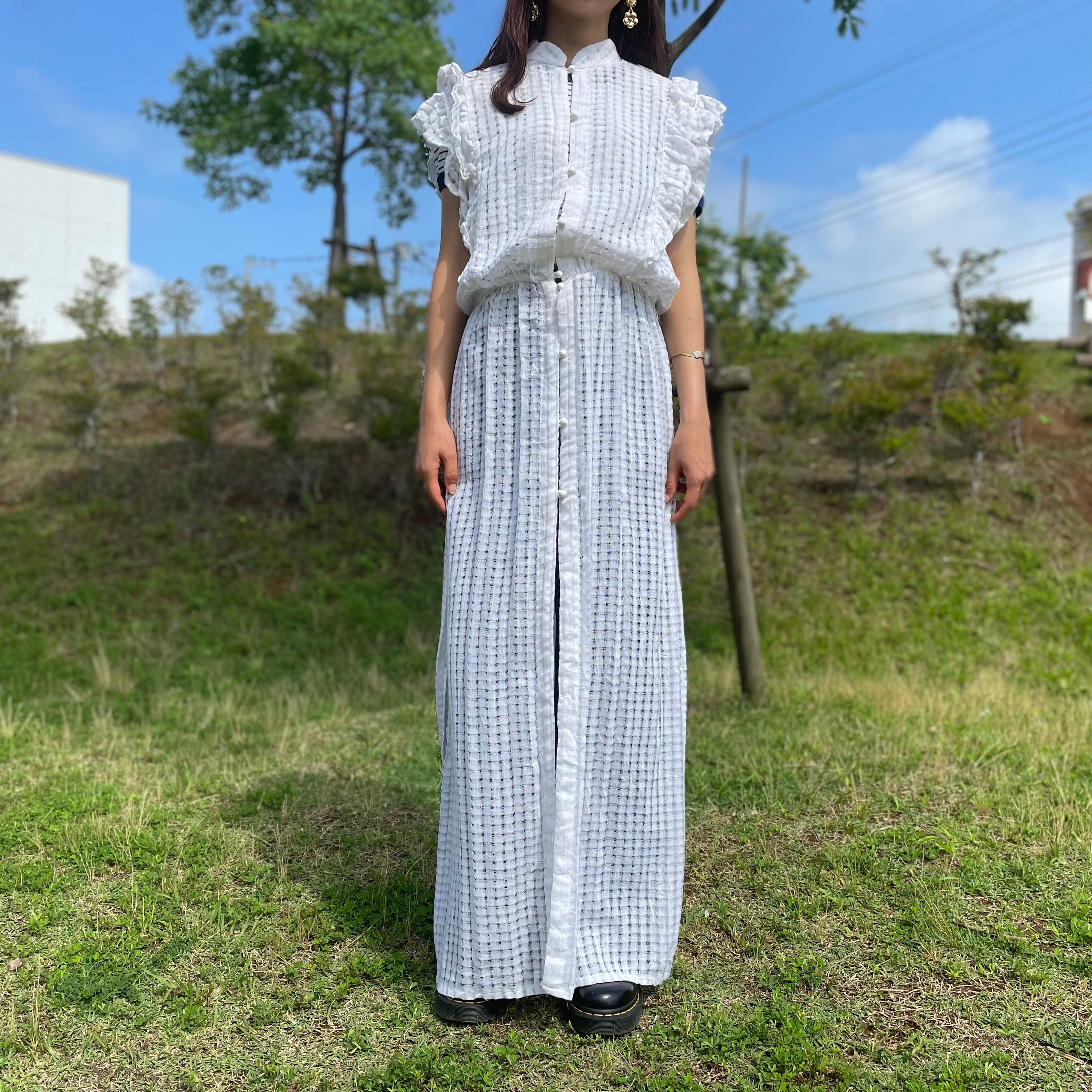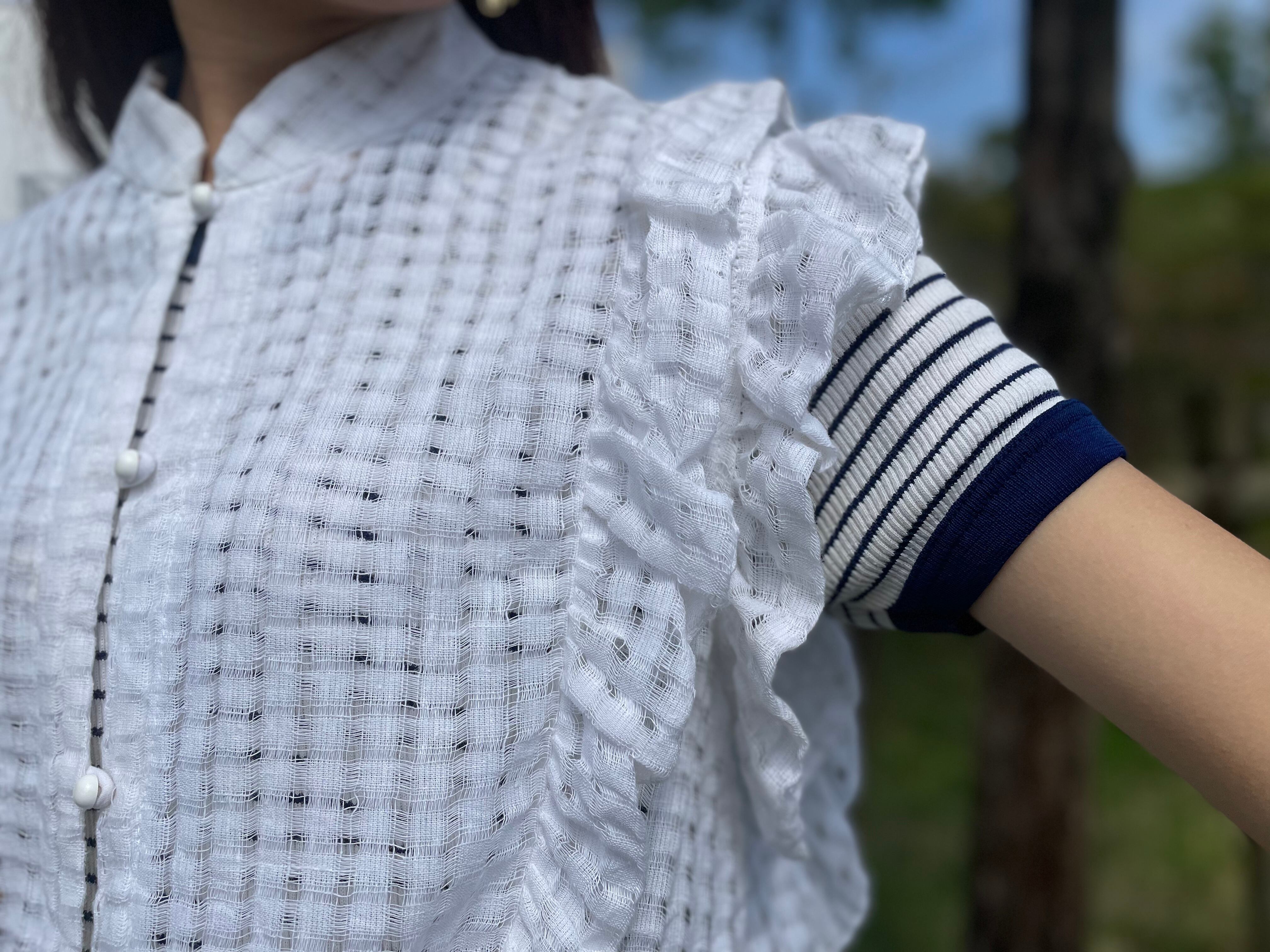 チェック模様の繊細な生地と、肩のフリルで洗練された雰囲気が感じられます。