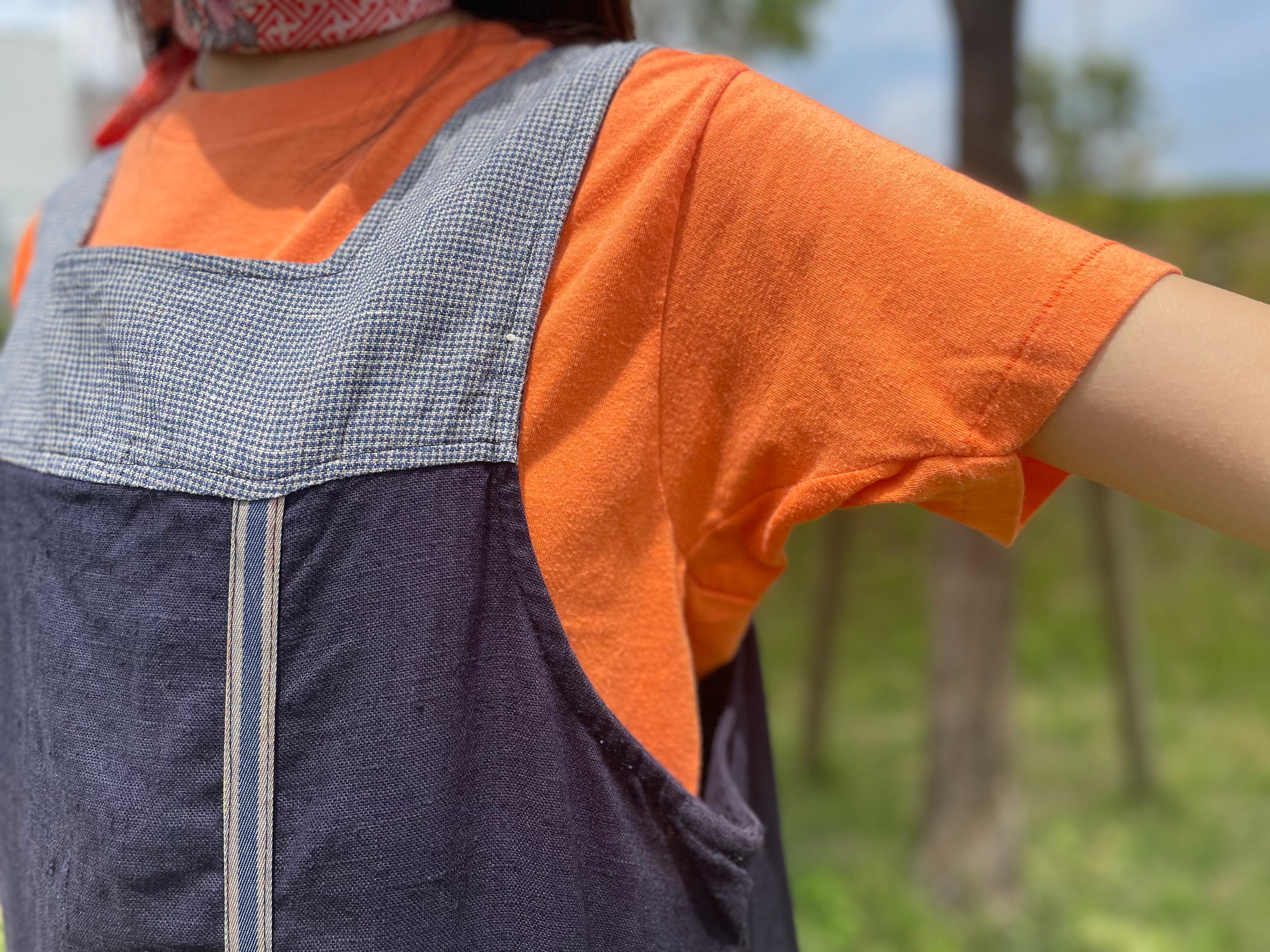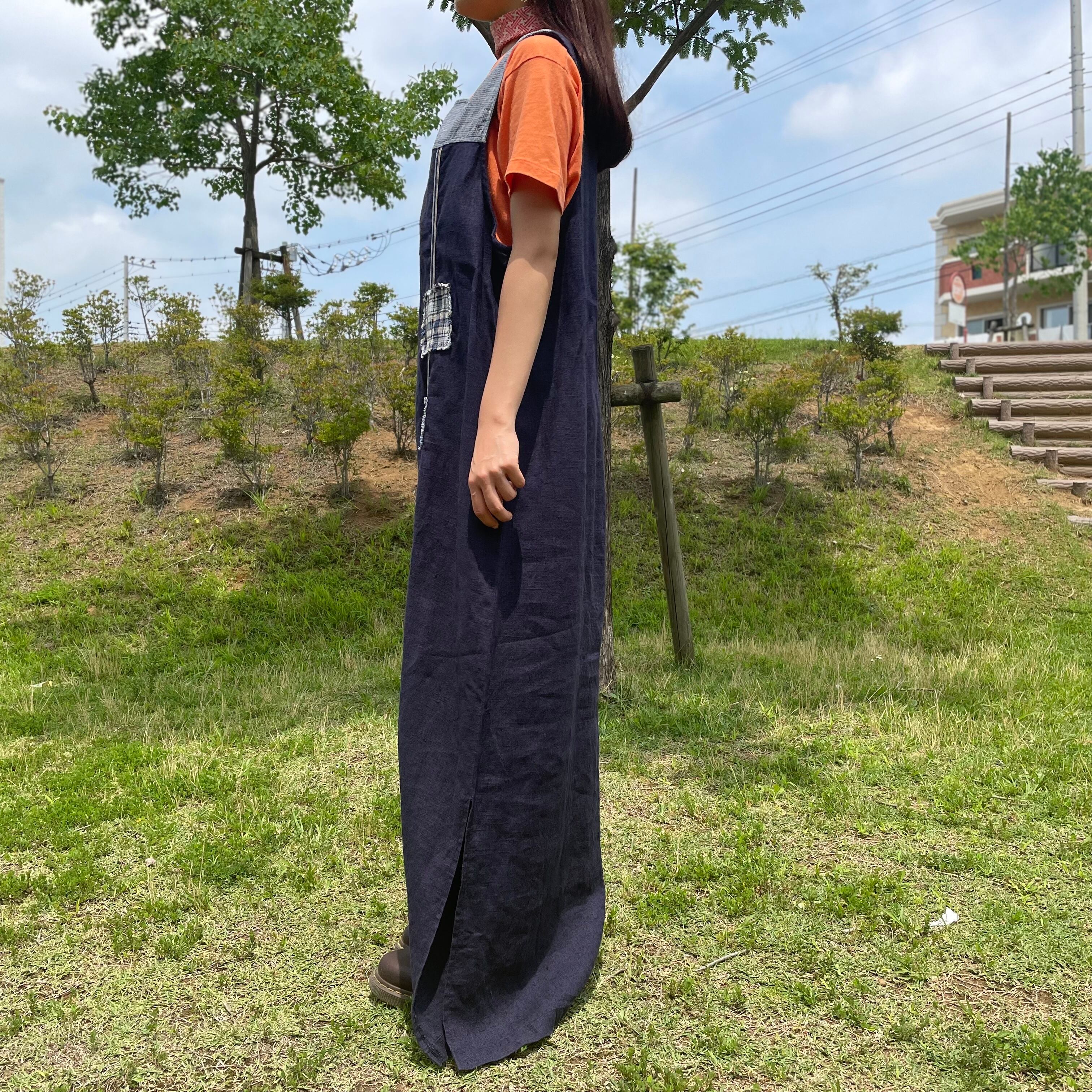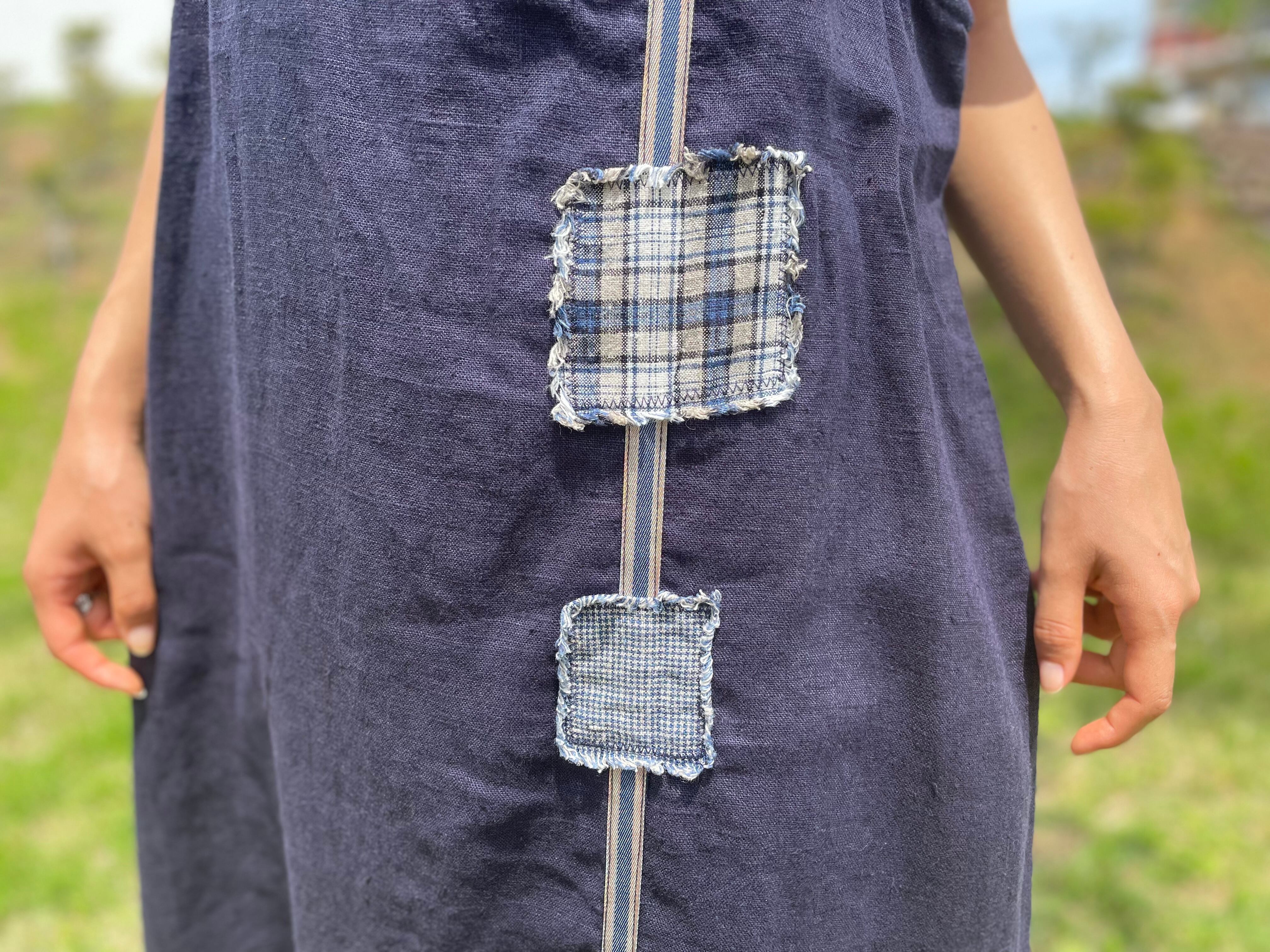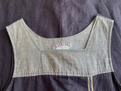 リネン素材でナチュラルな印象ながらも、肩の切り替えや、チェック柄の生地のコラージュなどデザイン製のある1着です。